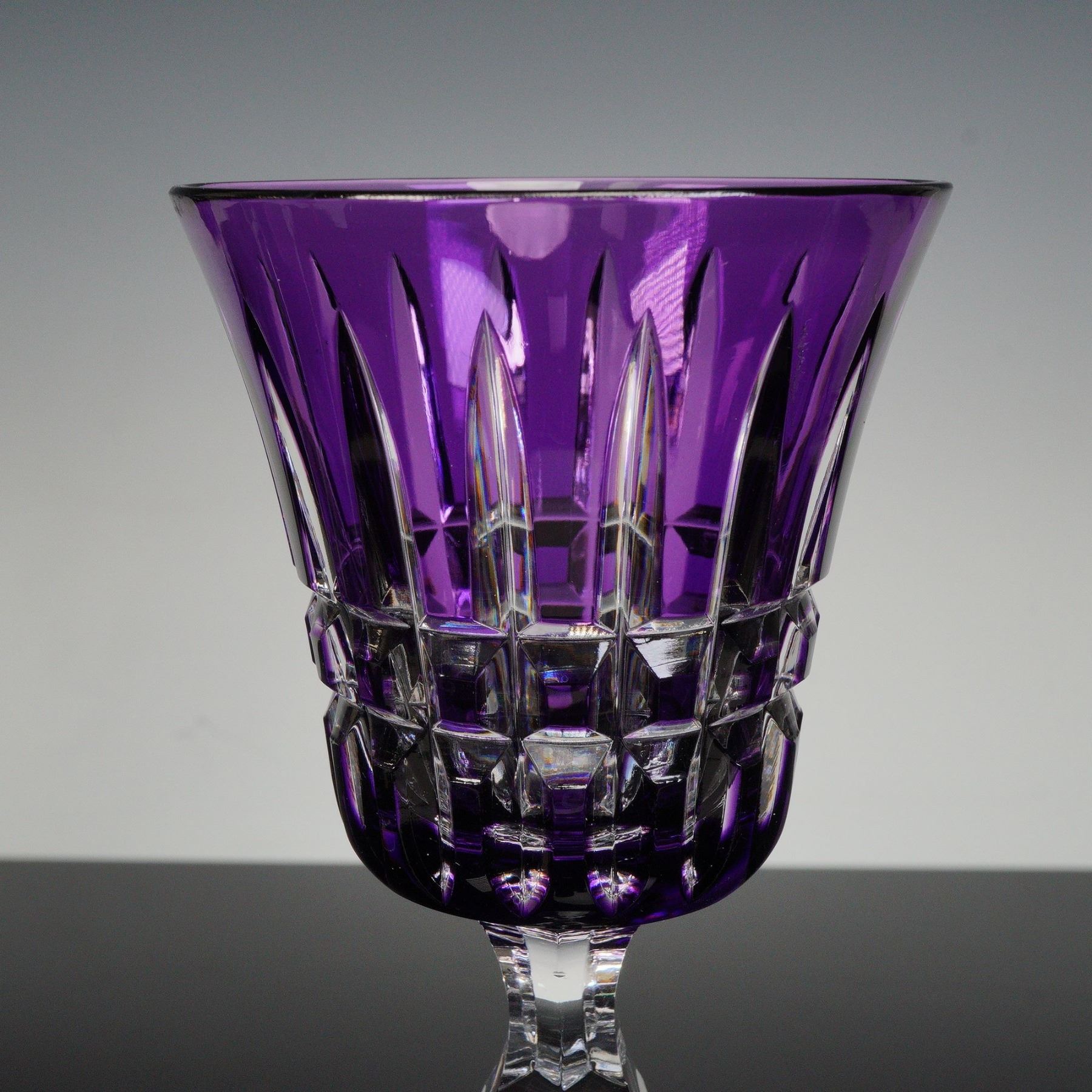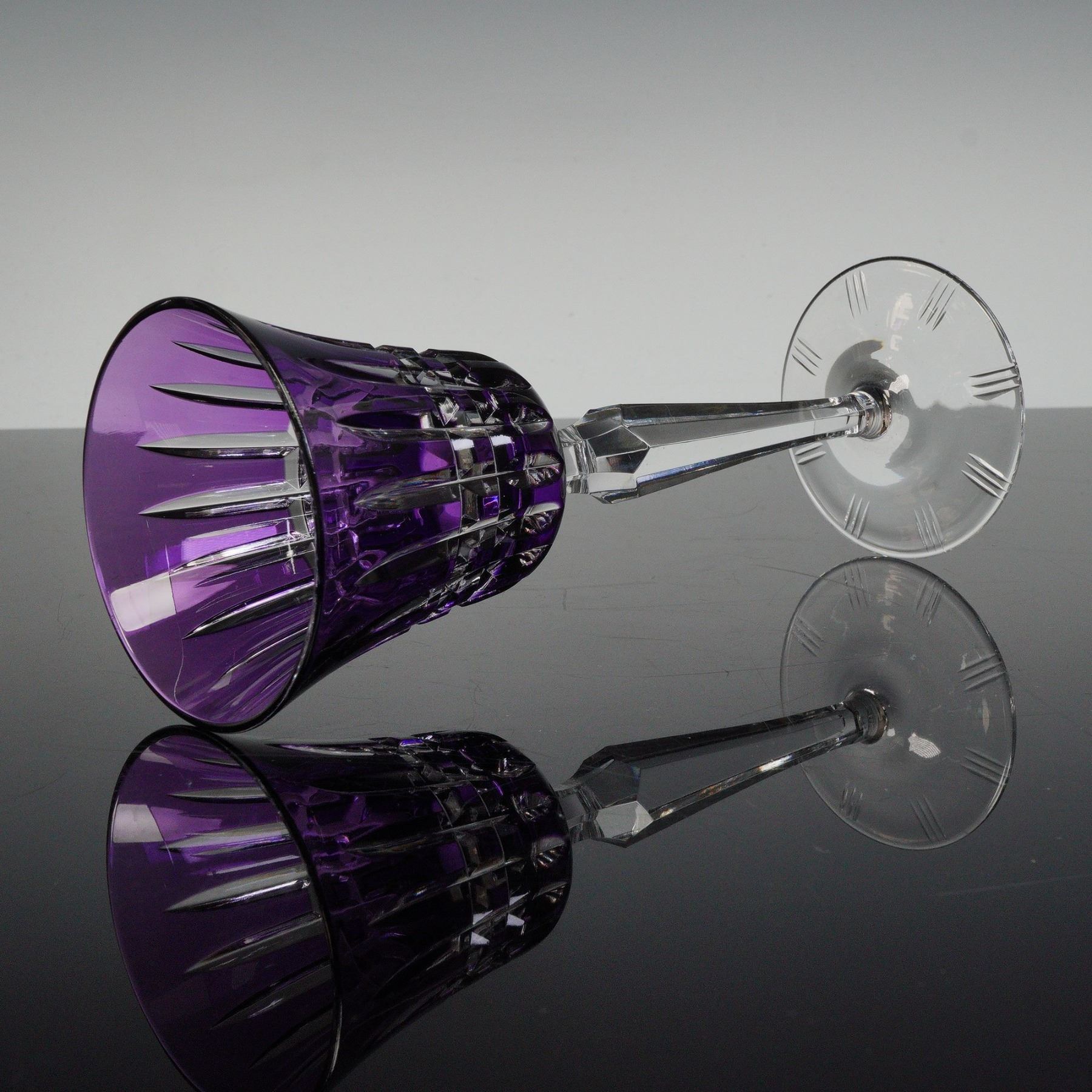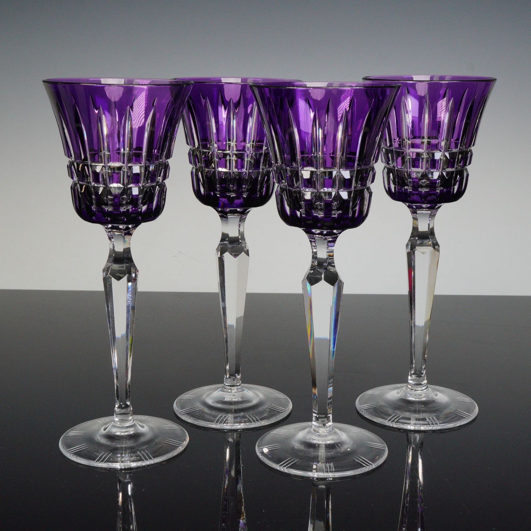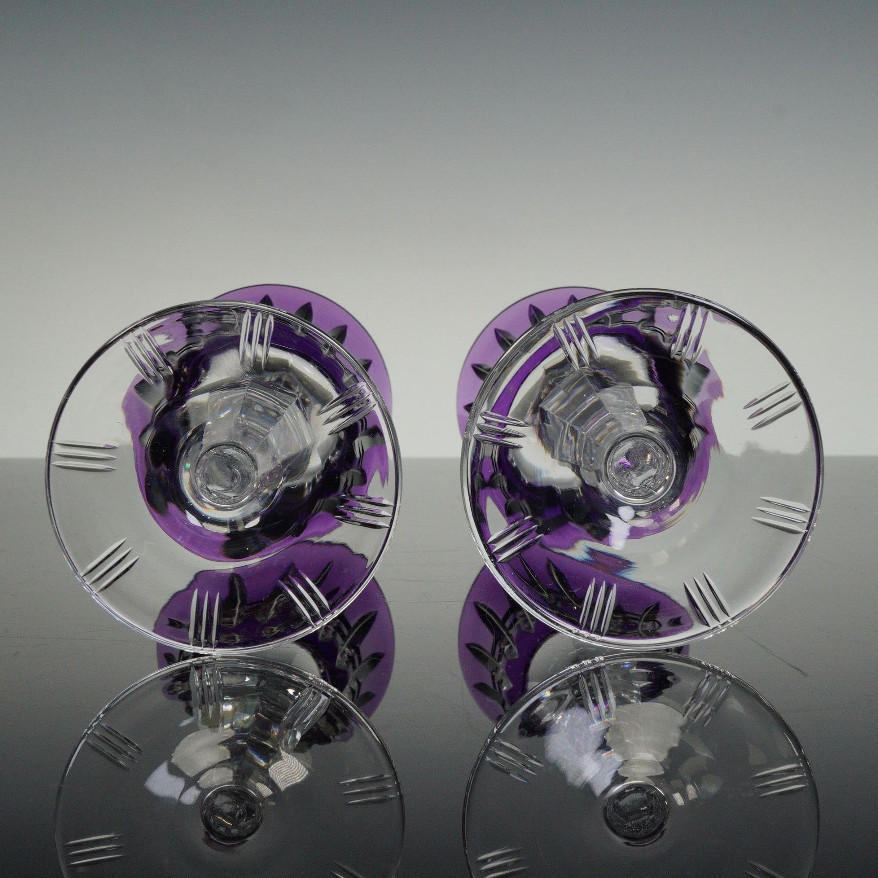 A fine set of four amethyst cut-to-clear crystal wine glasses. Each glass features a deeply cut geometric pattern extending from the clear base into the richly colored bowl, creating a striking play of light and color. The faceted stems are elegantly tapered, leading to wide, clear bases engraved with a radiating linear motif. These glasses display precise craftsmanship with crisp cuts and excellent clarity, demonstrating a balance of color and transparency. A refined example of 20th-century glassmaking, ideal for display or use.