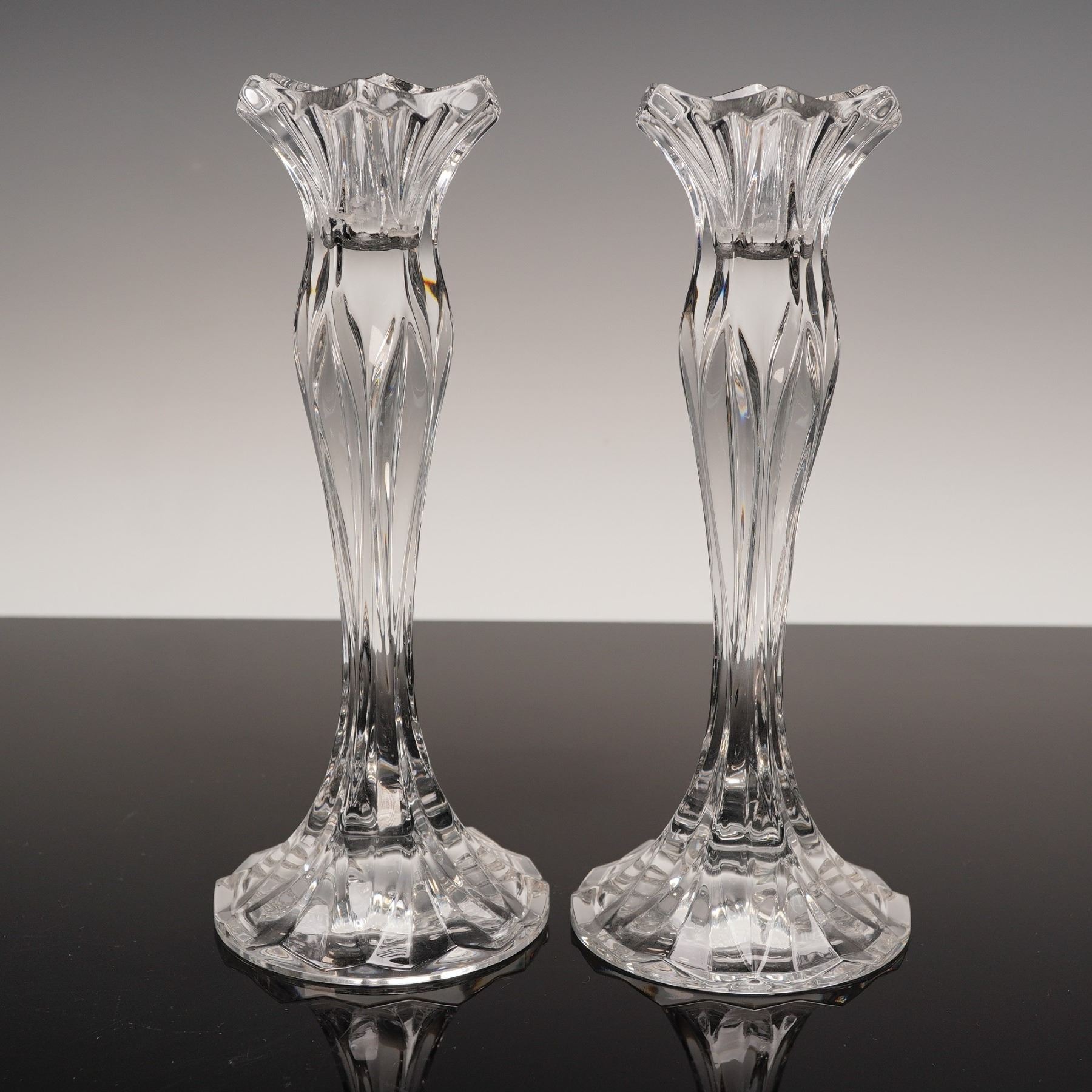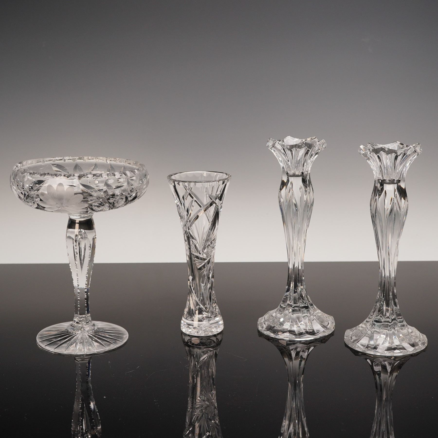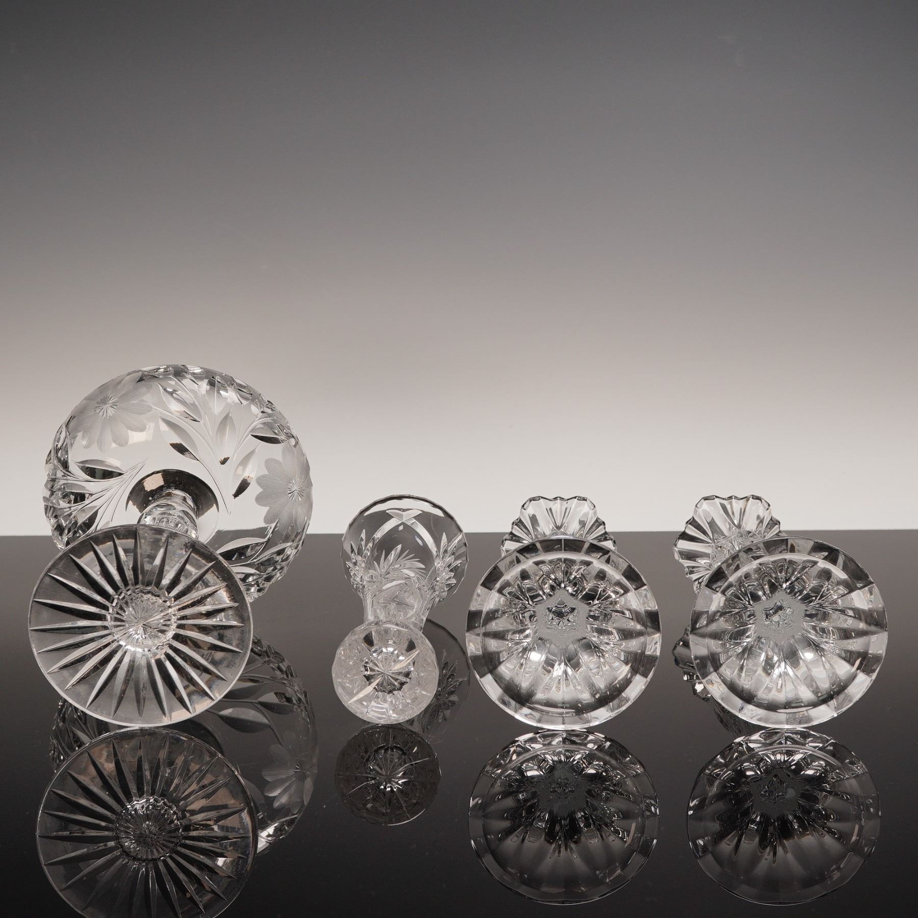 Group of four cut glass table pieces including a floral-engraved compote, a faceted bud vase, and a matched pair of candleholders. Each piece features a pedestal base with brilliant cut detailing. The compote displays etched daisy-style blooms and a starburst foot, while the vase has crosshatch and fan motifs. The candleholders have fluted columns with petal-like rims and matching pinwheel-cut bases. Tallest piece measures 8.75"'H.