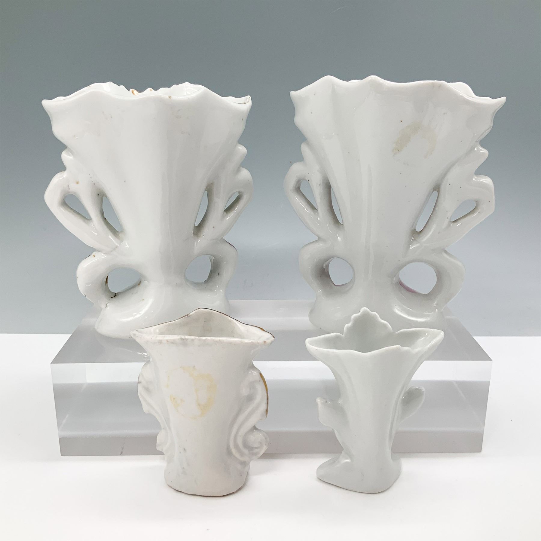 A charming 4-piece porcelain spill vase set featuring hand-painted floral motifs with gilt accents. The pair of larger vases showcase an ornate pierced design, one with blue and pink panels and the other with pink and white, both embellished with delicate rose patterns. The two smaller vases complement the set with intricate relief detailing and gold highlights. Tallest item: 4.75"H.