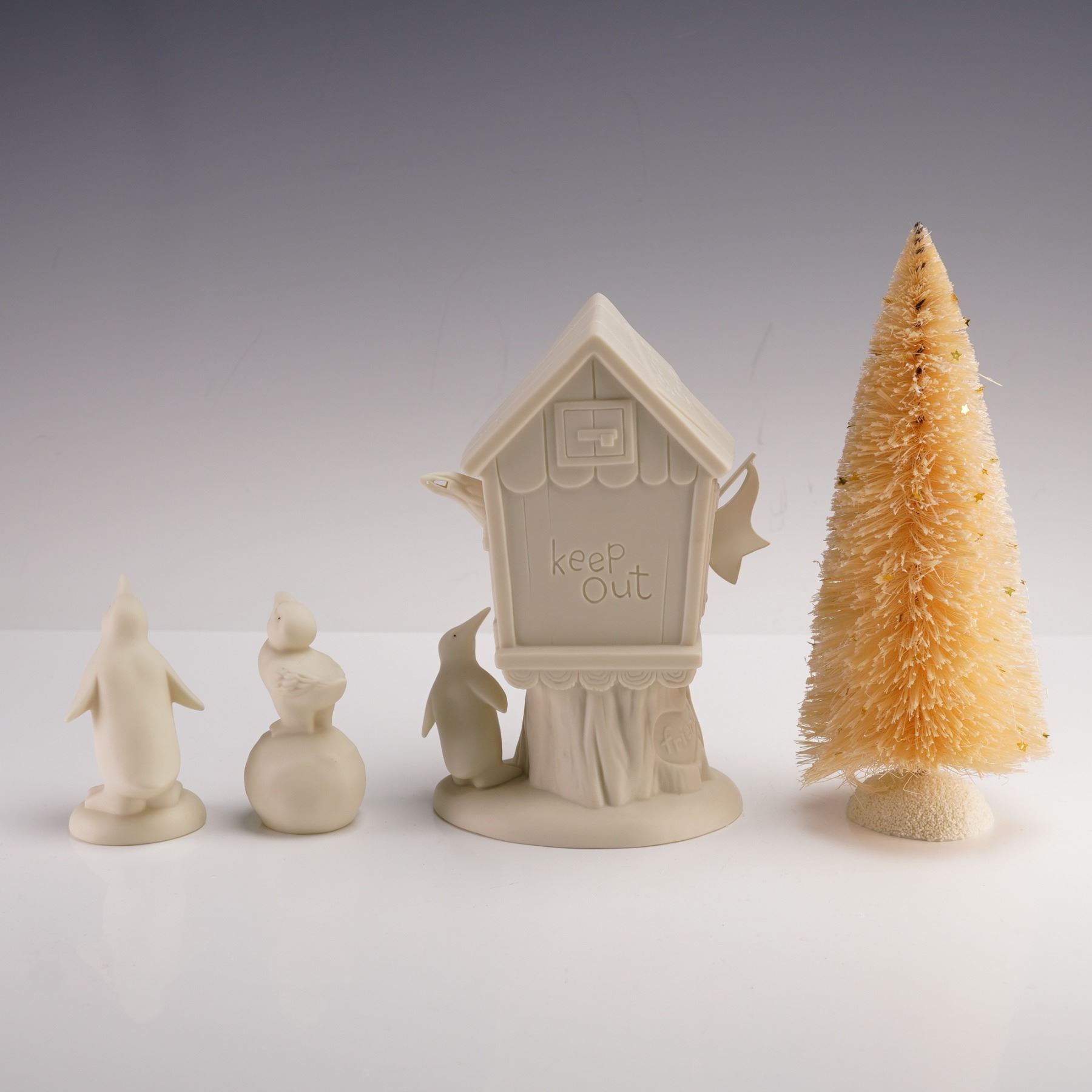 This group of Department 56 Snowbabies pieces includes Friendship Clubhouse, Jolly Friend Forevermore, and two small penguin and puffin figures. Friendship Clubhouse features two Snowbabies perched on a detailed treehouse labeled Members Only, with penguins at the base and a waving flag. Jolly Friend Forevermore comes with a tall cream colored Christmas tree with a soft bristled texture. The penguin and puffin figures complete the set with smooth matte finishes and simple rounded forms that add to the wintry charm. Department 56 backstamp.