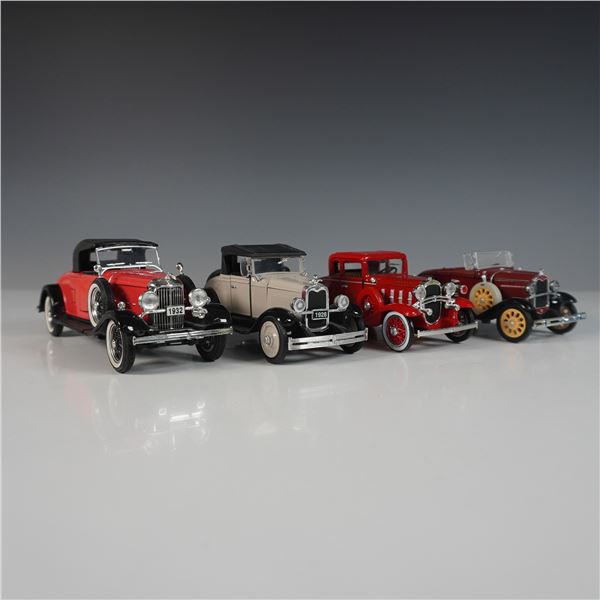 A collection of four diecast vintage car models, each meticulously crafted with fine details and chrome accents. The set includes classic automobile replicas from the early 20th century, featuring models with distinctive grilles, fender-mounted spare tires, and realistic interiors. The cars are finished in red, beige, and black tones, with period-correct details such as spoked wheels, windshield frames, and vintage license plates. Underside markings indicate manufacturer details and country of origin. These diecast models capture the elegance of early automobile designs and are a perfect addition for collectors or enthusiasts of vintage cars. Largest item measures 7"L.
