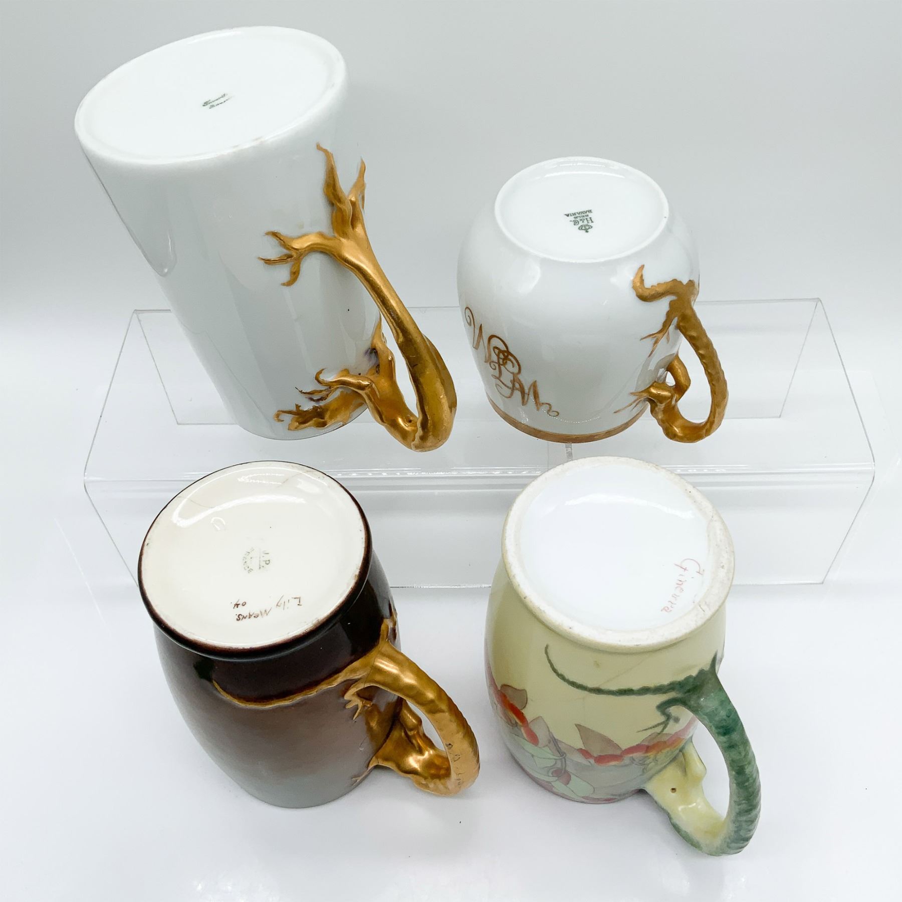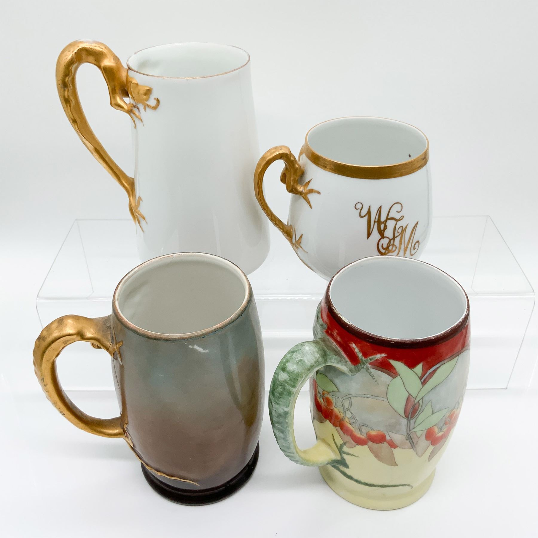 This collection features four dragon-handled porcelain mugs and a pitcher, each with intricate designs and detailed craftsmanship. Included are a tall white pitcher with a gold dragon handle, measuring 6.25 inches high, a white mug with a gold dragon handle and monogram, a handpainted mug with a multicolored dragon handle and floral motif, and a brown-toned mug with a gold dragon handle. Backstamps include Favorite Bavaria, Ginevra, JP L France, and H&Co Selb Bavaria. A unique set for collectors of porcelain or dragon-themed decor.