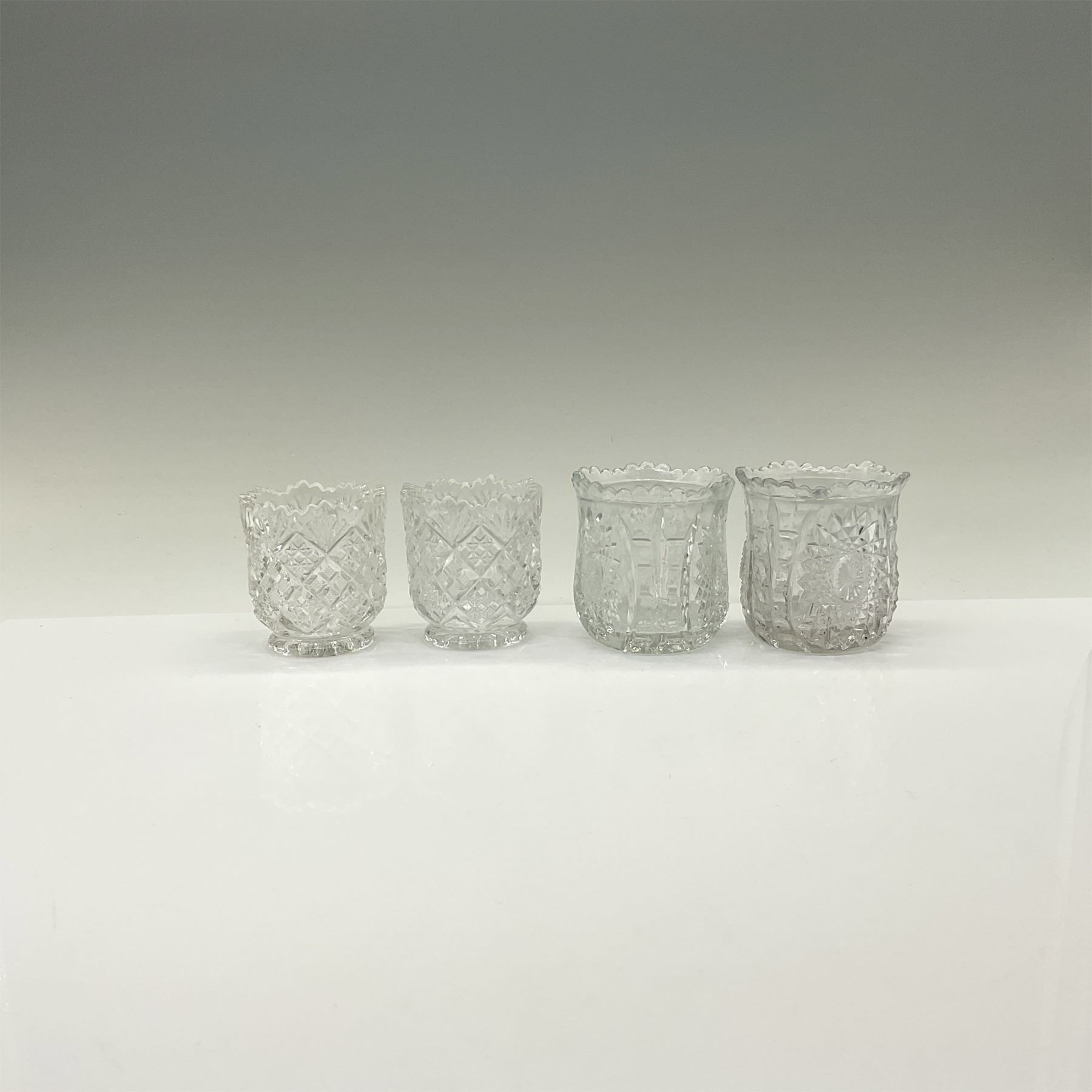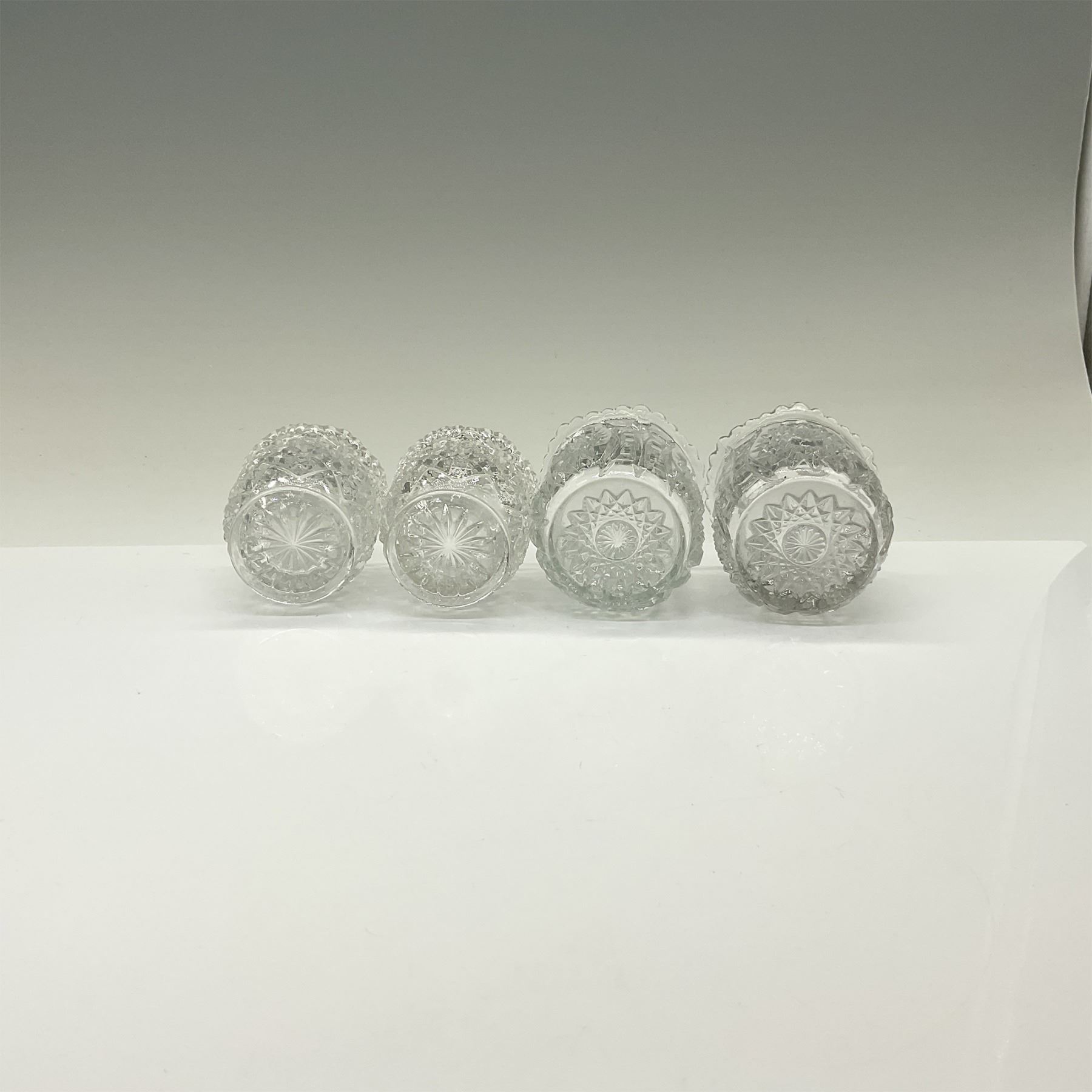 This grouping includes two matching sets one with oval starts and the other with diamond patterns. The largest piece measures 2.5"H x 2.25" dia.