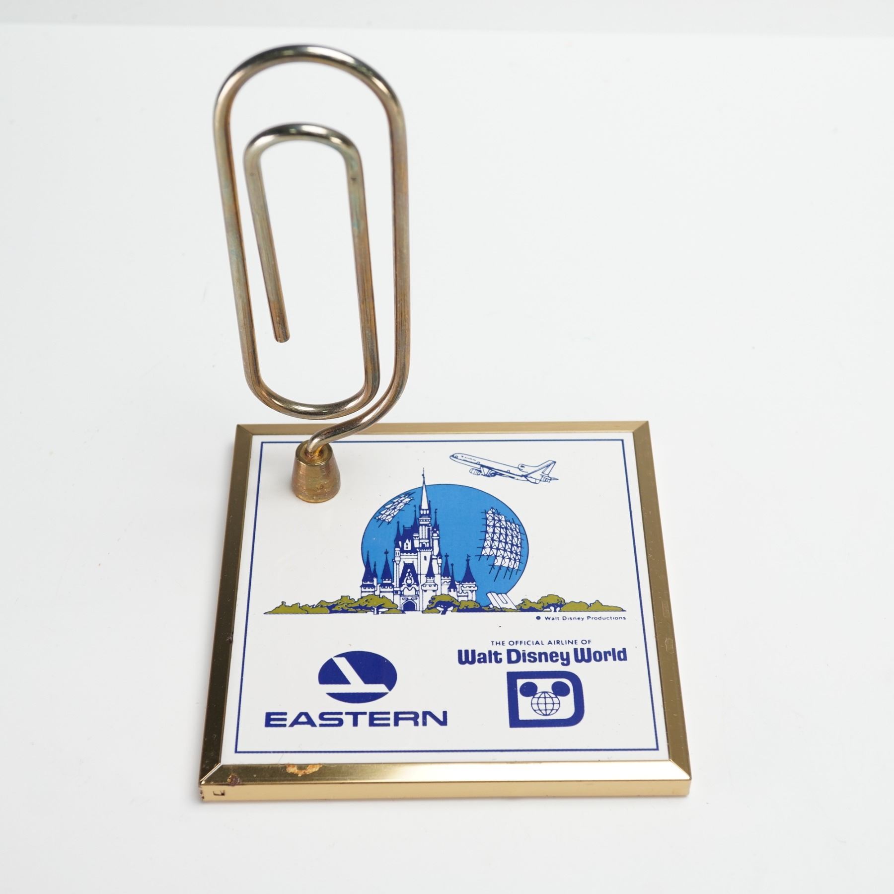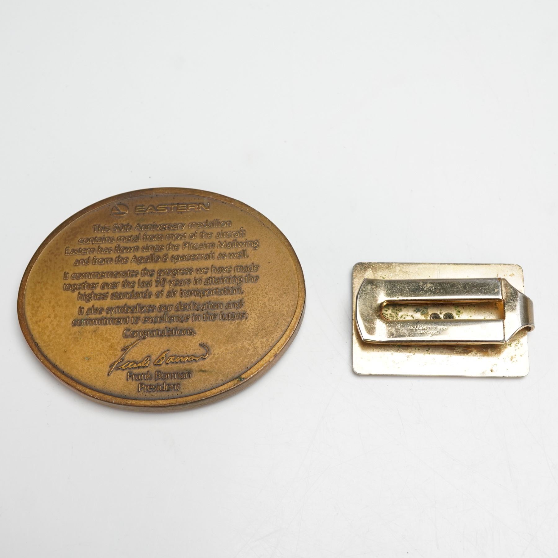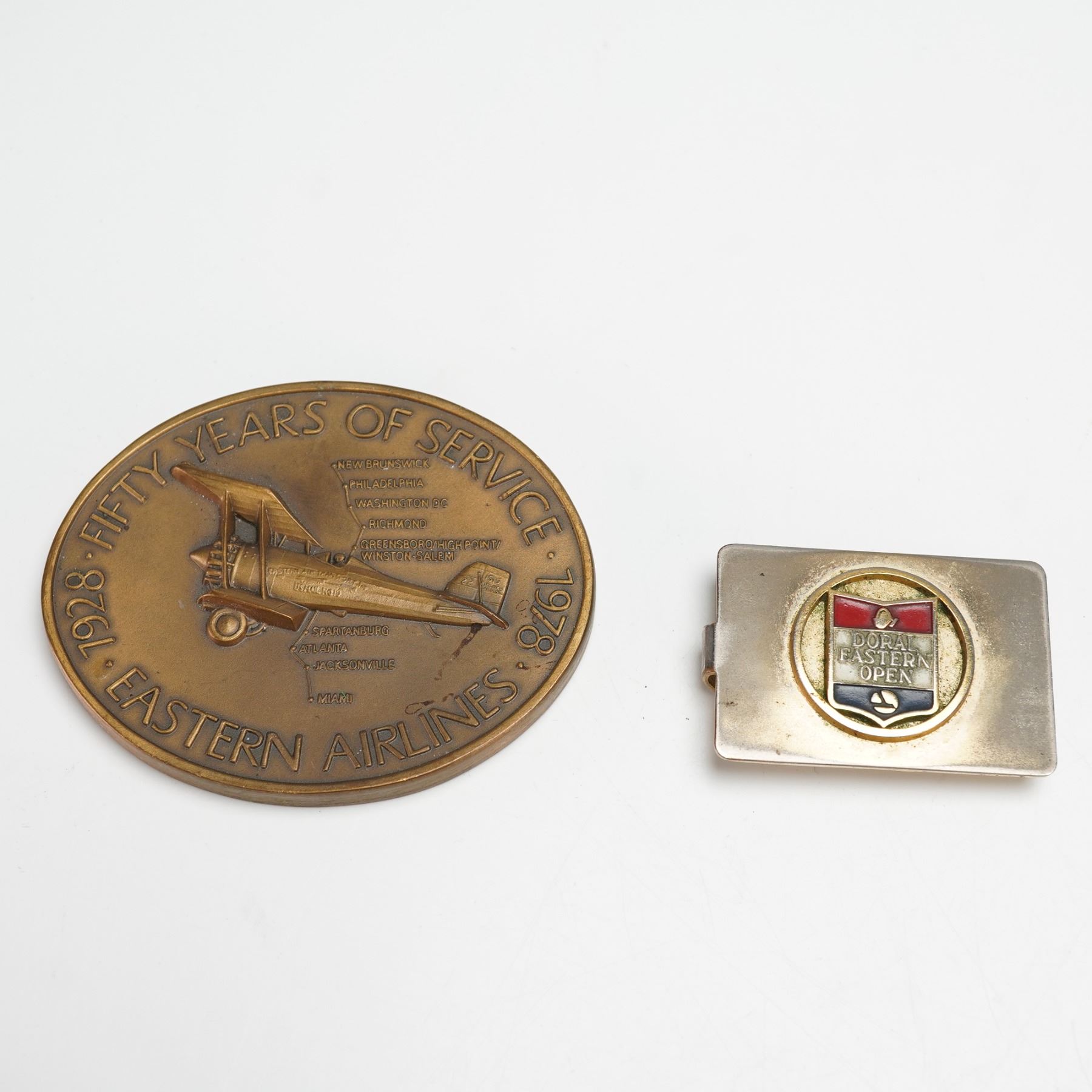 Group of aviation collectibles including an Eastern Airlines 50th Anniversary bronze medallion, Doral Eastern Open money clip, and Walt Disney World desk clip plaque marking Eastern's role as the official airline. Also includes a Pan Am model airplane. A nostalgic collection celebrating two iconic names from the golden age of air travel.