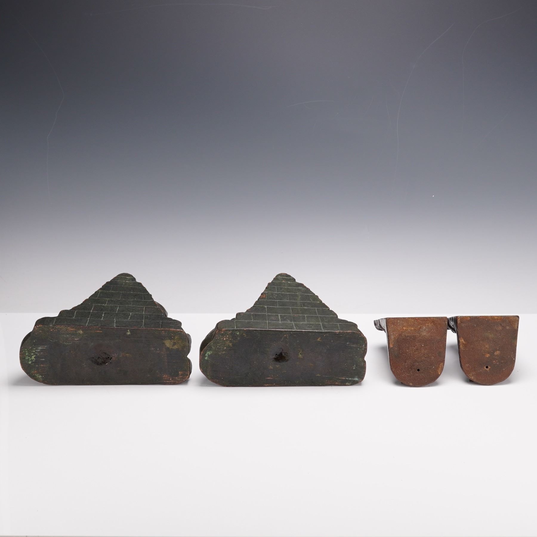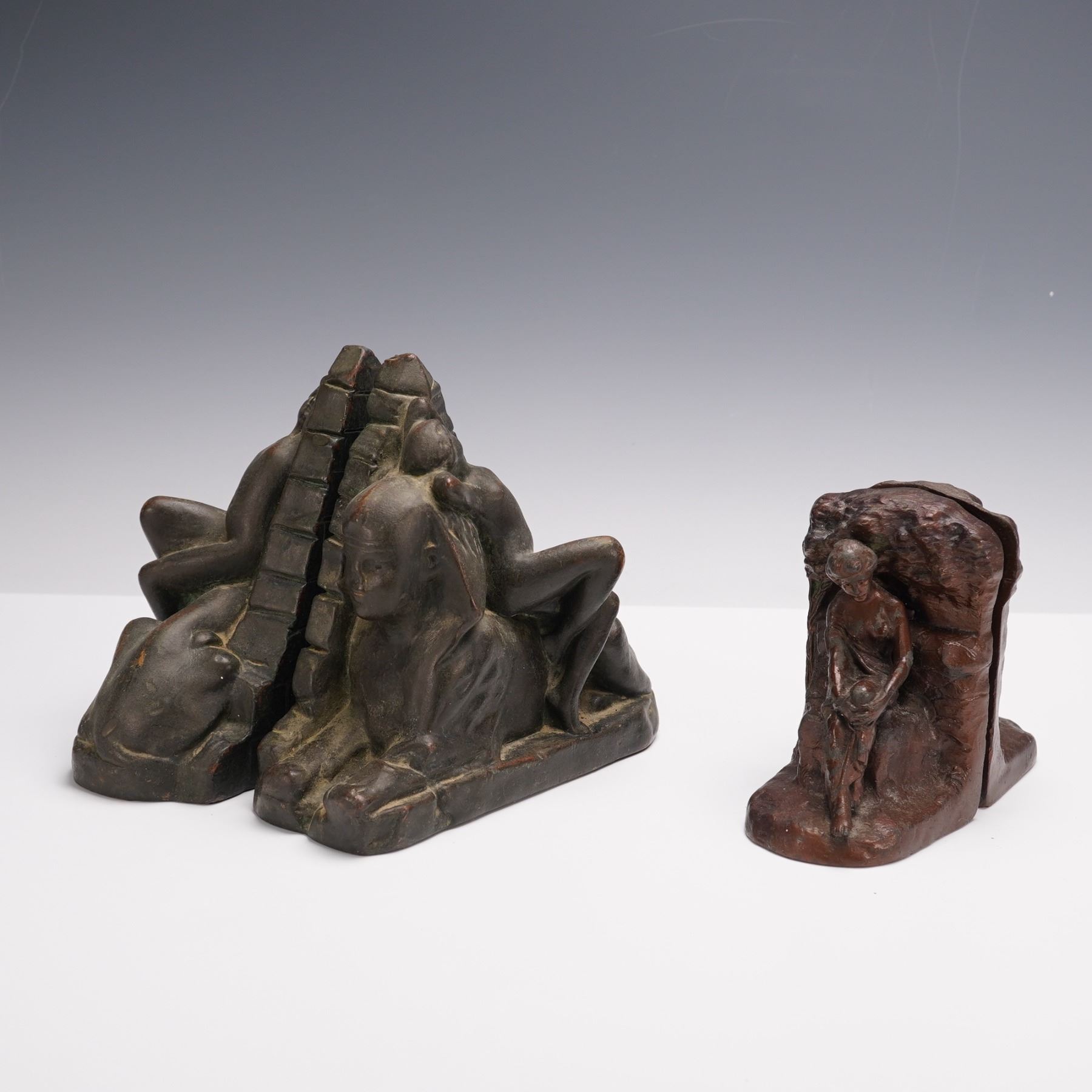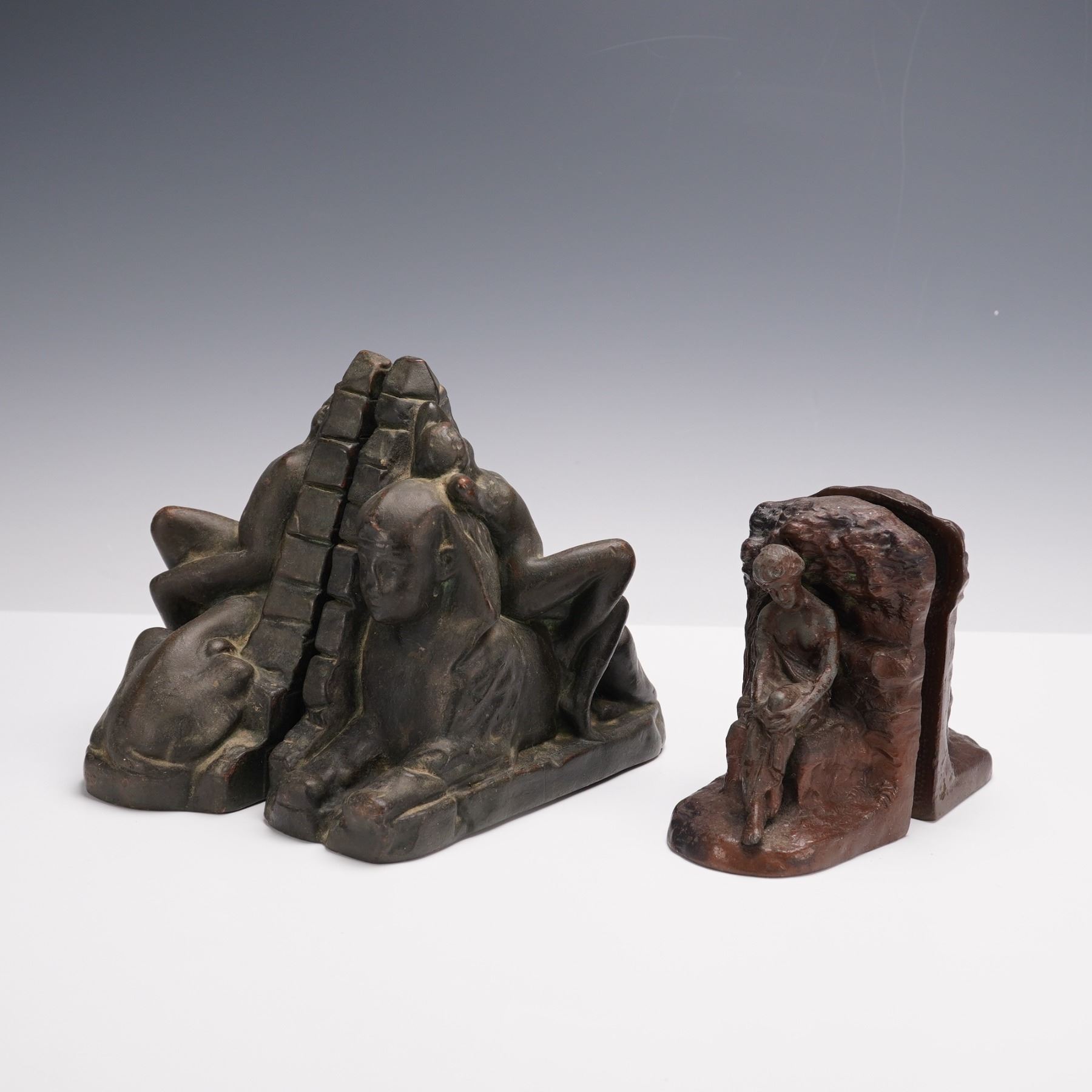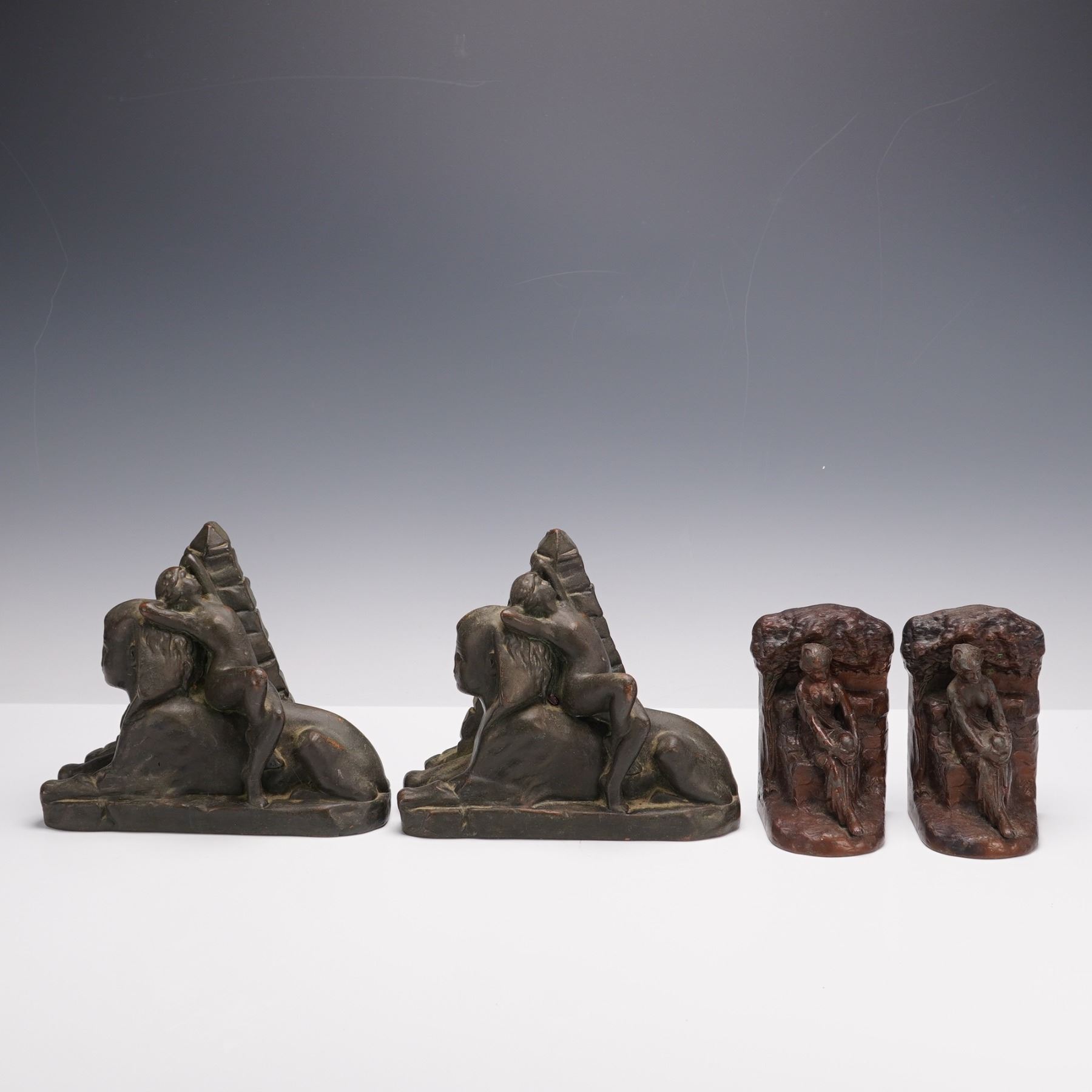 A group of two pairs of cast metal figural bookends, four pieces total. One pair in the Egyptian Revival style depicts a reclining nude figure draped across the back of a sphinx with a pyramid rising behind, finished in a dark patina. The other pair portrays a seated classical female figure set within a rocky niche, shown in relief with a bronze-brown finish. Both pairs combine decorative presence with substantial form, making them suitable for use or display.