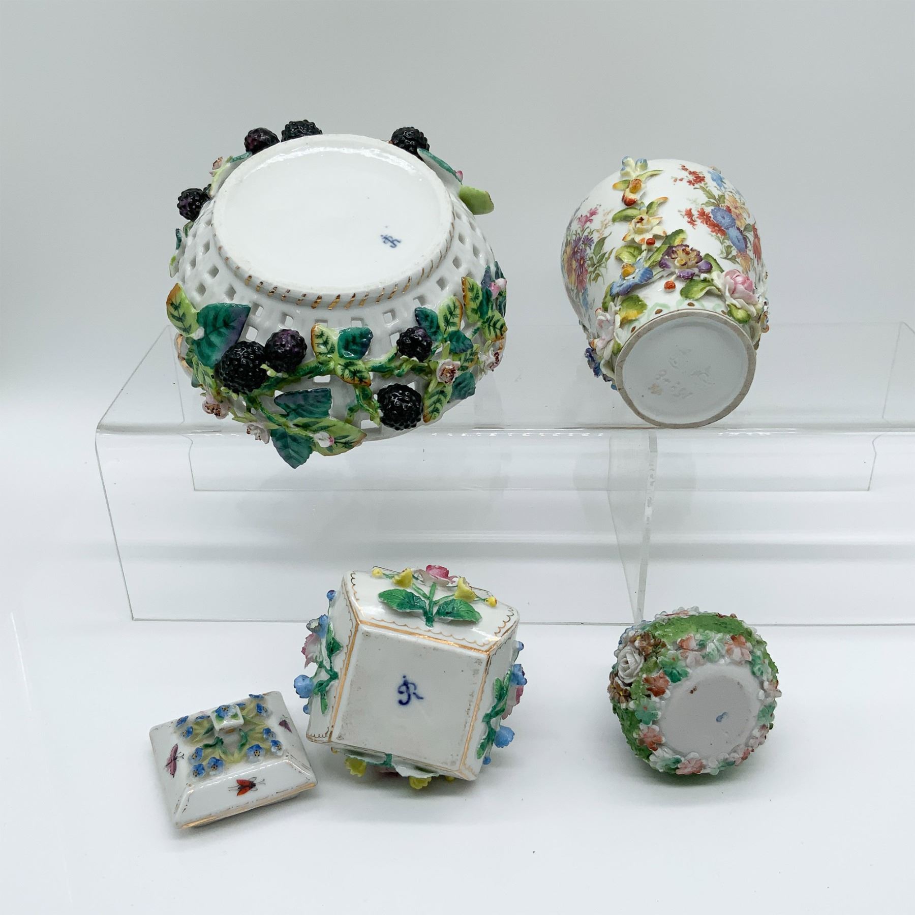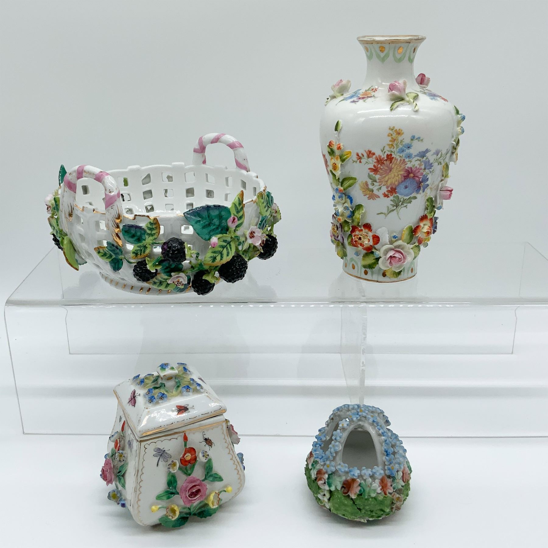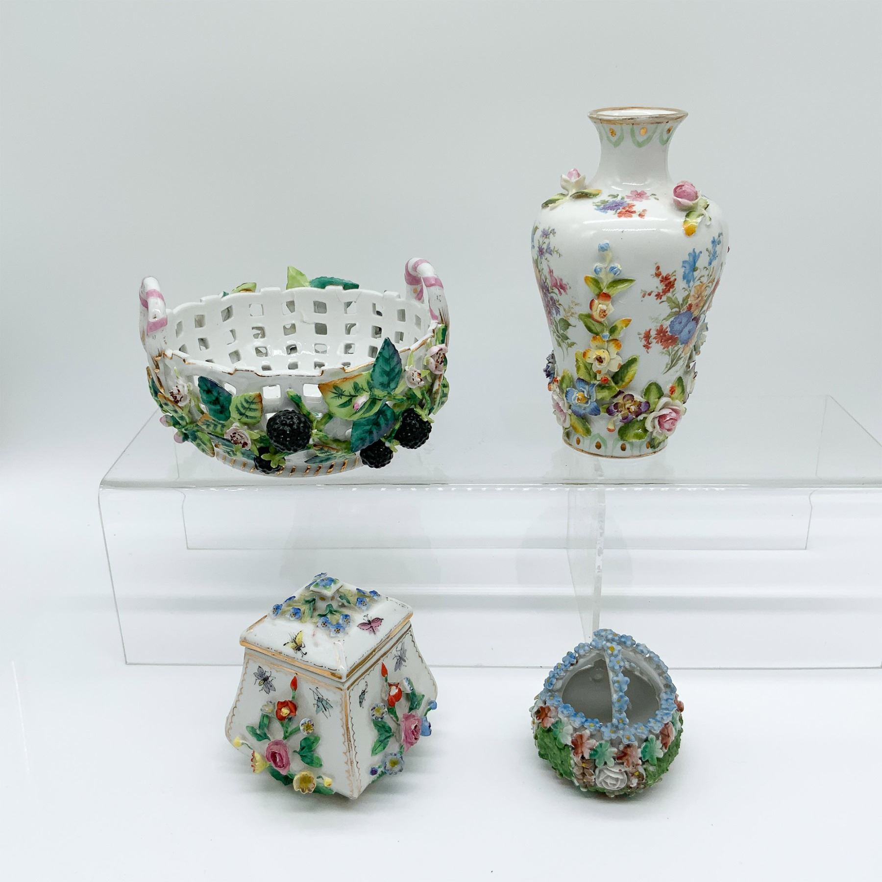 A stunning collection of porcelain decorative pieces, including Elfinware and Augustus Rex items. The lot features a pierced design basket with pink-and-white striped handles and a lidded square container, both marked Augustus Rex, showcasing intricate floral encrustations and refined handpainted details. Also included are a floral vase and a small decorative basket, both adorned with delicate applied flowers and vibrant designs. The Augustus Rex pieces are exceptional examples of fine porcelain craftsmanship. The tallest piece in this lot measures 5.75”H, with visible base markings on multiple items.