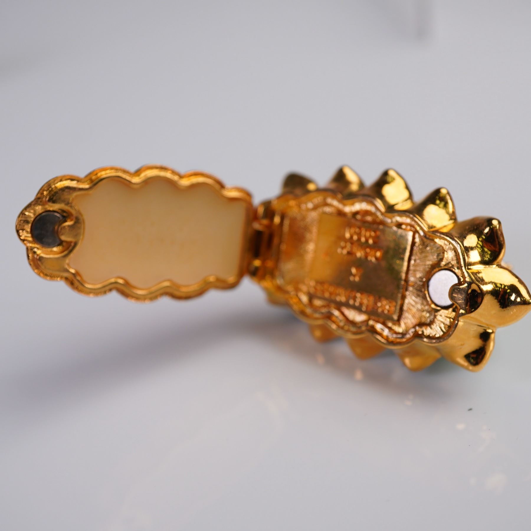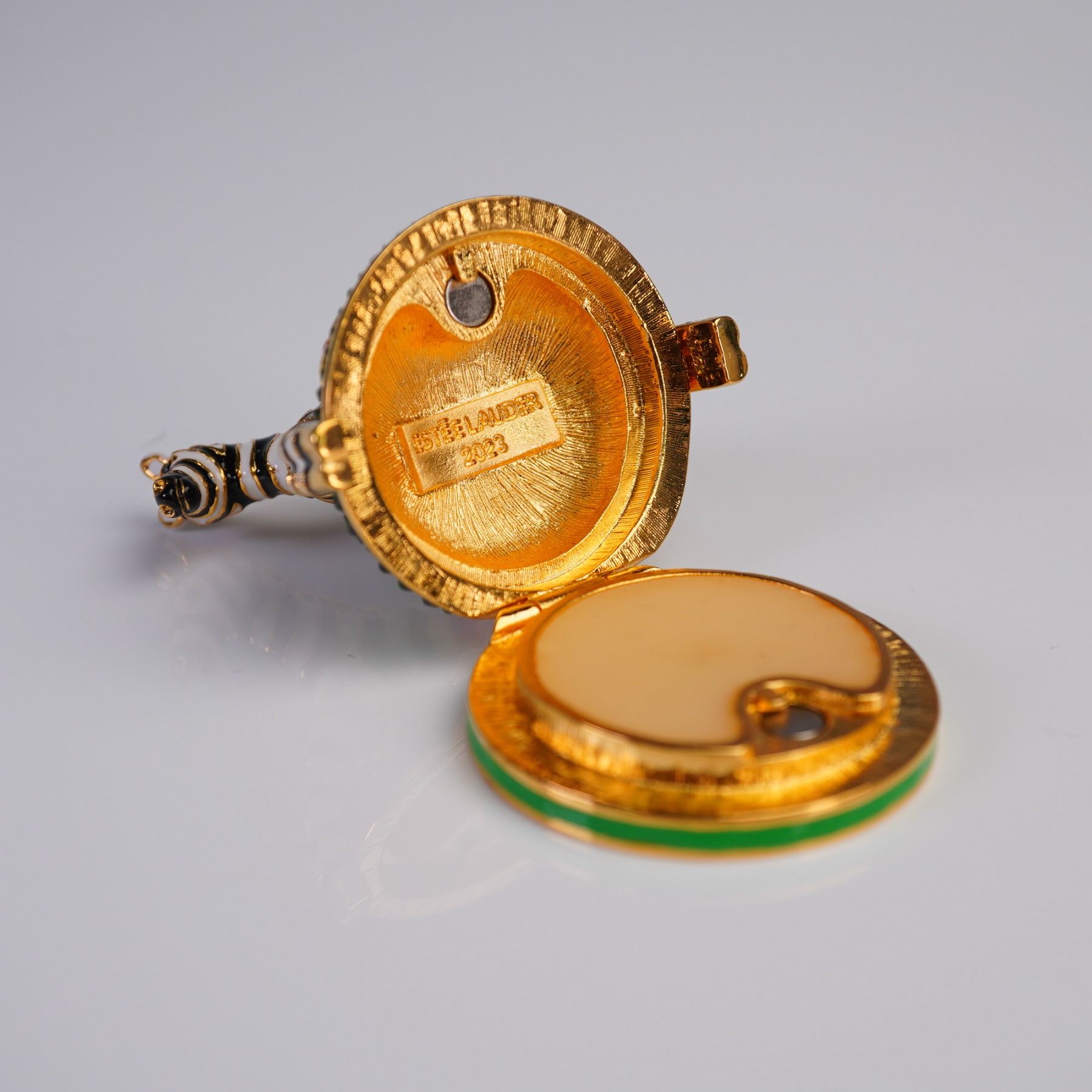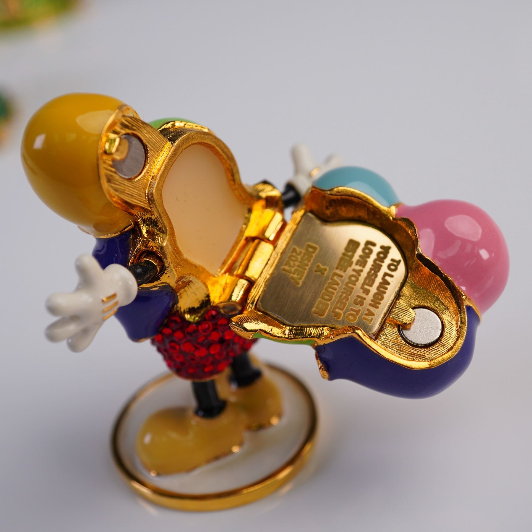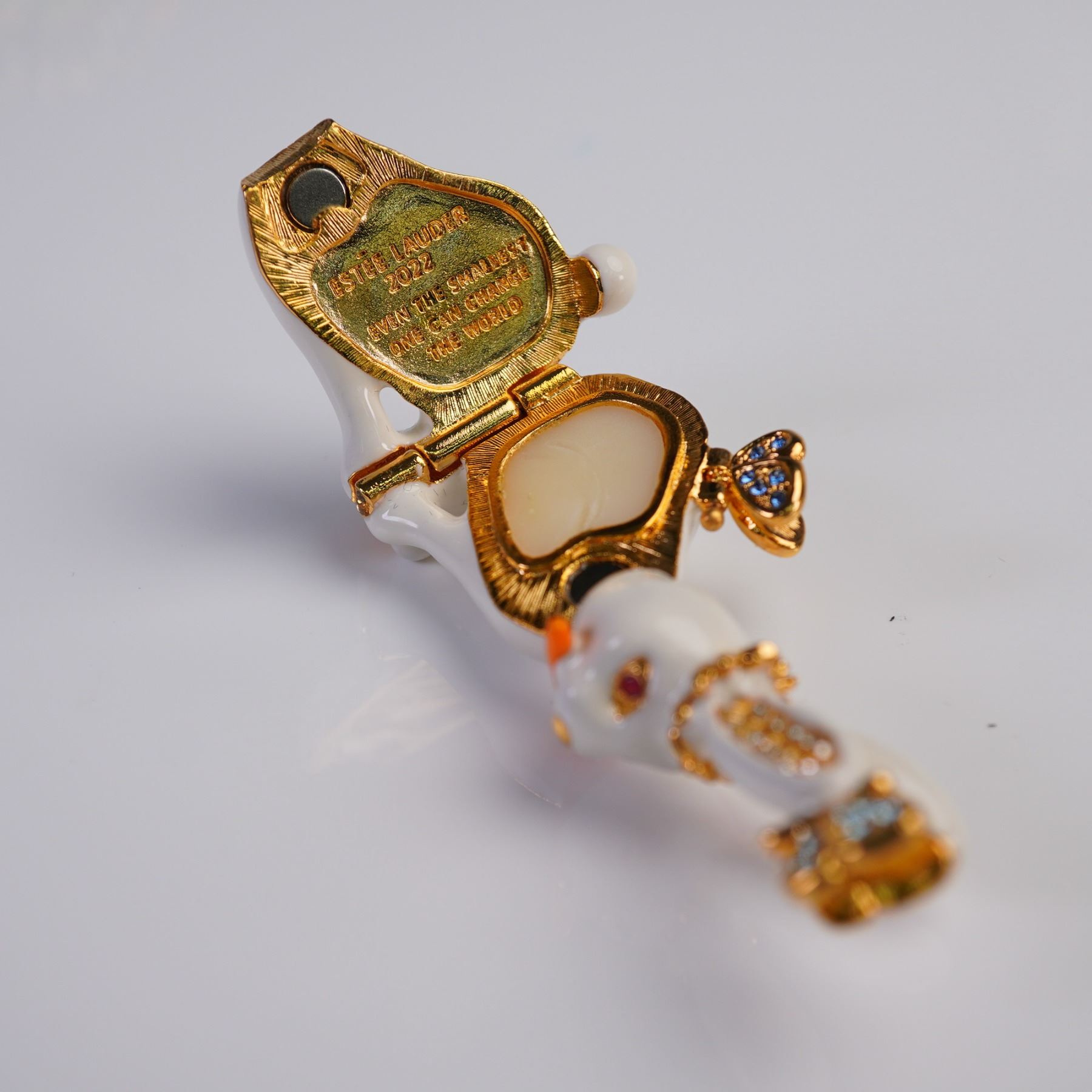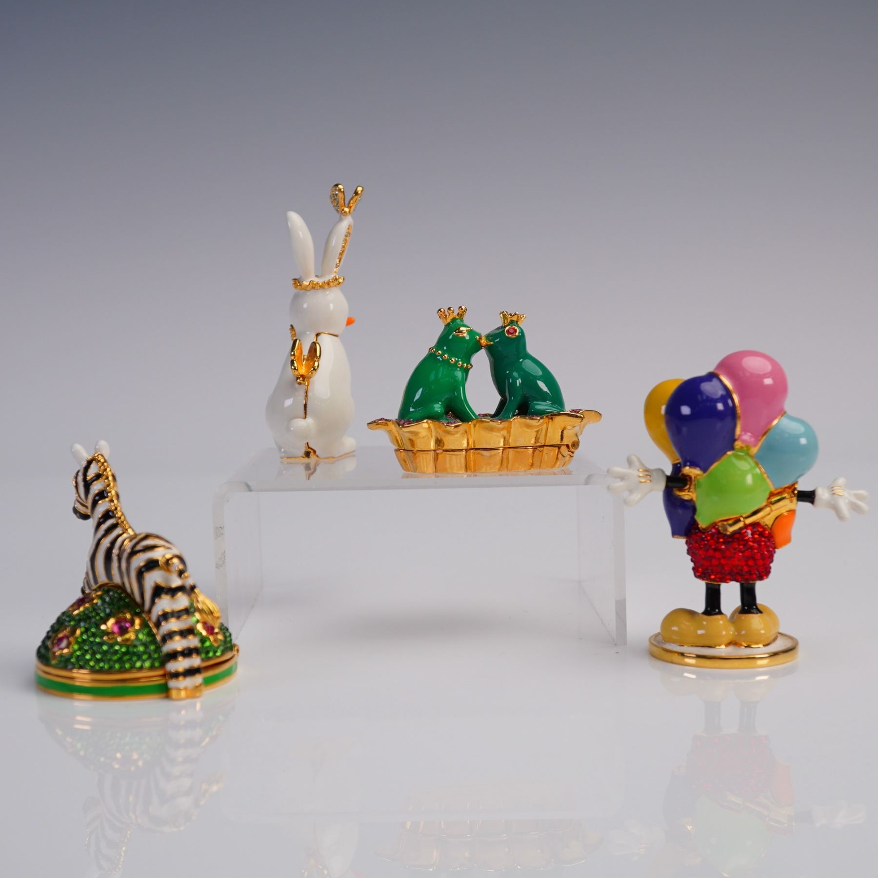 Estee Lauder's collectible solid perfume compacts are renowned for their whimsical artistry and luxurious detailing. This charming set includes four distinct enameled and crystal-accented designs: a crowned white rabbit, a kissing frog couple in a golden basket, a zebra atop a jeweled green mound, and a balloon-holding Mickey Mouse with sparkling red trousers. Each features a magnetic clasp that opens to reveal a solid perfume interior with inscriptions and date stamps inside, ranging from 2022 to 2023. The designs exemplify Estee Lauder's long tradition of producing limited-edition, imaginative collectibles for fragrance and decor enthusiasts. Largest measures approximately 2.5"H.