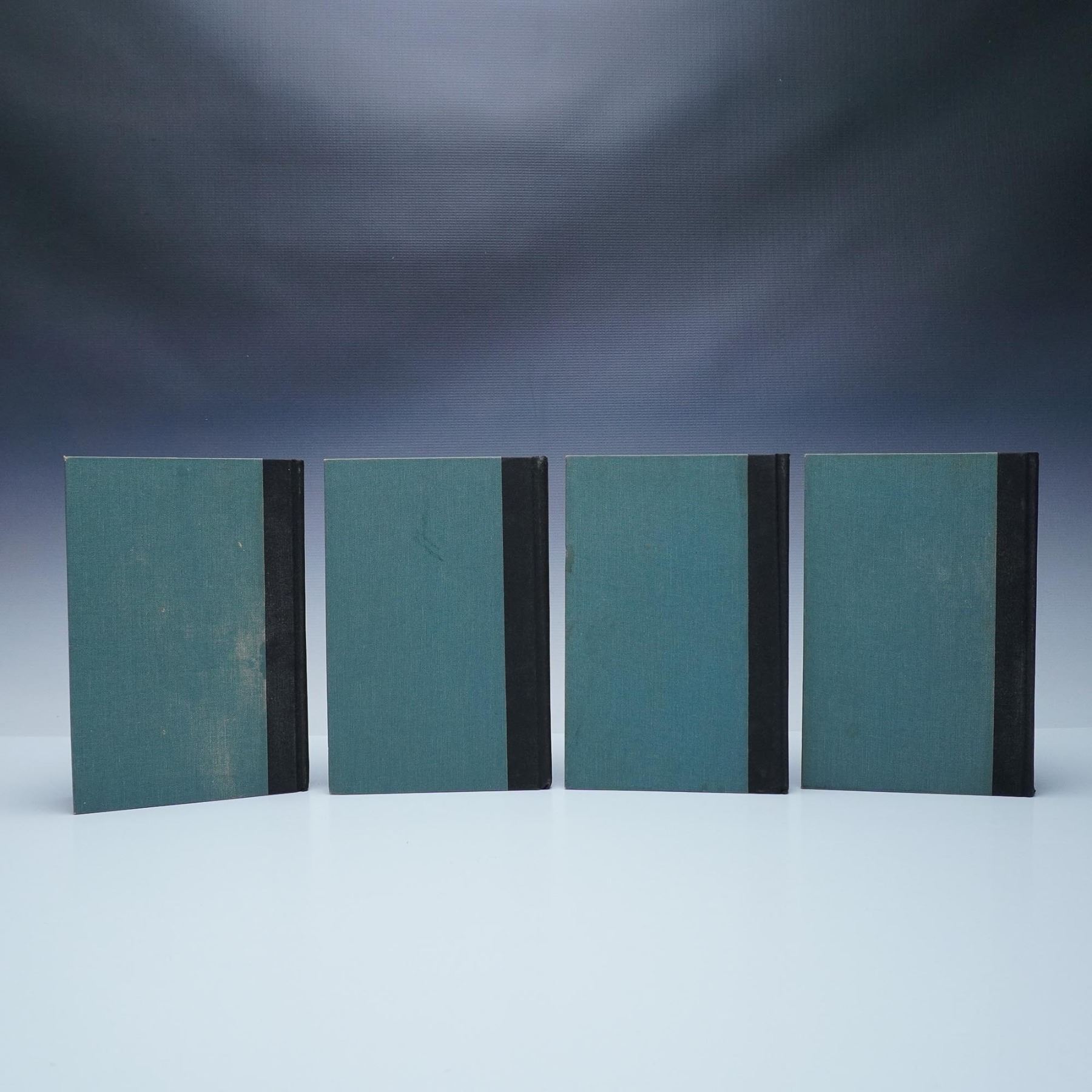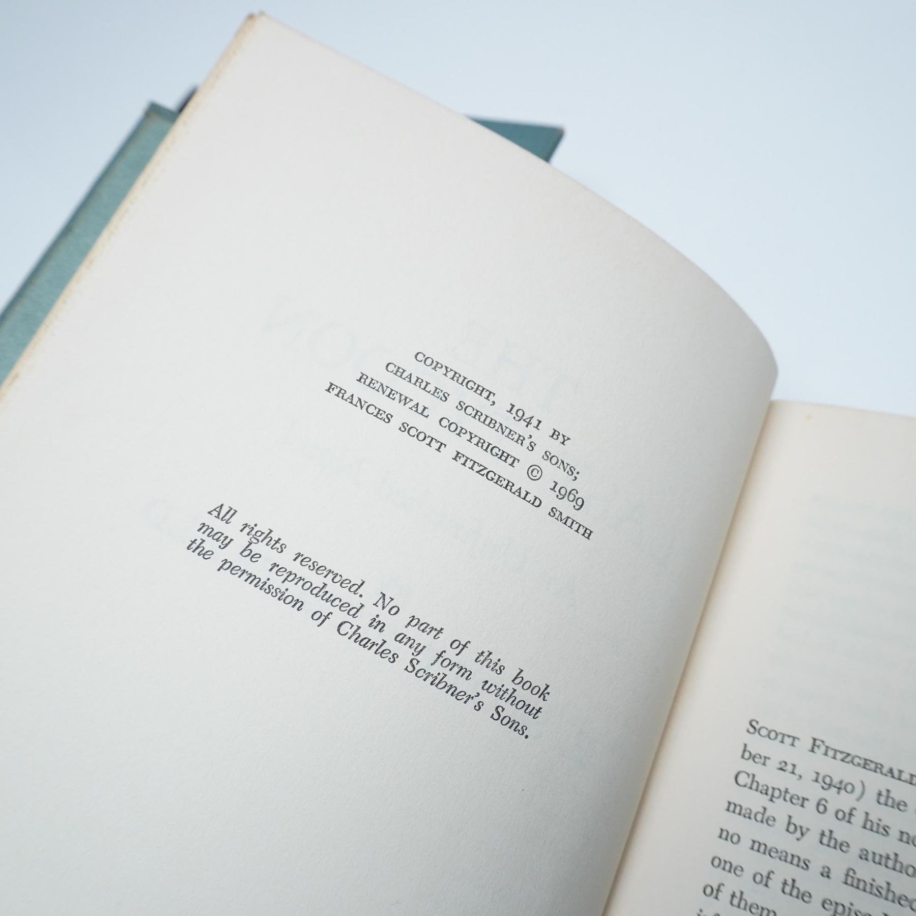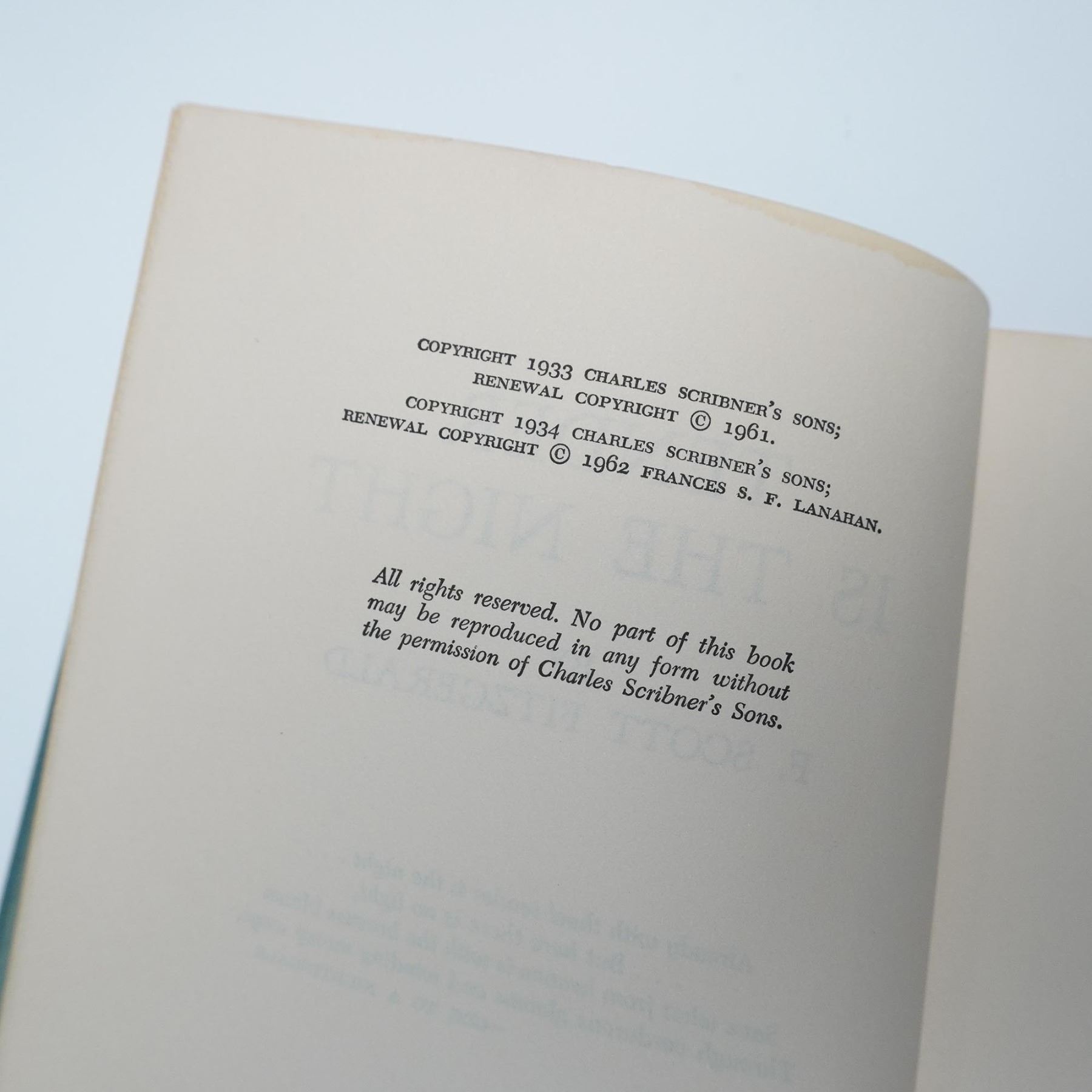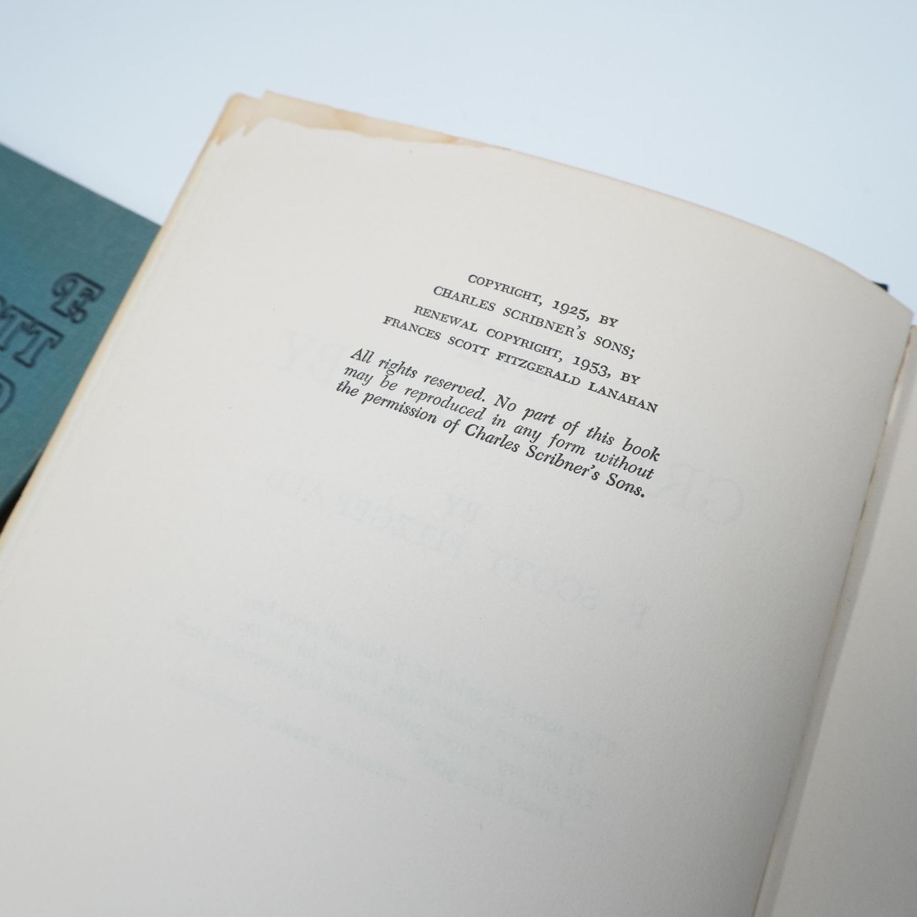 A 4-piece book set of works by F. Scott Fitzgerald, published by Charles Scribner’s Sons. This collection includes The Great Gatsby, The Last Tycoon (2 copies), and Tender Is the Night. Bound in classic teal cloth with black spines, the books feature gilt lettering on the covers and spines. The copyright pages indicate various renewal dates, showcasing mid-century printings of Fitzgerald’s iconic literature. The largest book measures 5.5"L x 1.5"W x 8.5"H. A must-have set for collectors of literary classics and American literature enthusiasts.
