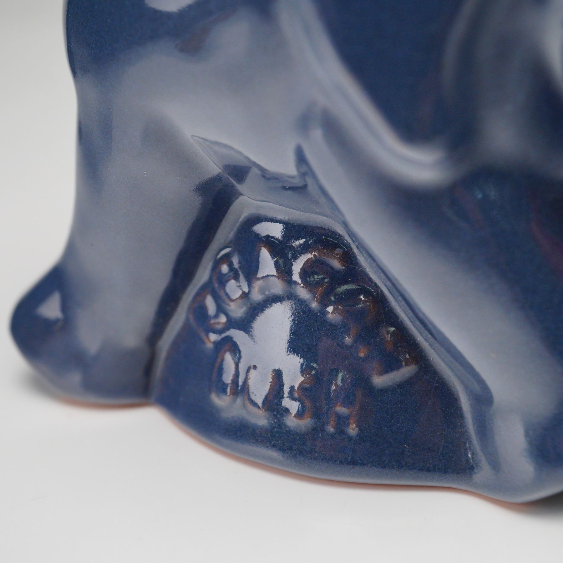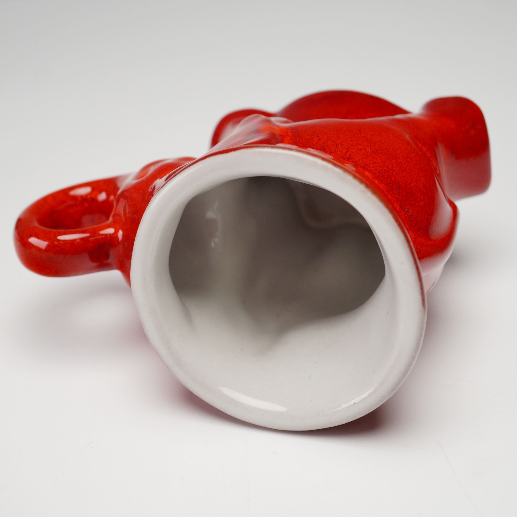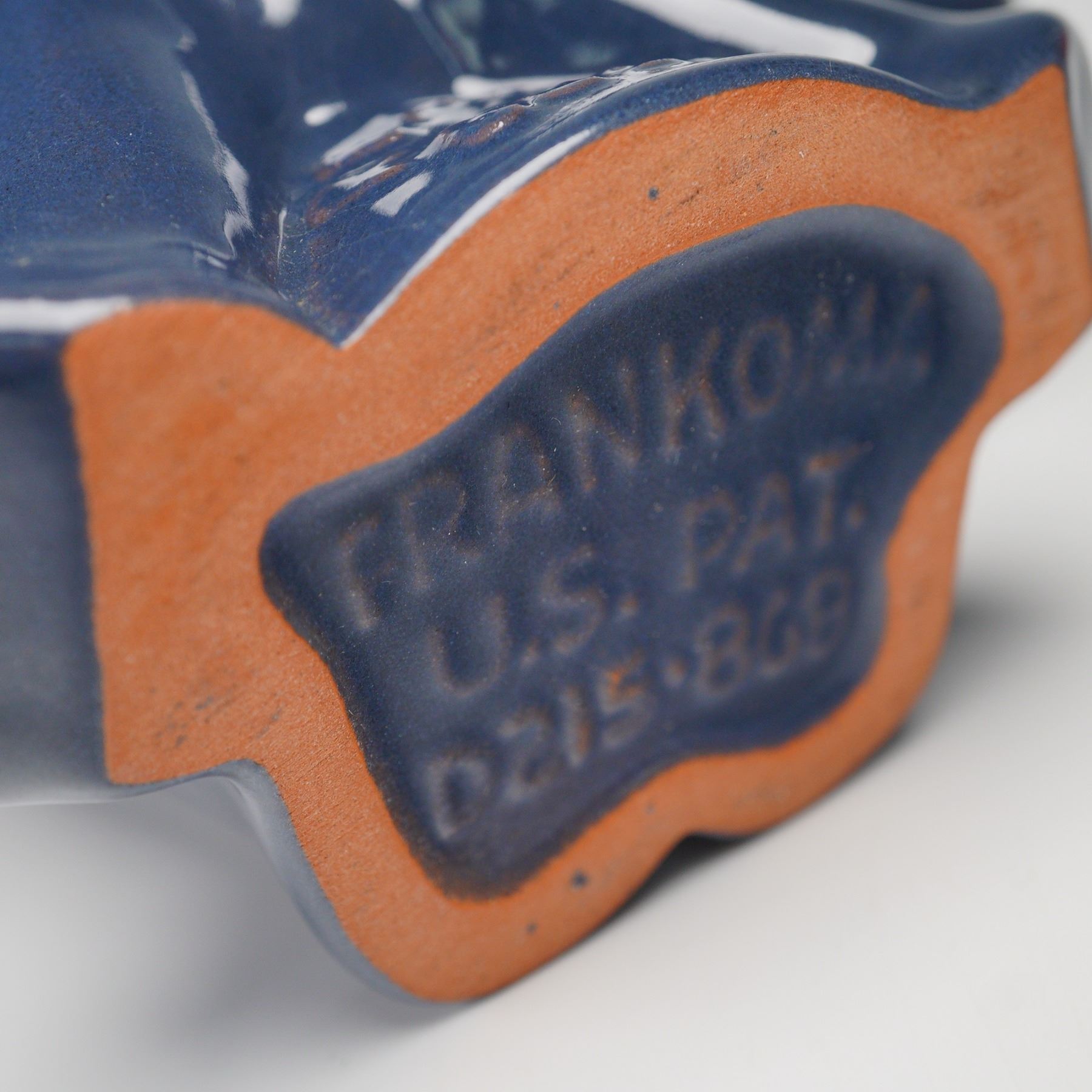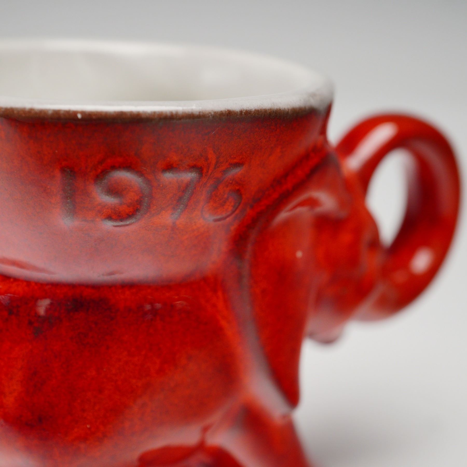 This set includes four collectible Frankoma ceramic elephant mugs, two in a rich red glaze dated 1976 and two in a deep blue glaze dated 1985. Each mug is sculpted in the shape of an elephant with the trunk forming the handle, showcasing Frankomas signature craftsmanship and mid century design. These pieces are both functional and decorative, perfect for collectors or as standout display items. Frankoma backstamp.
