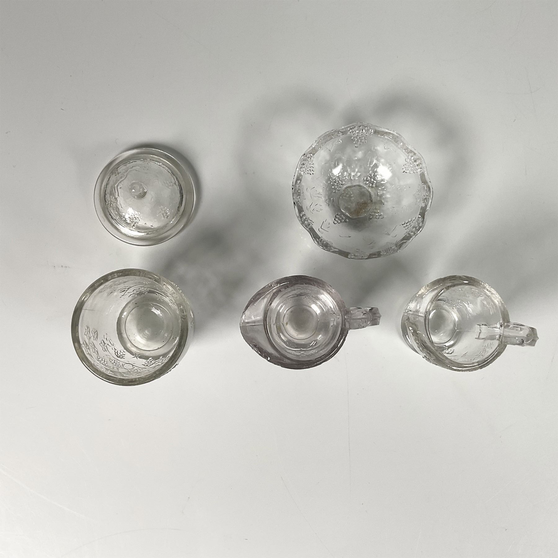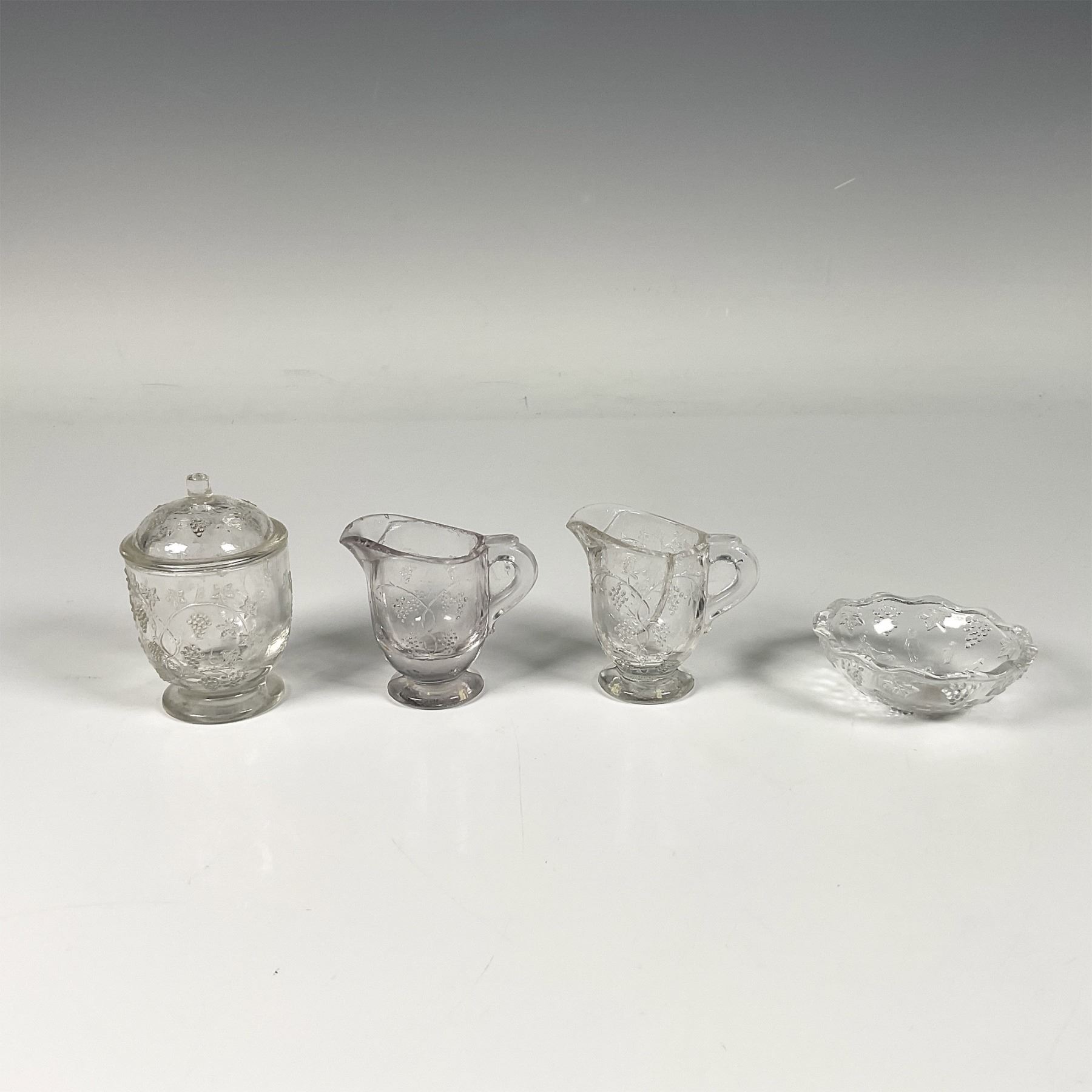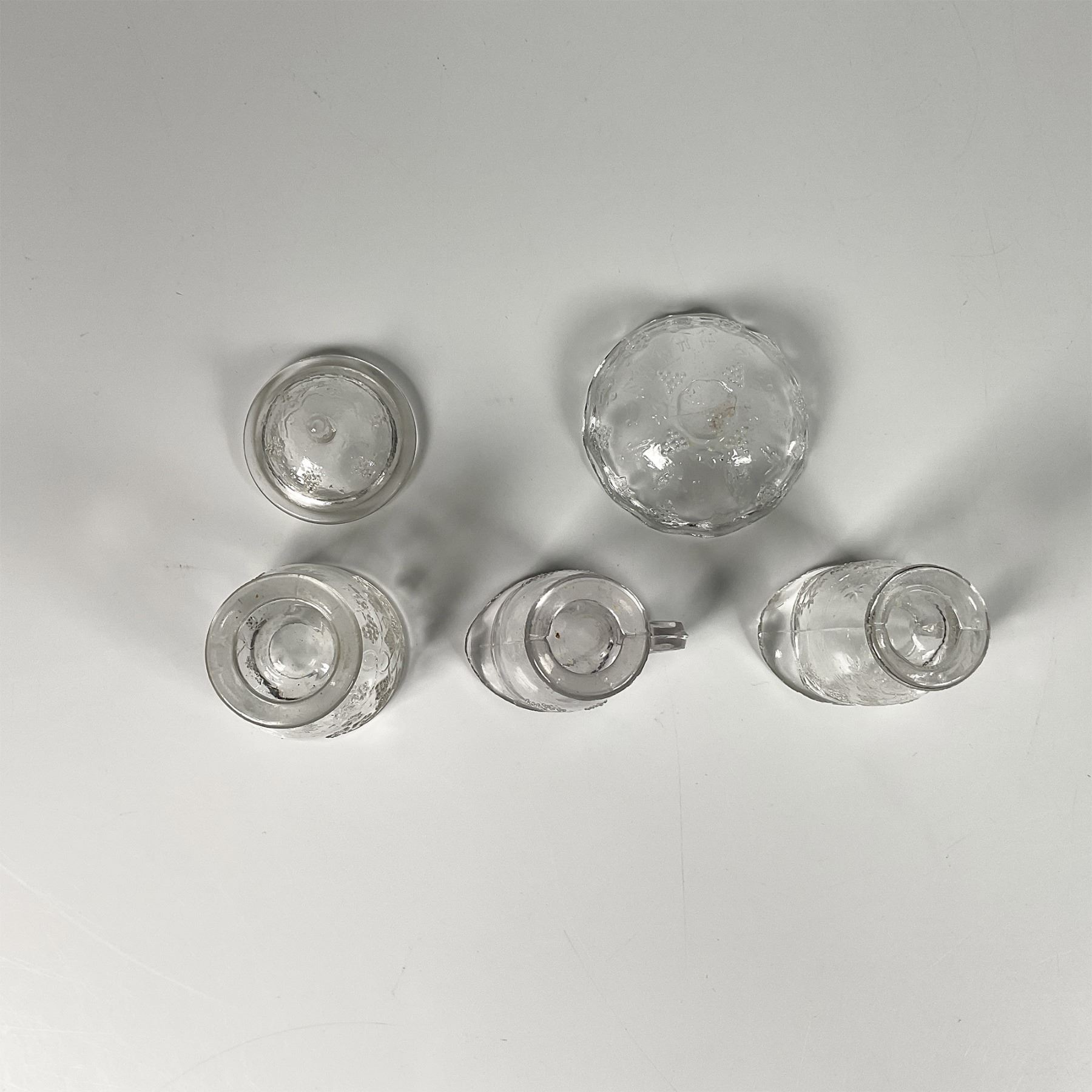 Set of glass tableware with a simple, abundant vine and leaf pattern, including a pot with lid, two creamers, and a mini bowl. Pot: 1.75"W x 3"H. Creamer: 2.25"L x 1.5"W x 2.25"H. Bowl: 2.5"W x 1"H.