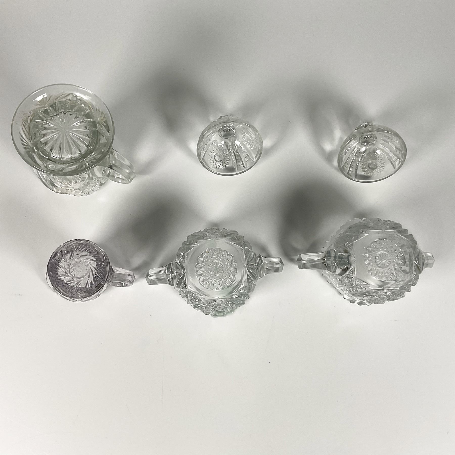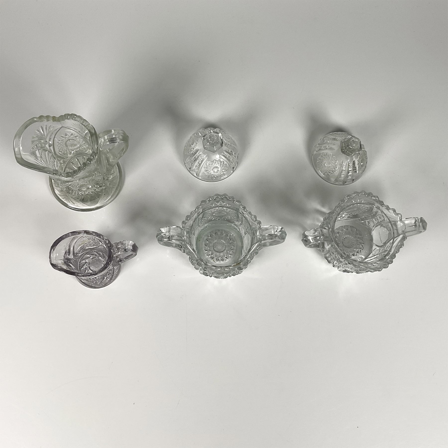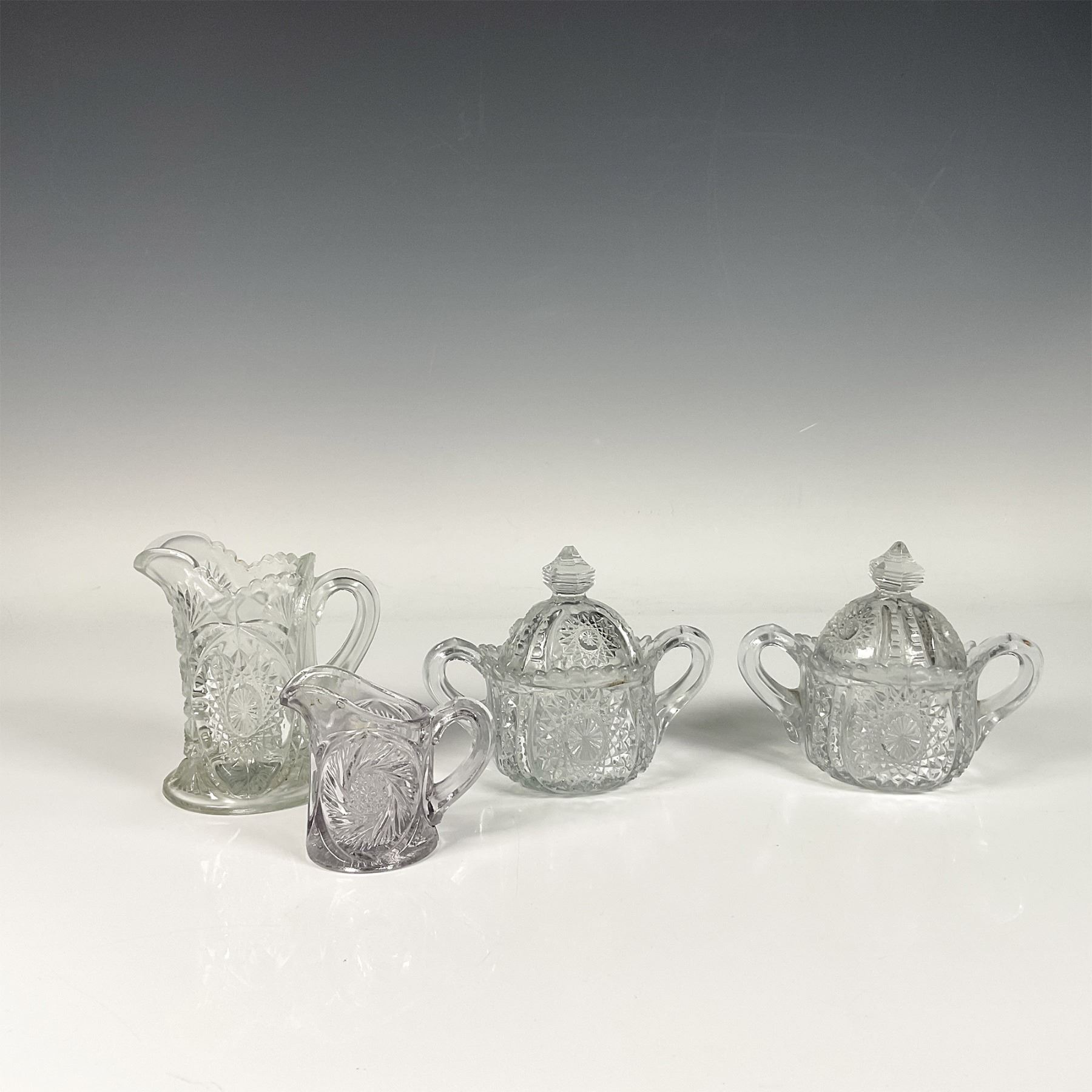 Set of two sugar bowls and one creamer, each adorned with intricate sunflowers, alongside a creamer featuring a snowflake pattern. Large creamer: 4.5"L x 3"W x 4.25"H. Small creamer: 3.25"L x 2"W x 2.75"H. Sugar bowl: 5.25"L x 3.5"W x 4.25"H