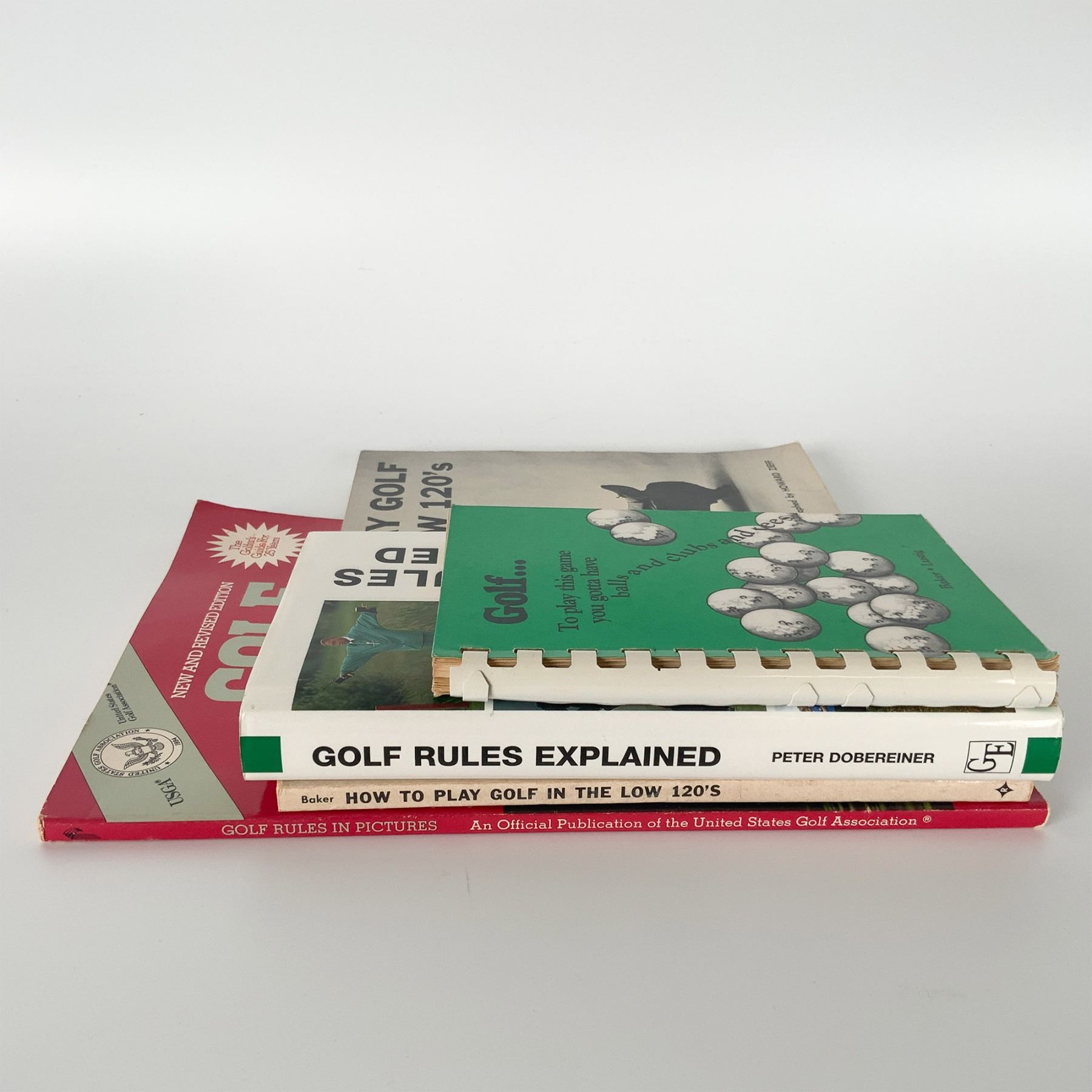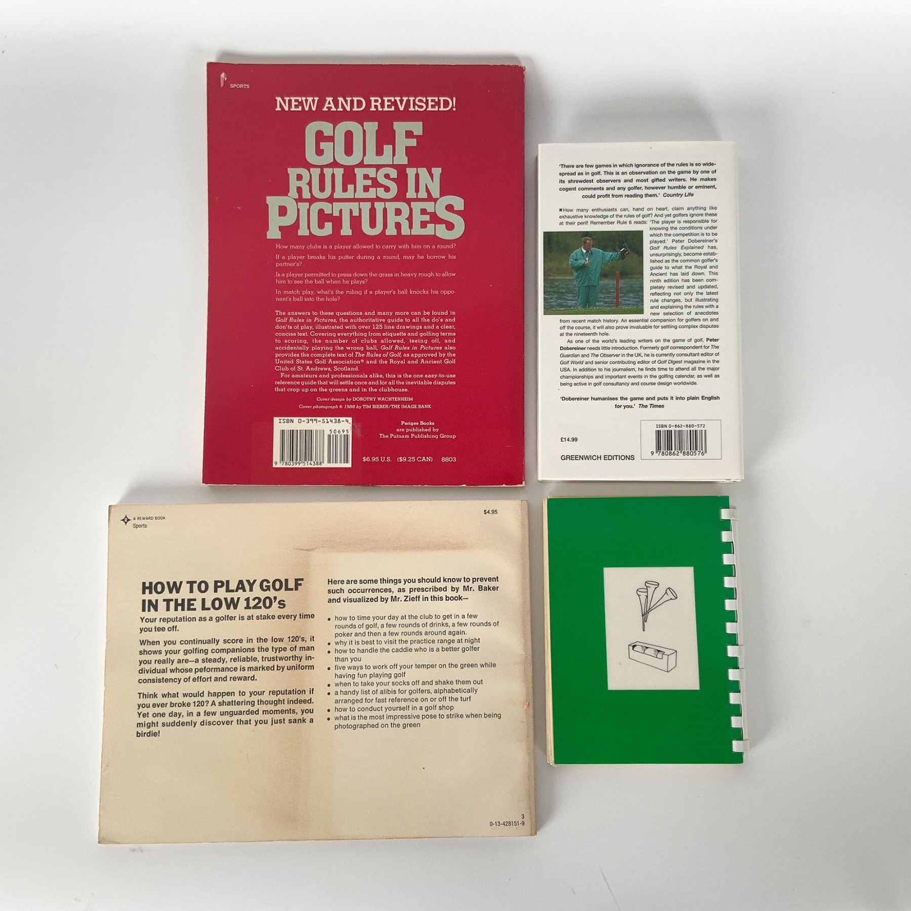 This collection of four golf-related books provides a mix of instructional guidance, rule explanations, and humor for golf enthusiasts. Included in this lot is Golf Rules in Pictures, a revised edition of the official United States Golf Association publication with an introduction by Arnold Palmer, offering visual explanations of golf rules. How to Play Golf in the Low 120s by Stephen Baker, with photography by Howard Zieff, presents a humorous take on the struggles of improving ones game. Golf Rules Explained by Peter Dobereiner is a fully revised and updated ninth edition that provides in-depth insights into the rules of golf with detailed explanations and illustrations. Lastly, Golf… To Play This Game You Gotta Have Balls and Clubs and Tees by Baker & Luang is a spiral-bound book that adds a lighthearted approach to the sport. Largest book measures 10.75"H.