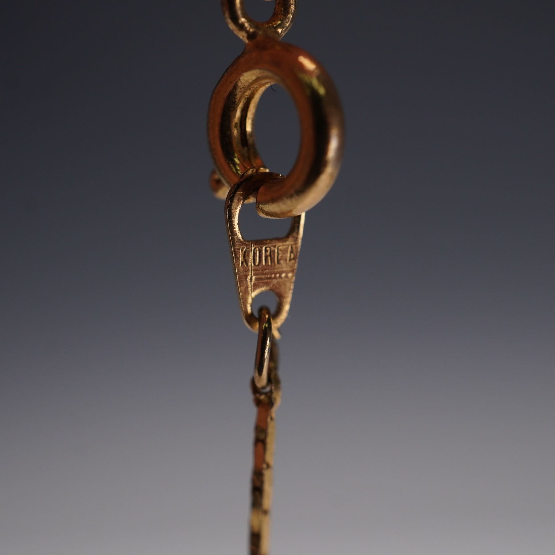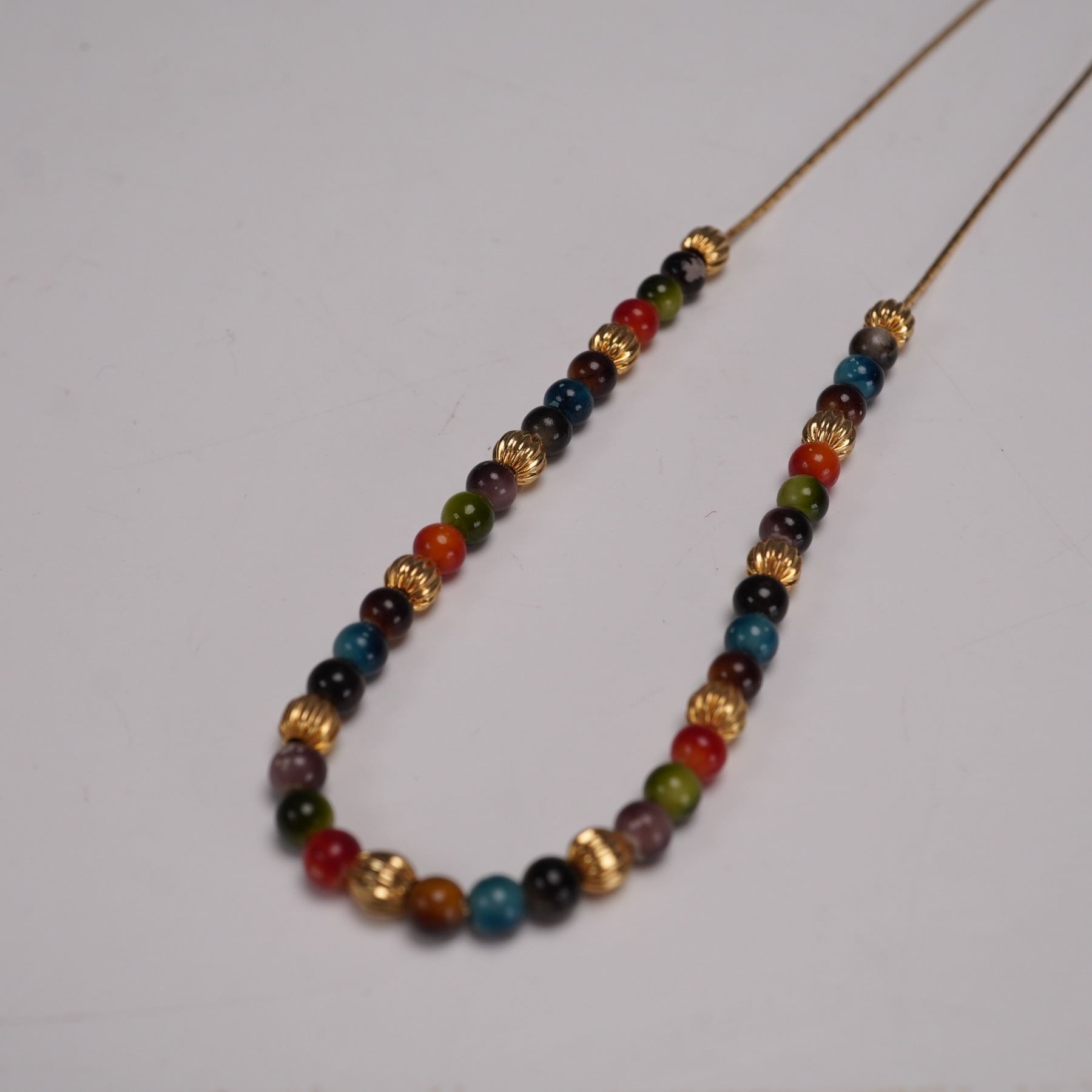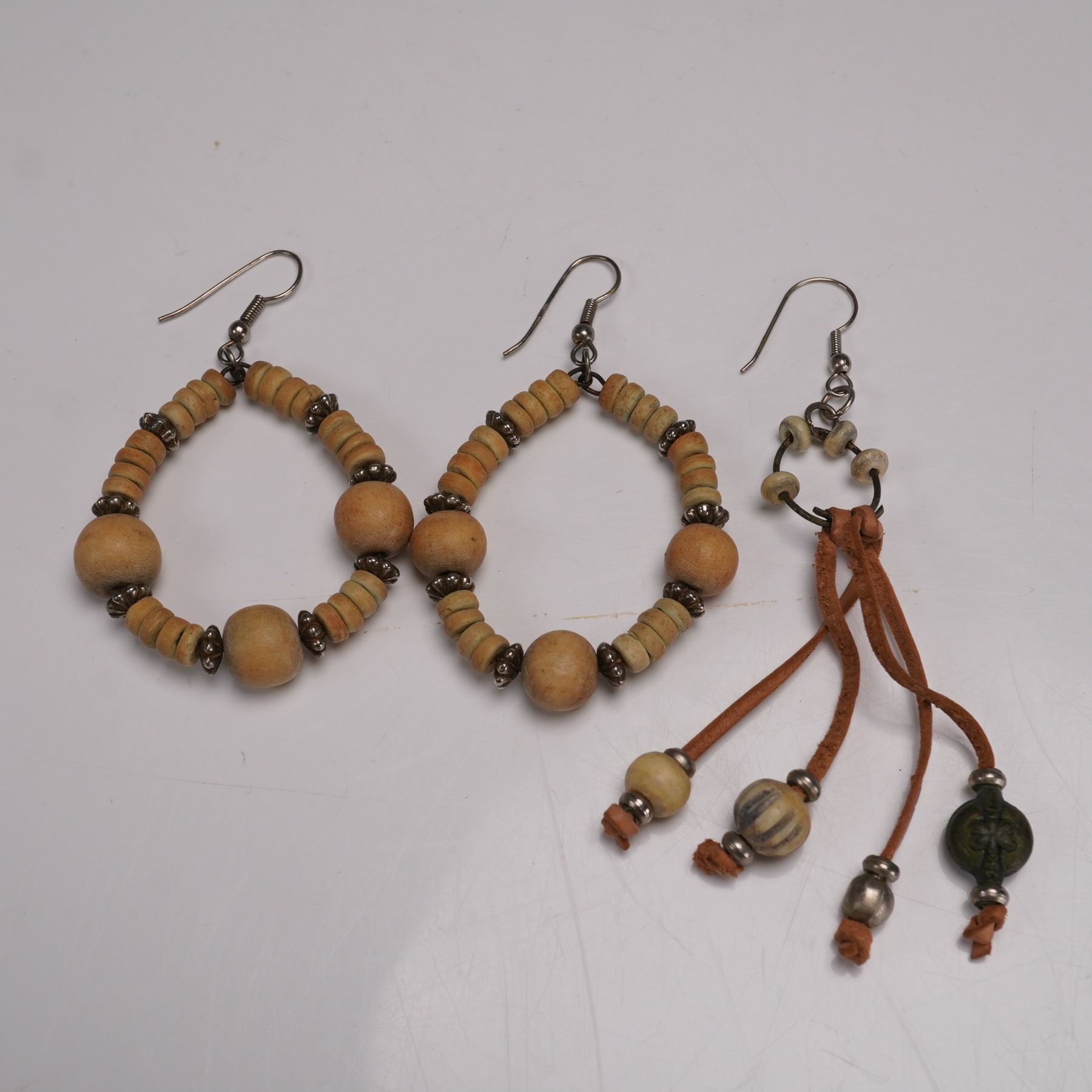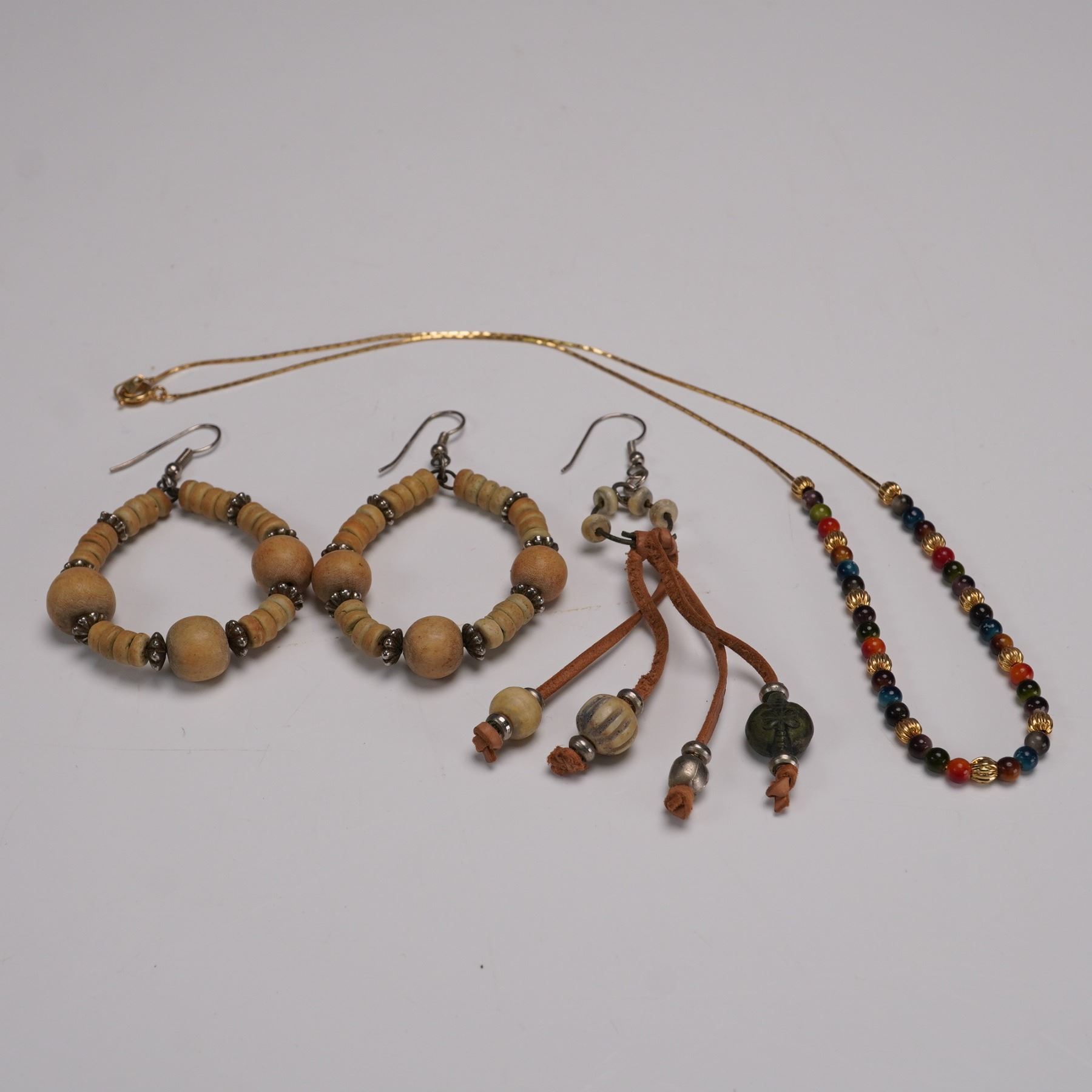 Assorted group of four vintage-style beaded jewelry pieces, including a pair of hoop earrings strung with natural wood and metallic beads, a single dangle earring composed of ceramic rings and leather cords with decorative beads, a colorful beaded necklace with polished round glass beads and textured gold-tone spacers, and a fine-link chain necklace marked "Korea" at the clasp. Wear consistent with age and use.