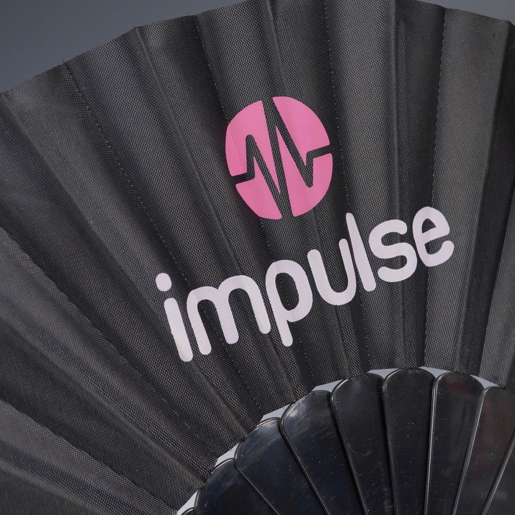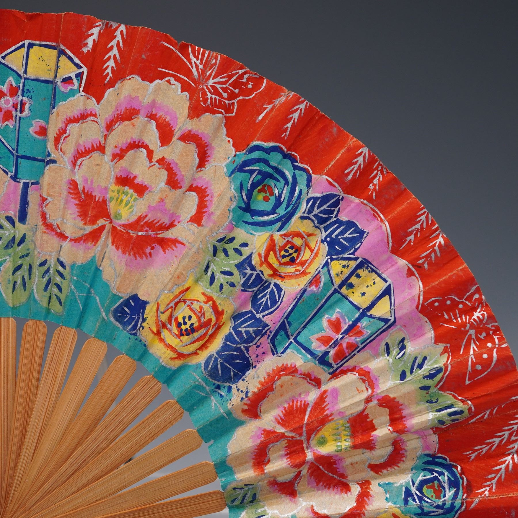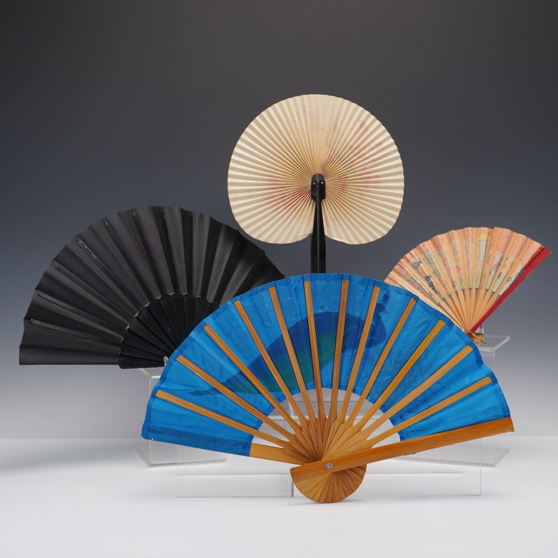 A colorful assortment of four decorative folding fans showcasing a variety of materials and designs. Includes a canvas fan hand-painted with a vivid peacock and blossoms, a circular rice paper fan decorated with two perched birds and cherry blossoms, a red lacquered paper fan featuring vibrant floral motifs, and a modern black polyester promotional fan marked "Impulse." Each fan is mounted on wood or plastic ribs and displays moderate wear consistent with handling and age. An eclectic blend of traditional and contemporary styles, ideal for display or costume use.