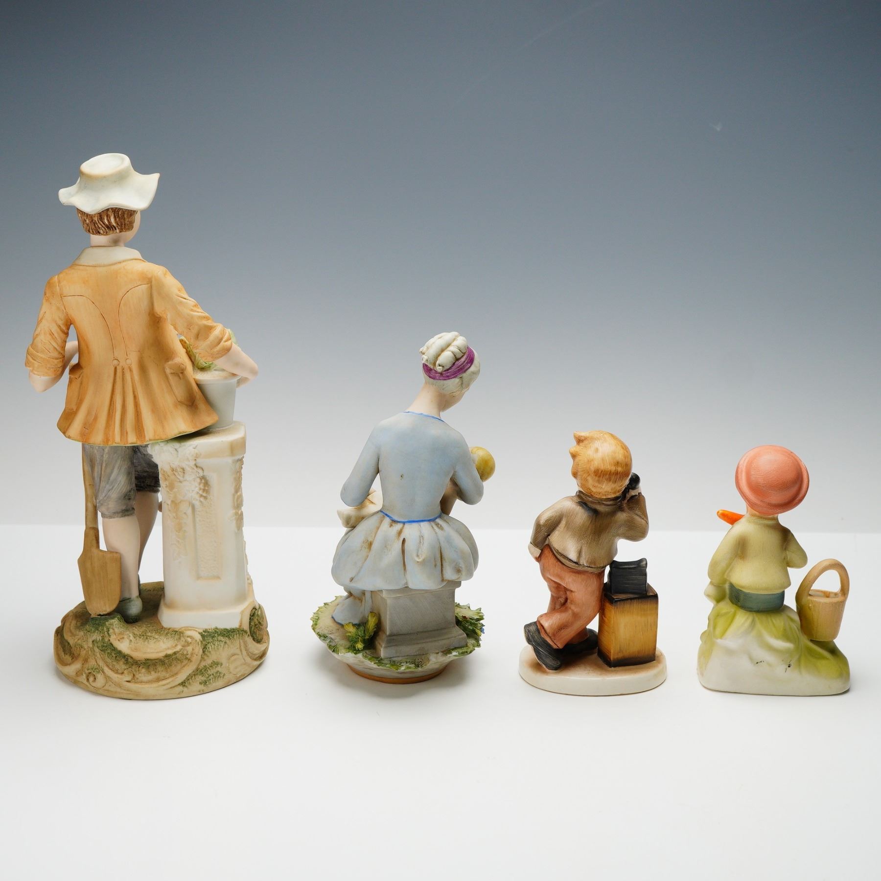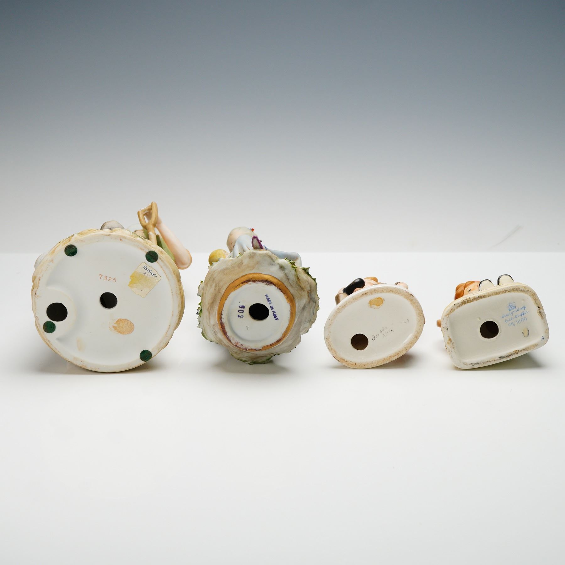 A mixed collection of four hand-painted porcelain figurines, including both Italian and American examples. The group features: a gardener with hat, shovel, and dog (marked 7326 beneath), a mother nursing her child (marked 502), a boy with suitcase speaking on a telephone, and a young boy with cap, carrot, and basket. Each figure is finely detailed, with expressive faces and colorful attire. Together, they represent a charming cross-section of mid-20th century figurine production across Europe and America.