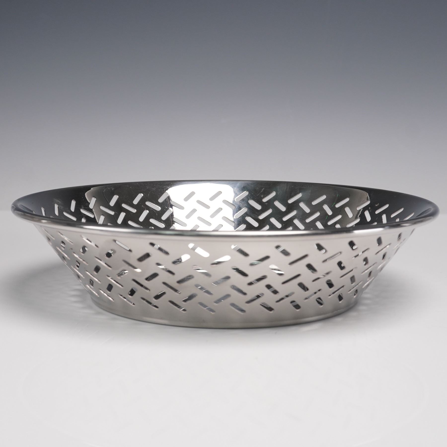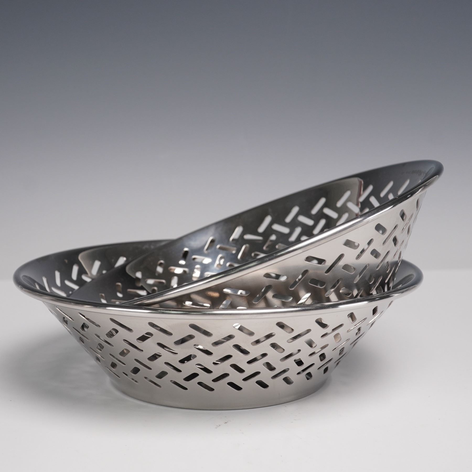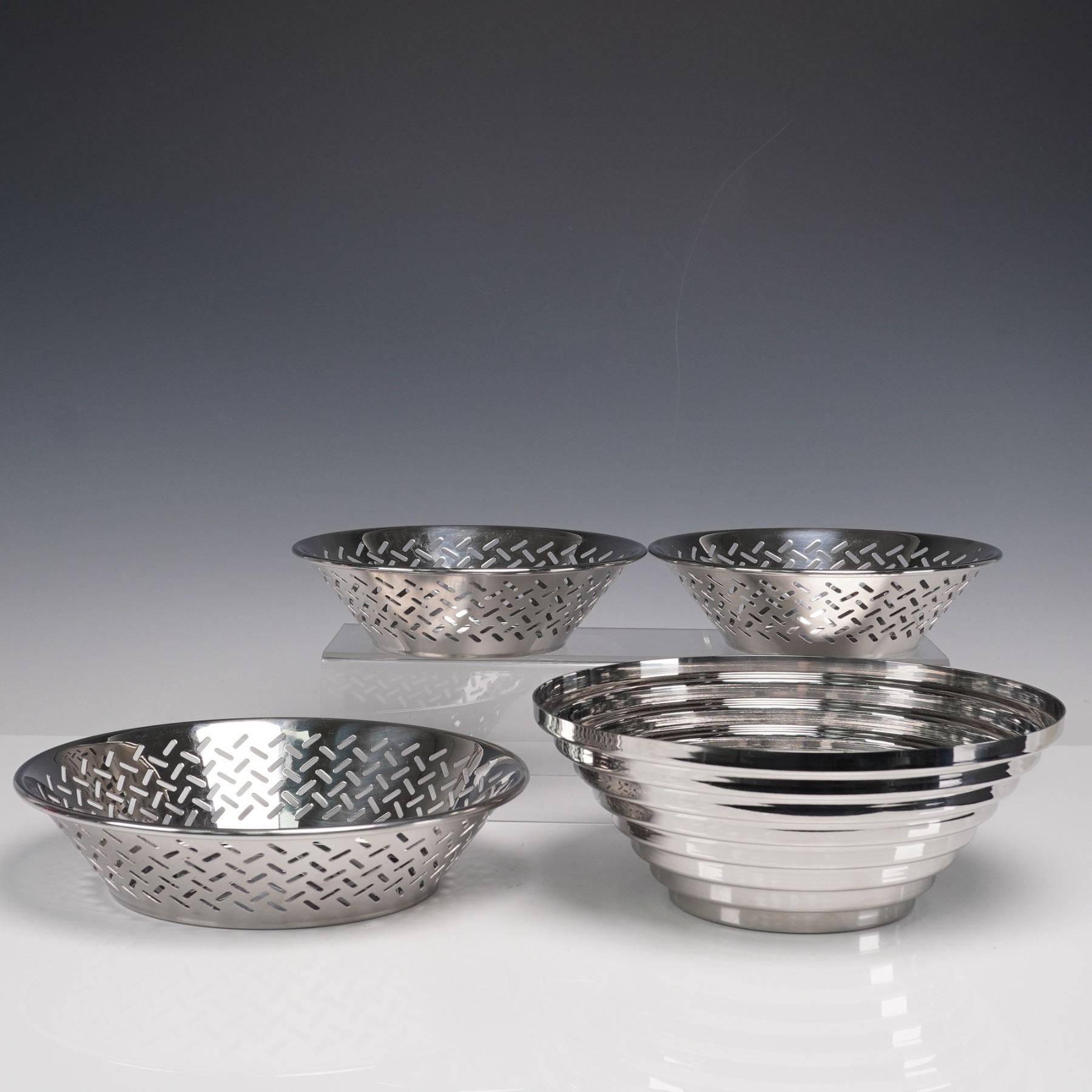 A collection of four modern Italian stainless steel bowls by Alessi, known for their high-quality design and craftsmanship. The lot includes three matching shallow bowls with a perforated basketweave pattern and one larger, stepped-rim bowl with a minimalist, sculptural form. All pieces are marked "Alessi Italy Inox 18/10" on the base, with one retaining the original foil label. Sleek and functional, this group showcases the brand's signature balance of form and utility.