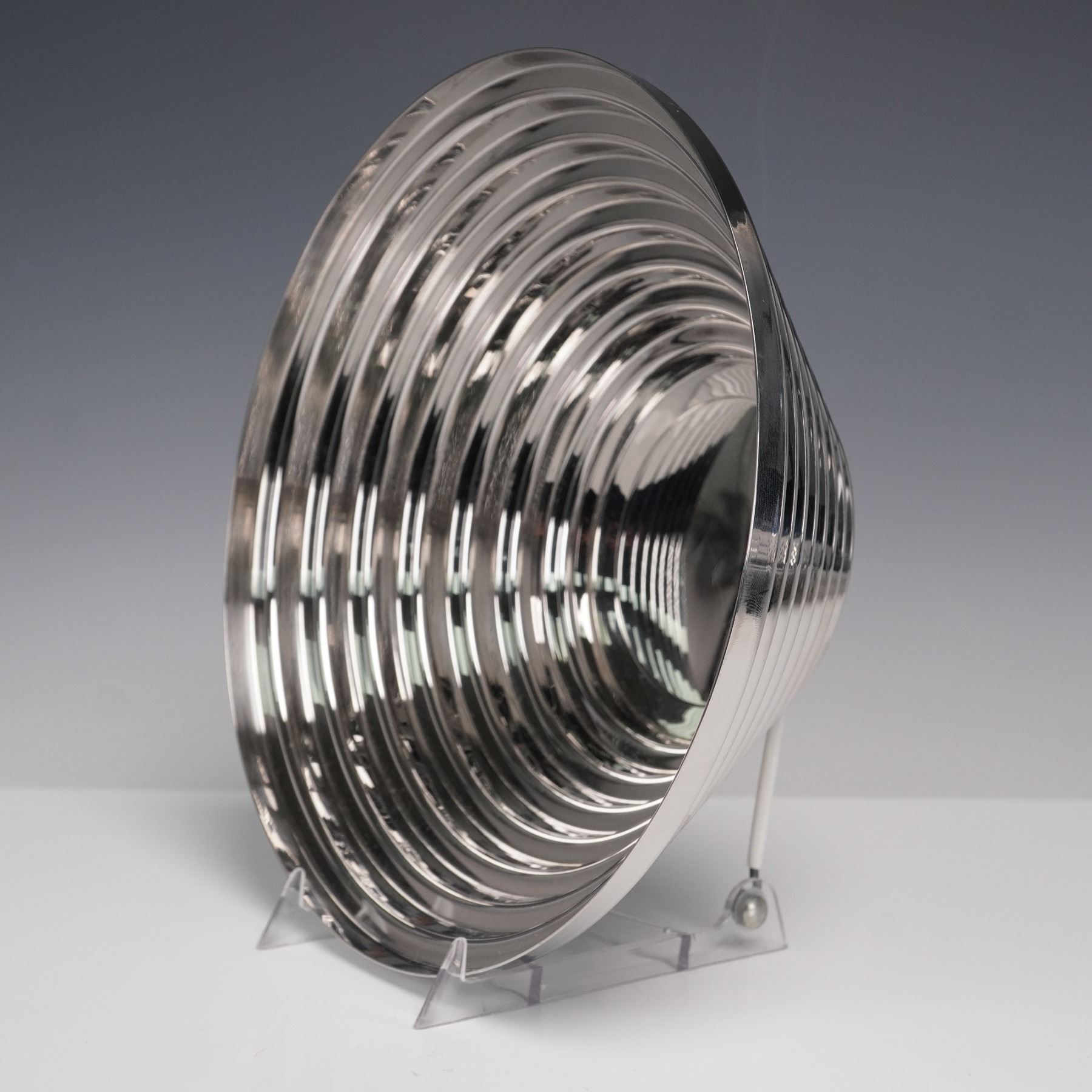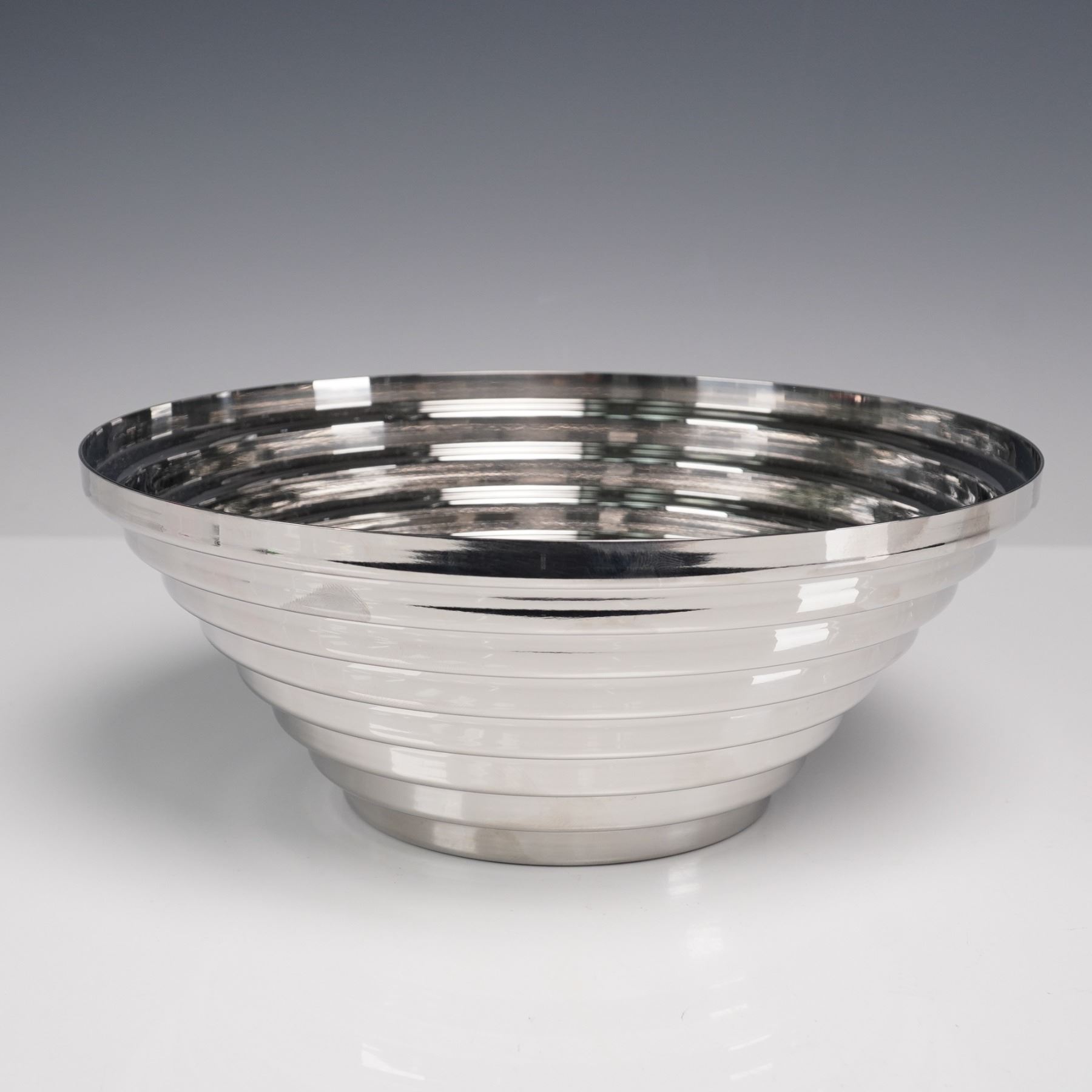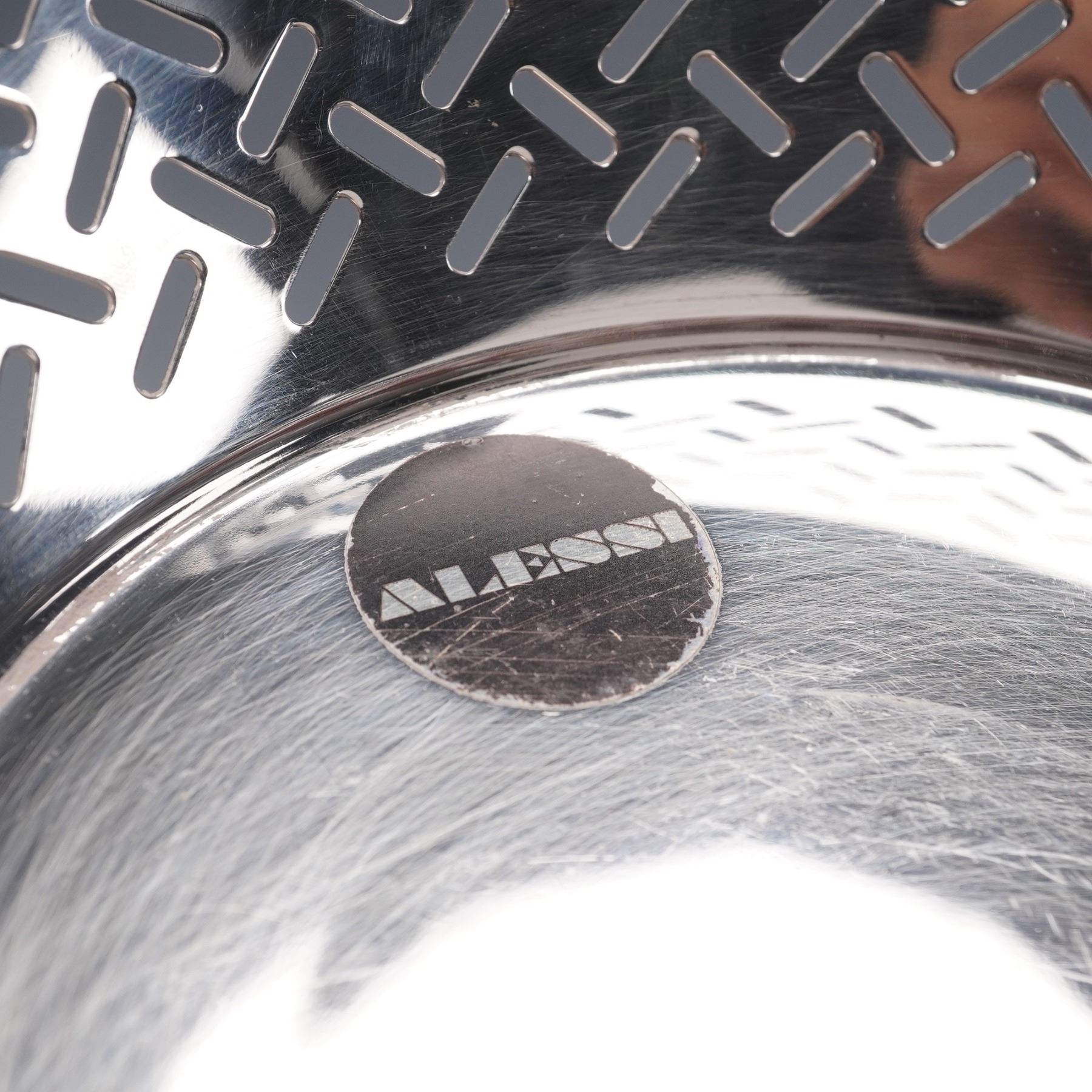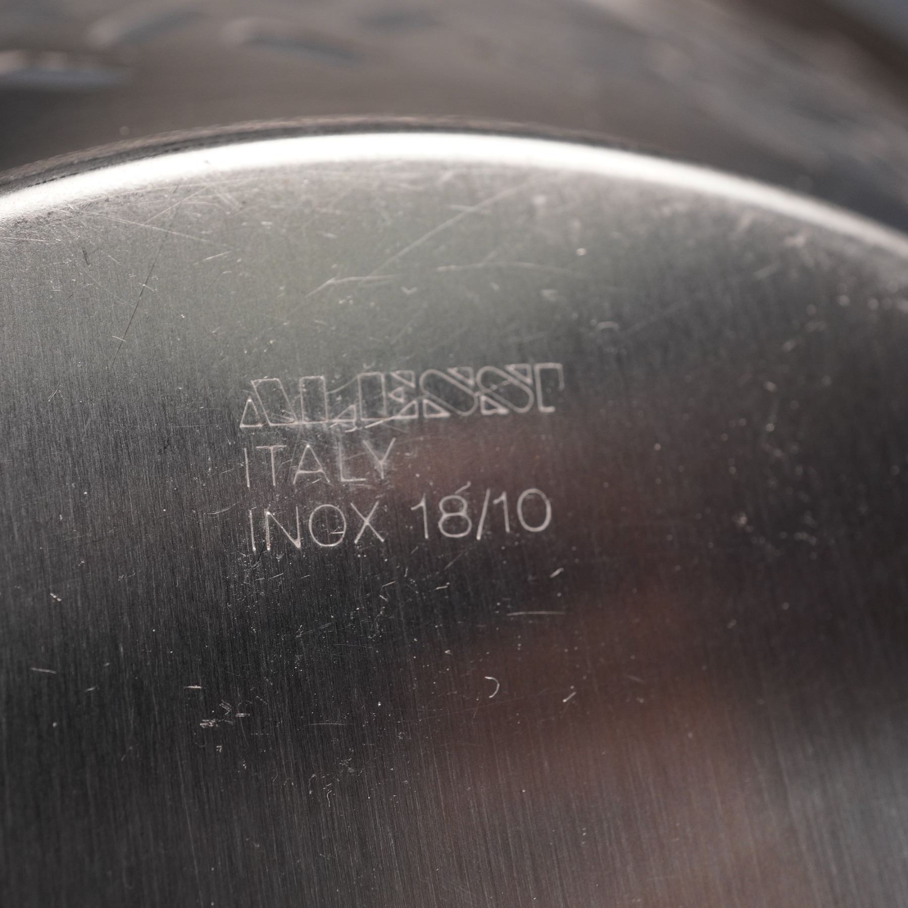 A collection of four modern Italian stainless steel bowls by Alessi, known for their high-quality design and craftsmanship. The lot includes three matching shallow bowls with a perforated basketweave pattern and one larger, stepped-rim bowl with a minimalist, sculptural form. All pieces are marked "Alessi Italy Inox 18/10" on the base, with one retaining the original foil label. Sleek and functional, this group showcases the brand's signature balance of form and utility.