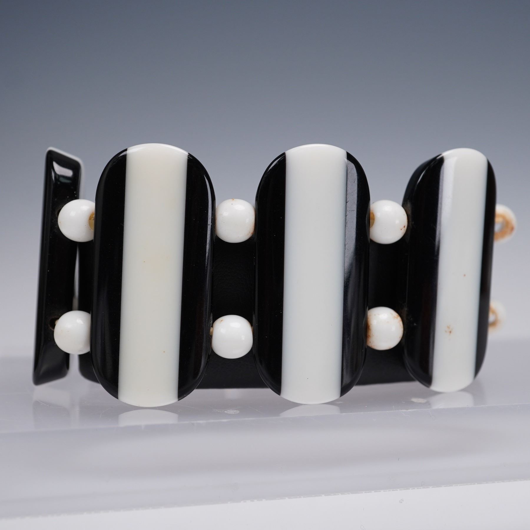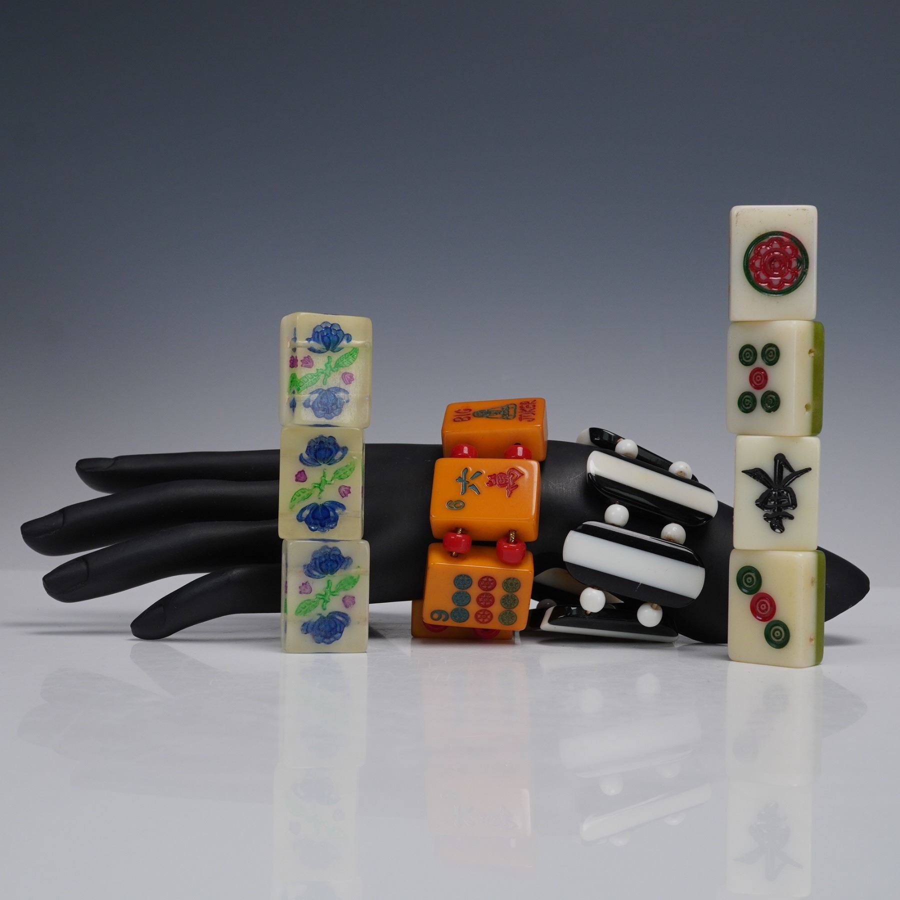 A vibrant and eclectic group of four vintage stretch bracelets, including three examples fashioned from Mahjong-style tiles in a variety of colors and motifs. One features yellow tiles with red and green painted Chinese characters and red spacer beads; another displays cream-colored tiles with colorful floral carvings; and a third bracelet includes classic Mahjong disc symbols and character tiles in ivory tones. The fourth bracelet is composed of bold black and white vertical bars alternating with round white spacer beads, creating a striking graphic look. All bracelets are elasticized for flexible wear.