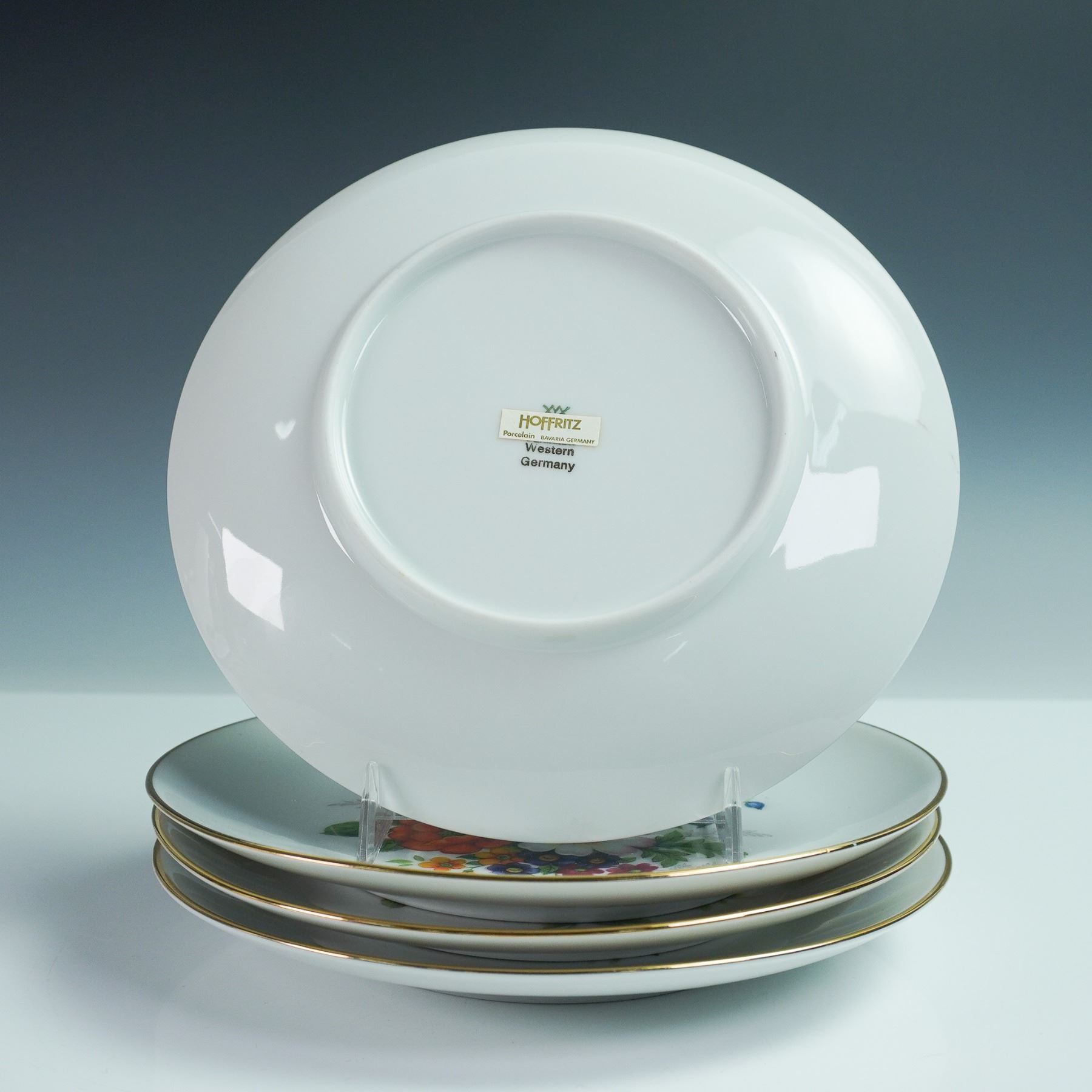 A set of four finely crafted porcelain plates by Höftritz, Western Germany, featuring vibrant hand-painted floral motifs on a white ground. Each plate showcases a distinct bouquet composition, framed by an elegant gold-rimmed edge. The Höftritz backstamp is present on the underside, reflecting the brand's quality porcelain production.