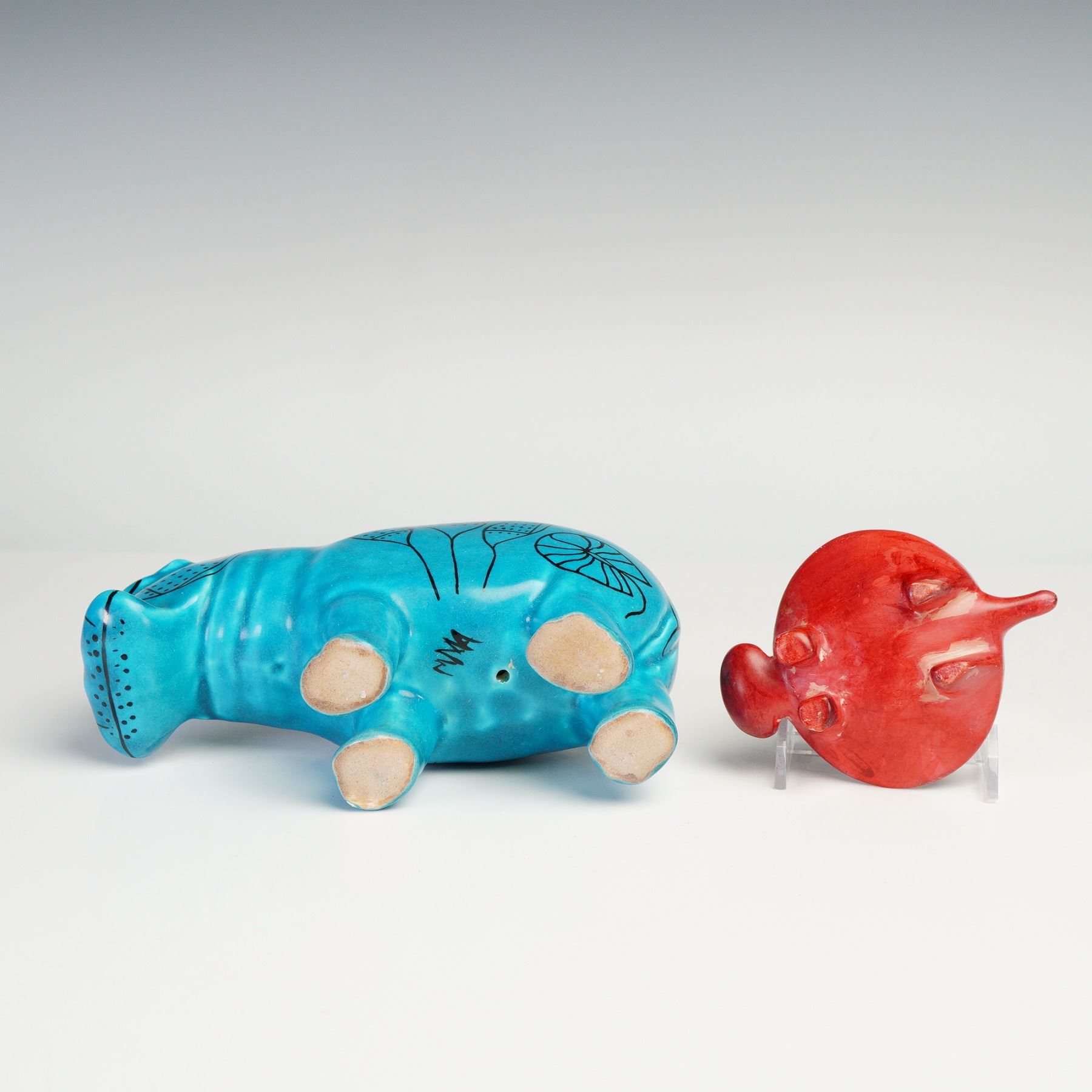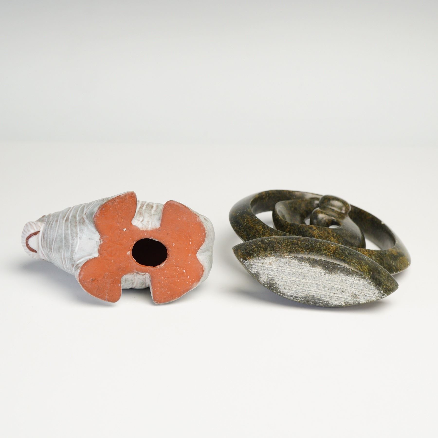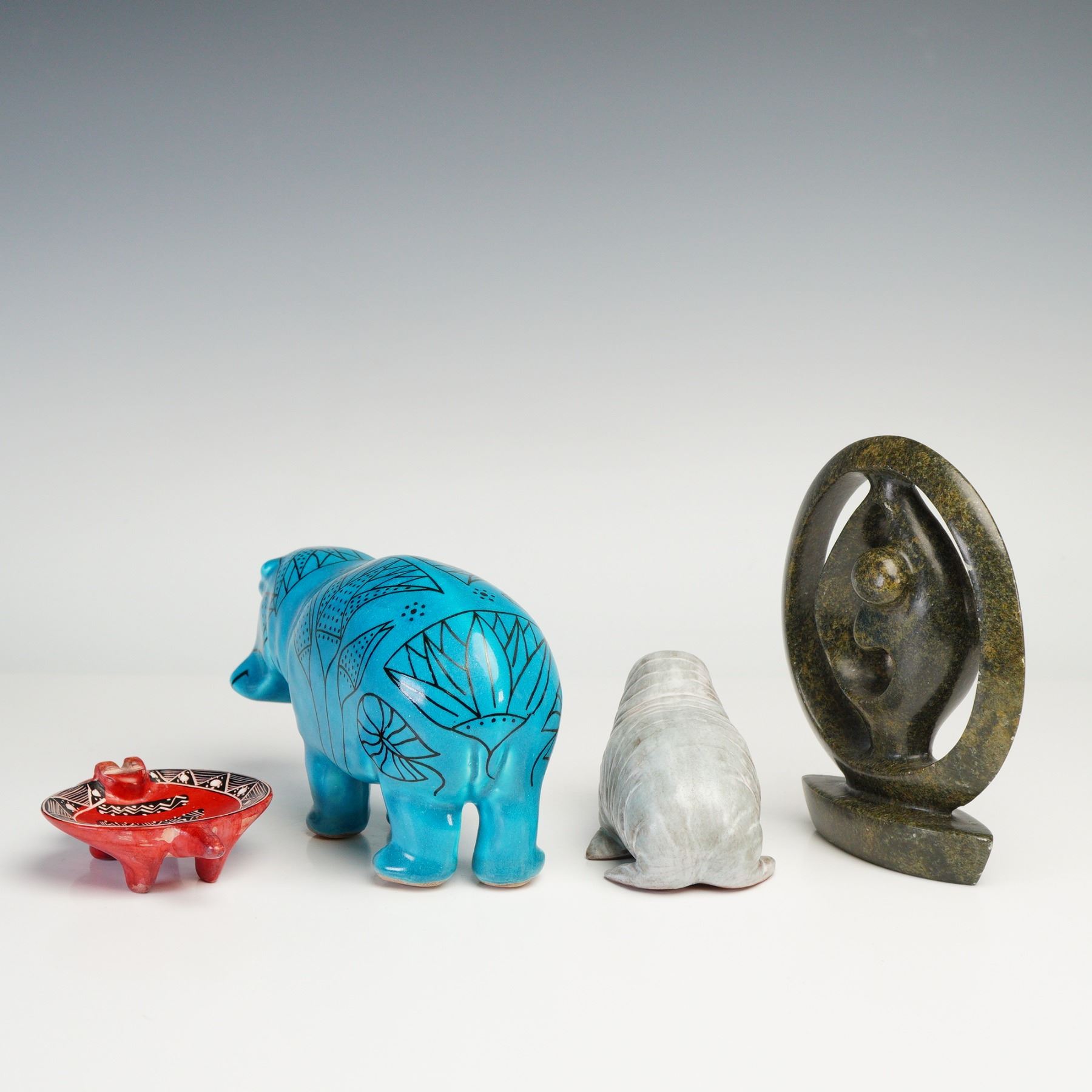 Includes William the Hippo from the Metropolitan Museum of Art collection, a hand-carved red soapstone hippo bowl, an African Circle of Love abstract stone sculpture depicting parent and child, and a small carved stone baby walrus figure. A varied and appealing group showcasing artistic interpretations of animals and form in ceramic and stone.