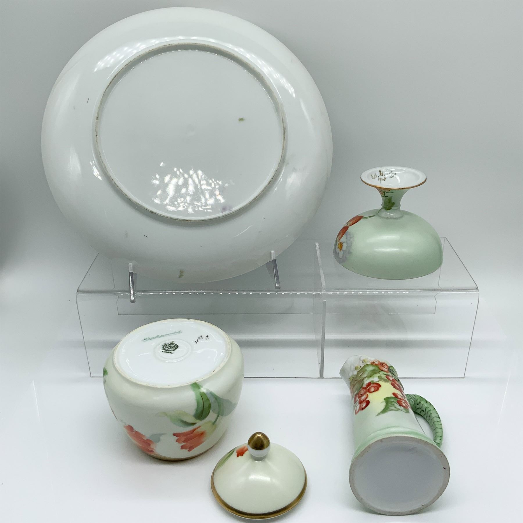 A collection of hand-painted porcelain tableware featuring delicate floral motifs in soft green and vibrant red hues. This set includes a plate with calla lilies, a footed compote with daisy designs, a lidded sugar bowl with tulip accents, and a small handled pitcher adorned with berry decorations and a textured handle resembling braided vines. The largest item, the plate, measures 10.5 inches in diameter. Each piece showcases detailed craftsmanship with fine brushstrokes and gold trim. A beautiful addition to a vintage-inspired collection or as a display piece.