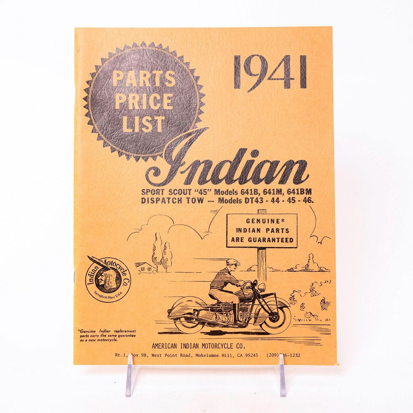 Reprint of Indian Motorcycle "Operation and Maintenance Manual" and "Parts Price List" books. 2 books of "Operation and Maintenance Manual" for Model 741 Army Scout, 640 Sport Scout, all Scout models 1934 and later and "74". 2 books of "Parts Price List" for Sport Scout "45" models, Dispatch Toe models and 1944 to 1948. Lithographed by Village Printshop, Sonora CA. Previous owner's name signed inside of the front cover. Light lines and creases on the front and back covers. Automobilia