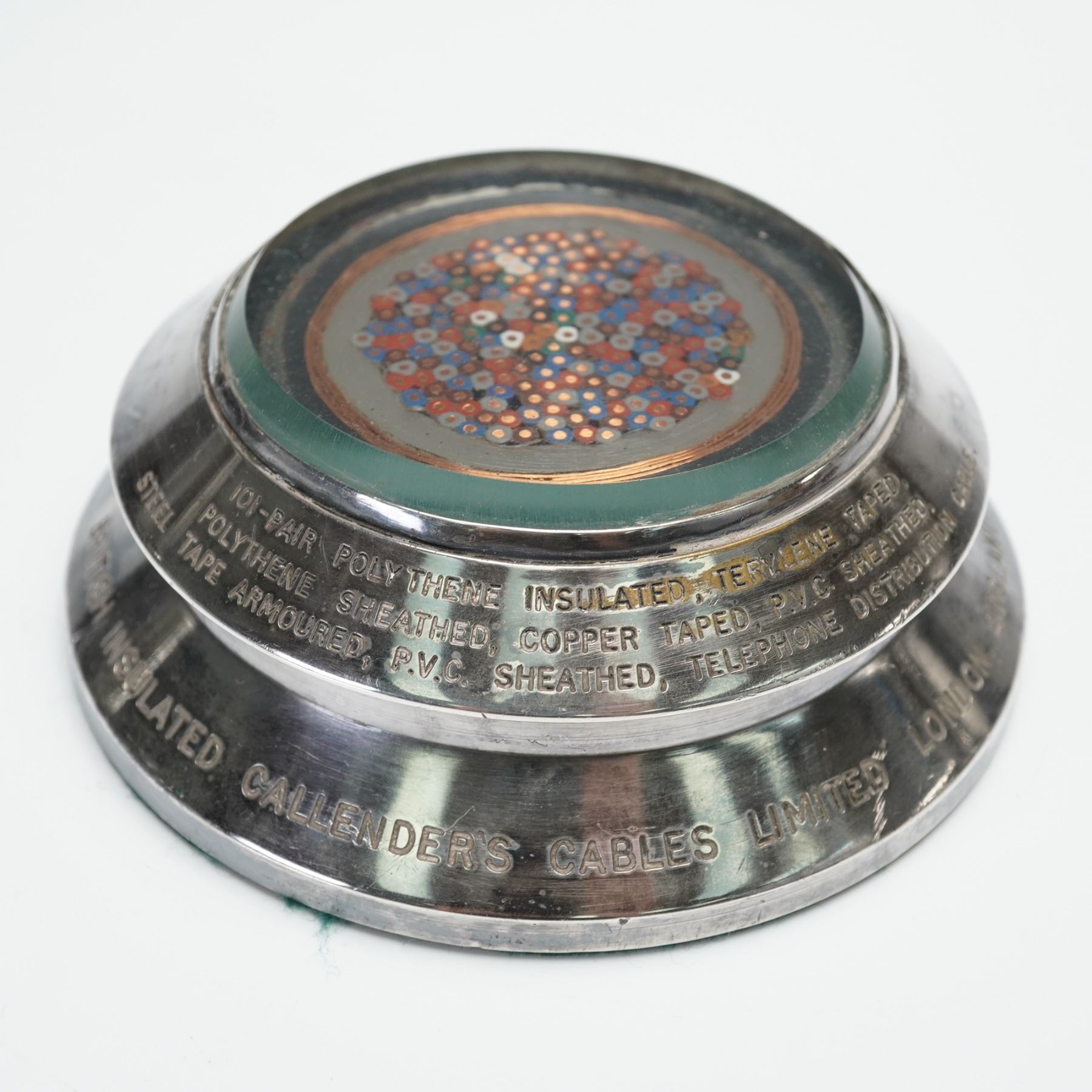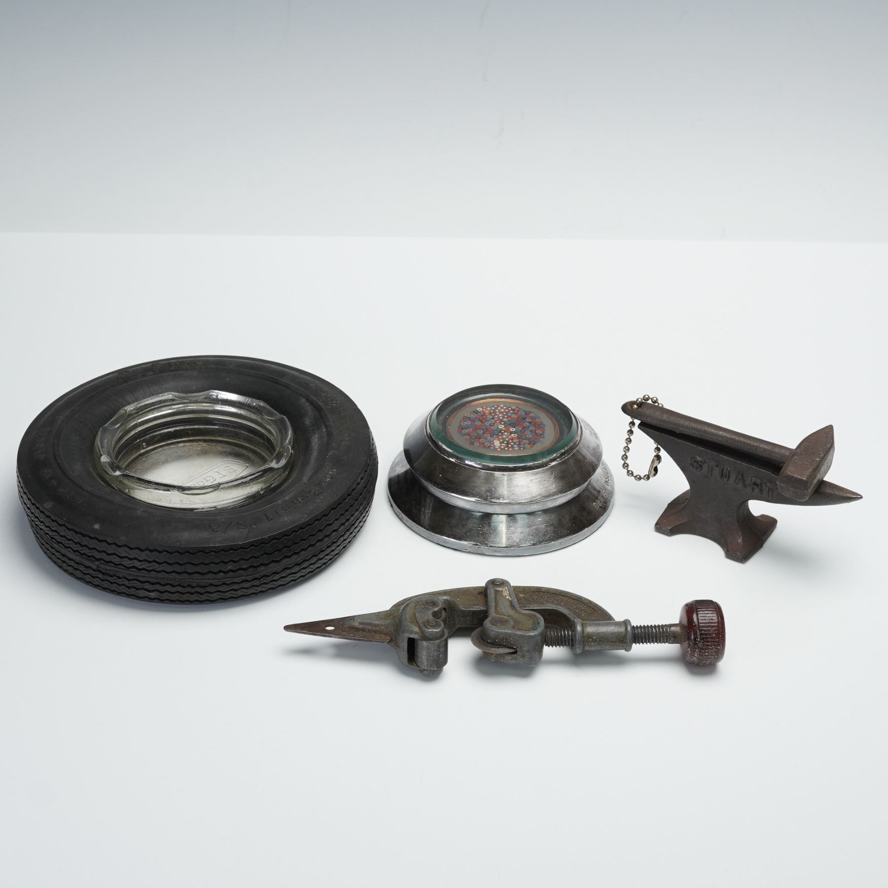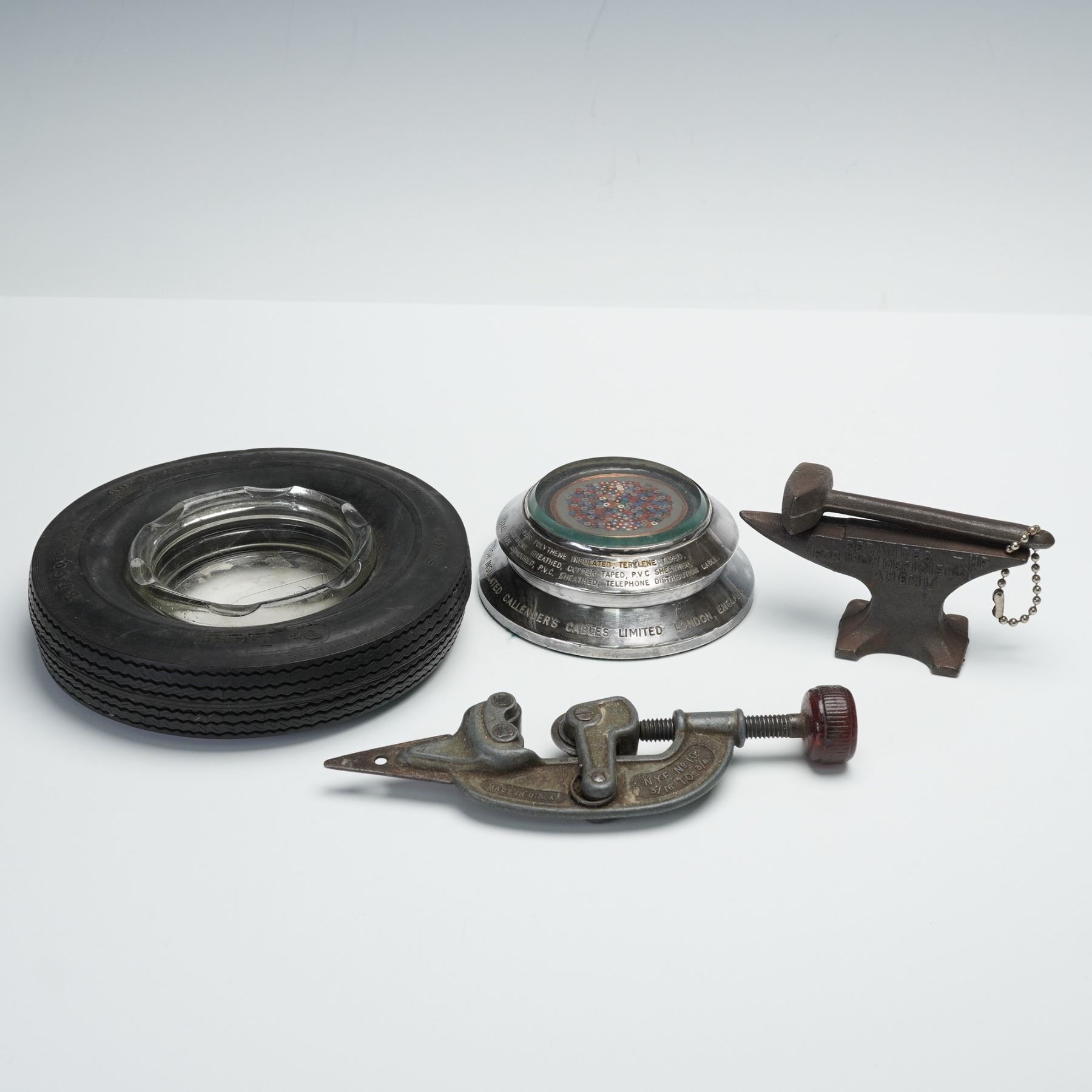 An assorted collection of four advertising wares for various companies and industries. Included is a B.F. Goodrich Advertising tire ashtray with a cut glass removable interior ash plate, a NYE Tool & Machine Co compact pipe tubing cutter, a miniature Stuart Ferancee cast iron medical advertising anvil paperweight. and a British Insulated Callender's Cables Limited cross-section of an armored telephone distribution cable, likely used for underground or direct burial installations.