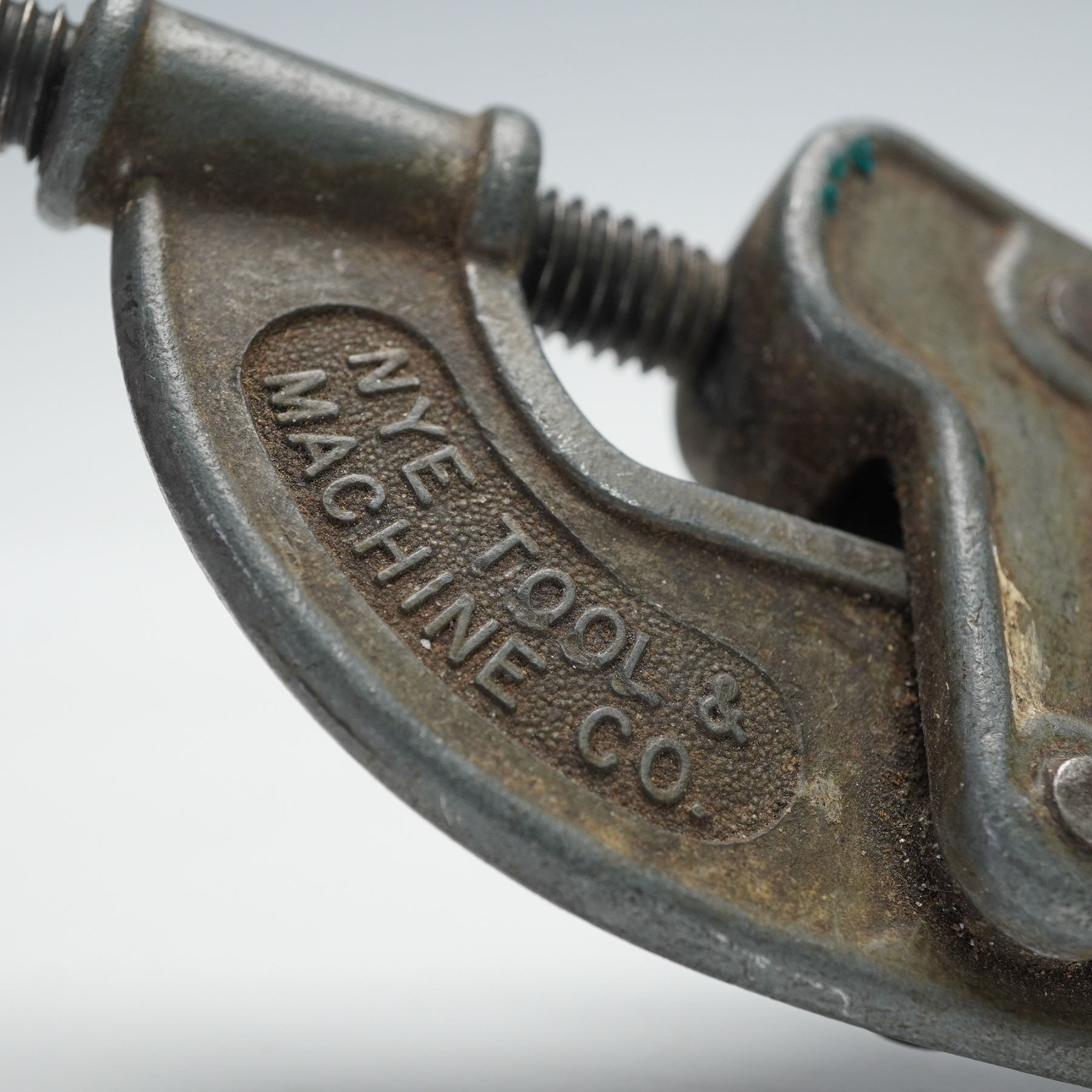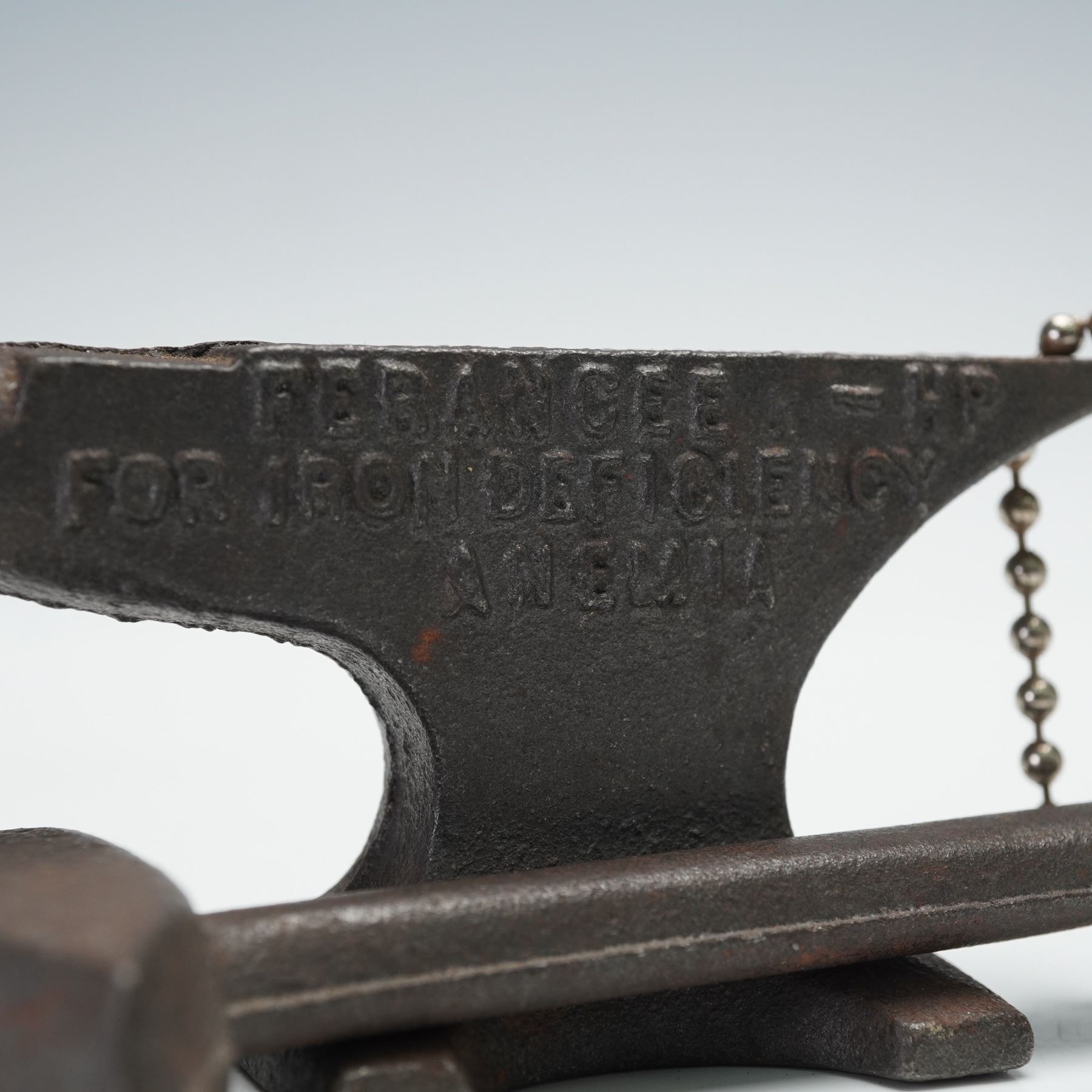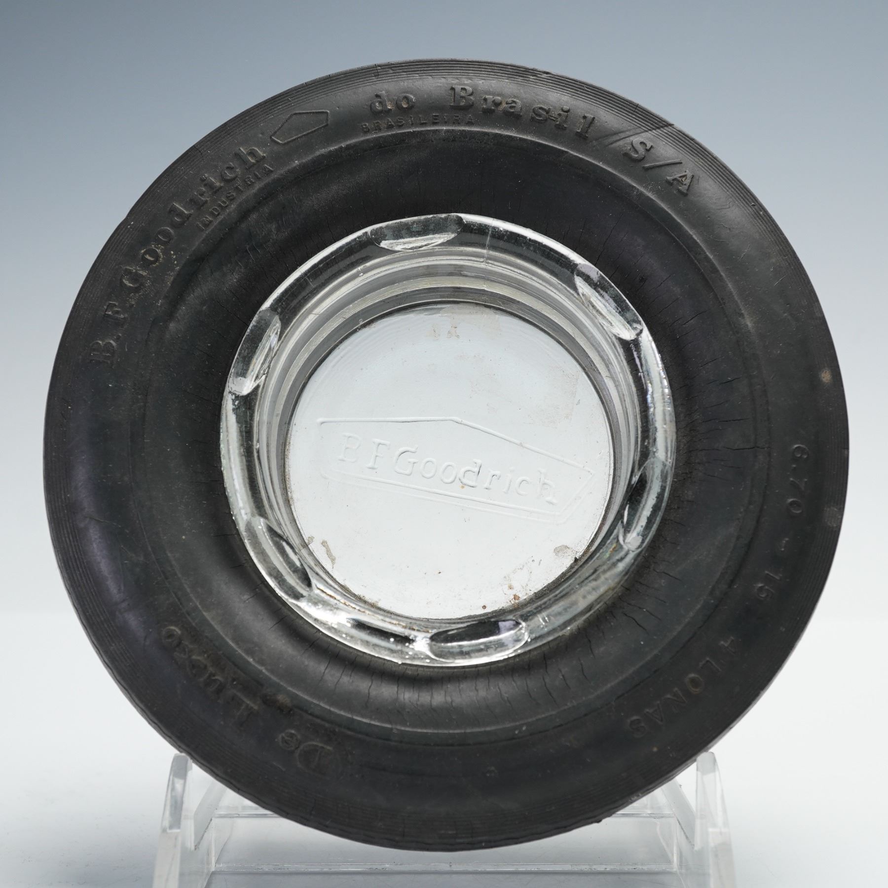 An assorted collection of four advertising wares for various companies and industries. Included is a B.F. Goodrich Advertising tire ashtray with a cut glass removable interior ash plate, a NYE Tool & Machine Co compact pipe tubing cutter, a miniature Stuart Ferancee cast iron medical advertising anvil paperweight. and a British Insulated Callender's Cables Limited cross-section of an armored telephone distribution cable, likely used for underground or direct burial installations.
