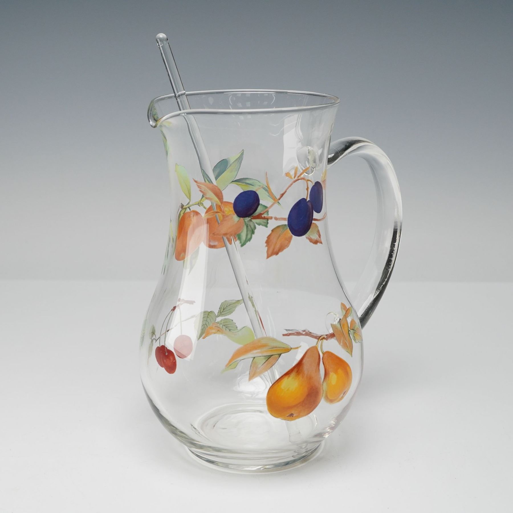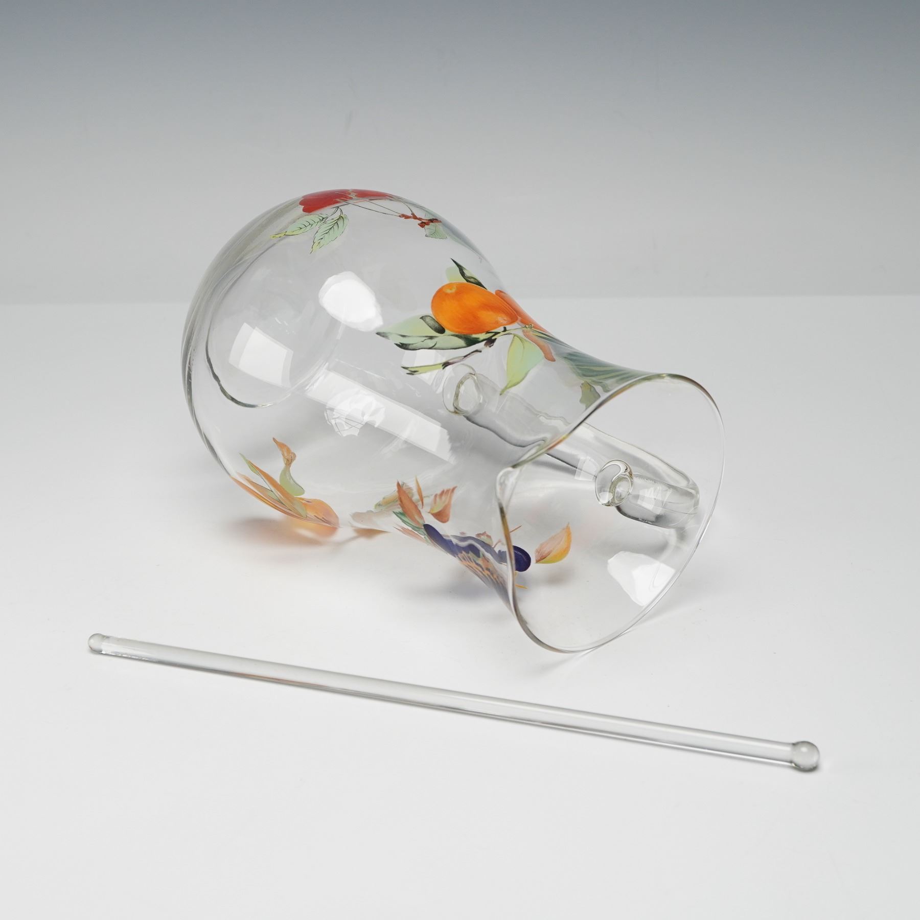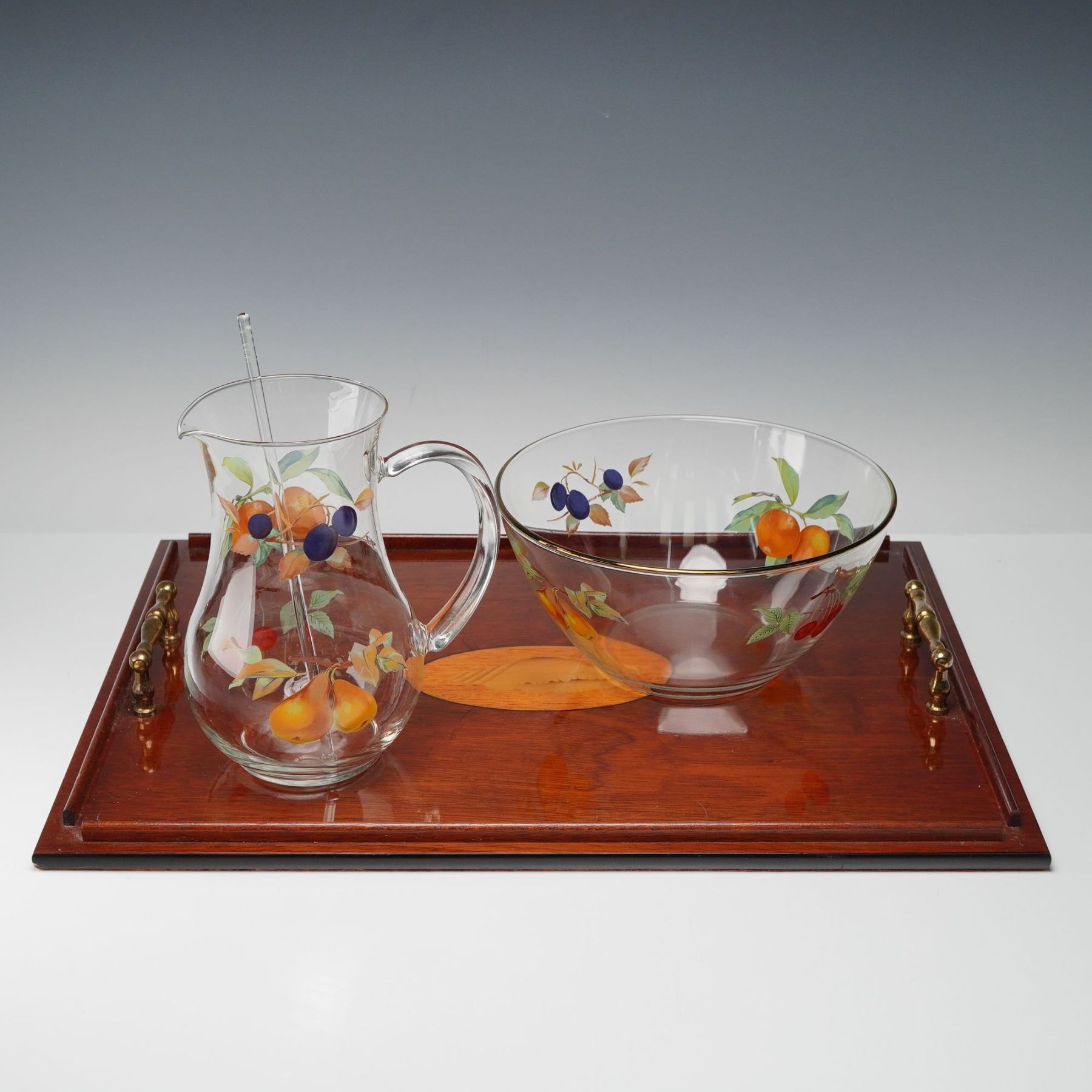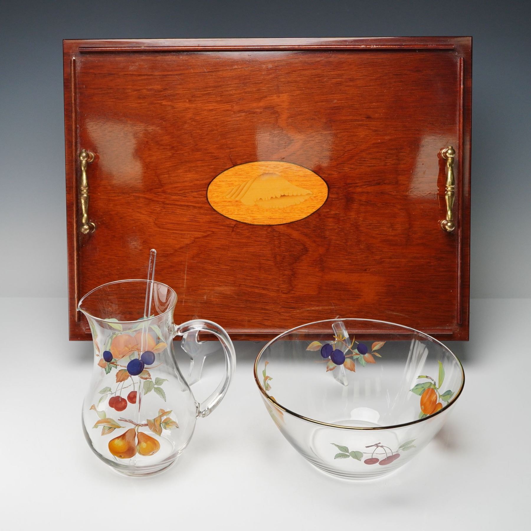 Elegant four-piece serving set including a wooden tray with brass handles and inlaid conch shell medallion, paired with a matching glass bowl and pitcher. The glassware features a delicate fruit motif with cherries, plums, pears, and peaches accented by gilt rim detailing, accompanied by a clear glass stir stick. The tray is finely crafted with a polished mahogany finish and a central marquetry inlay depicting a seashell design.