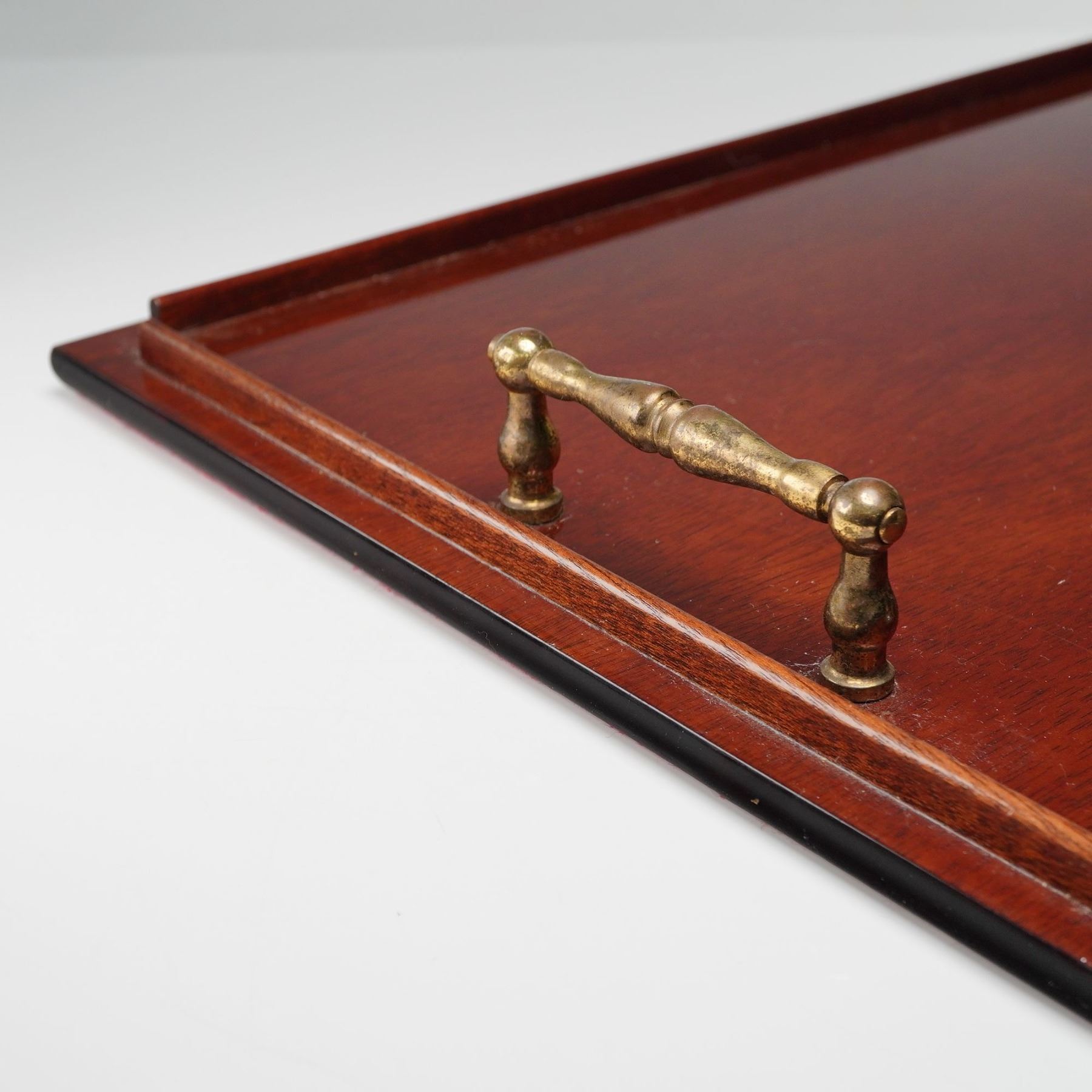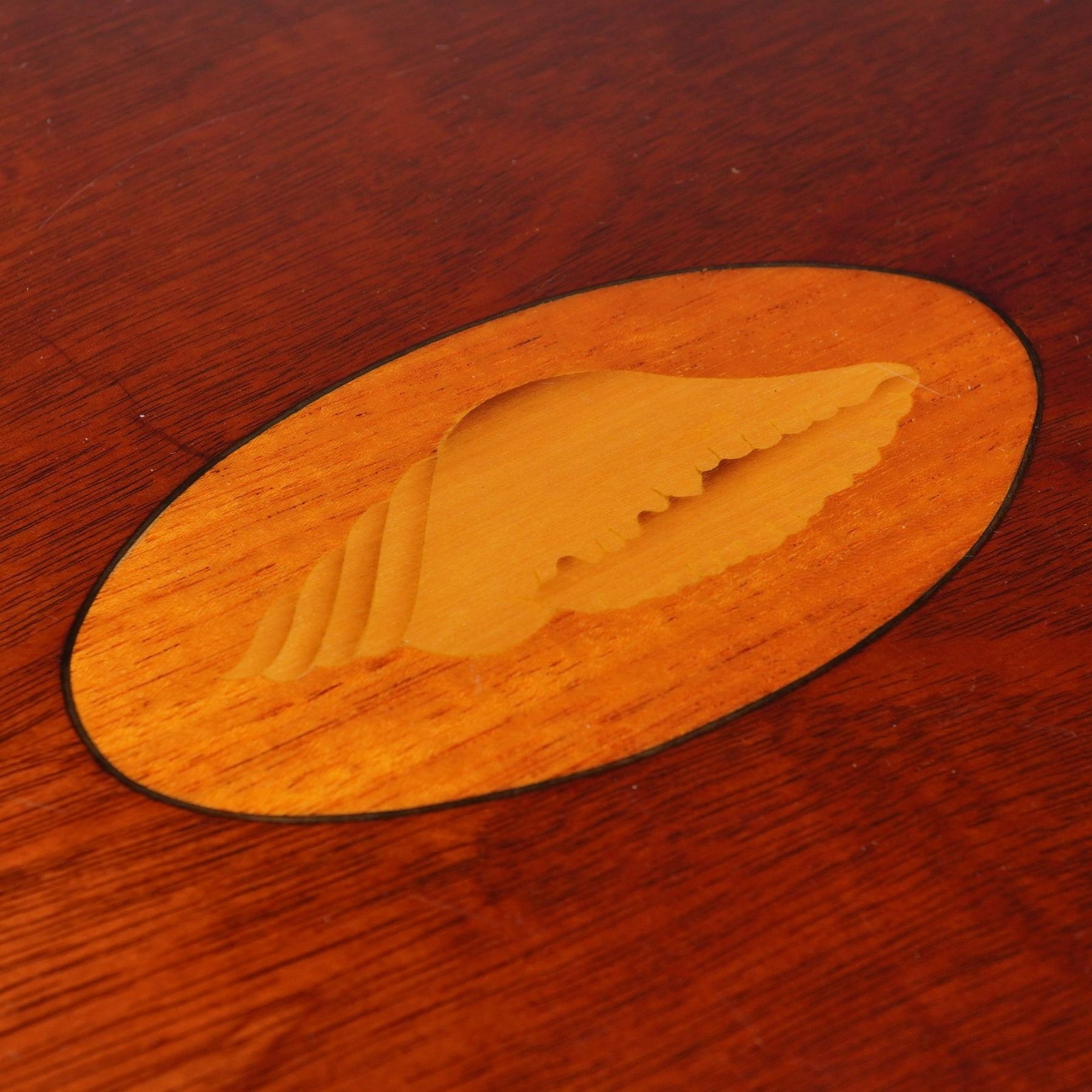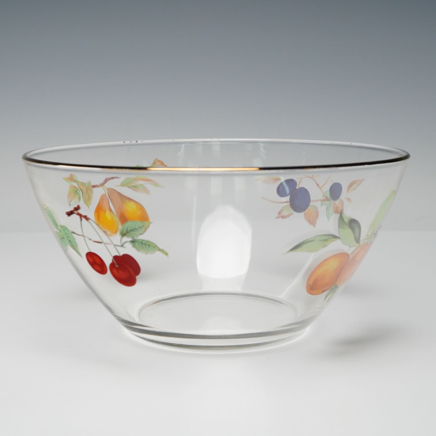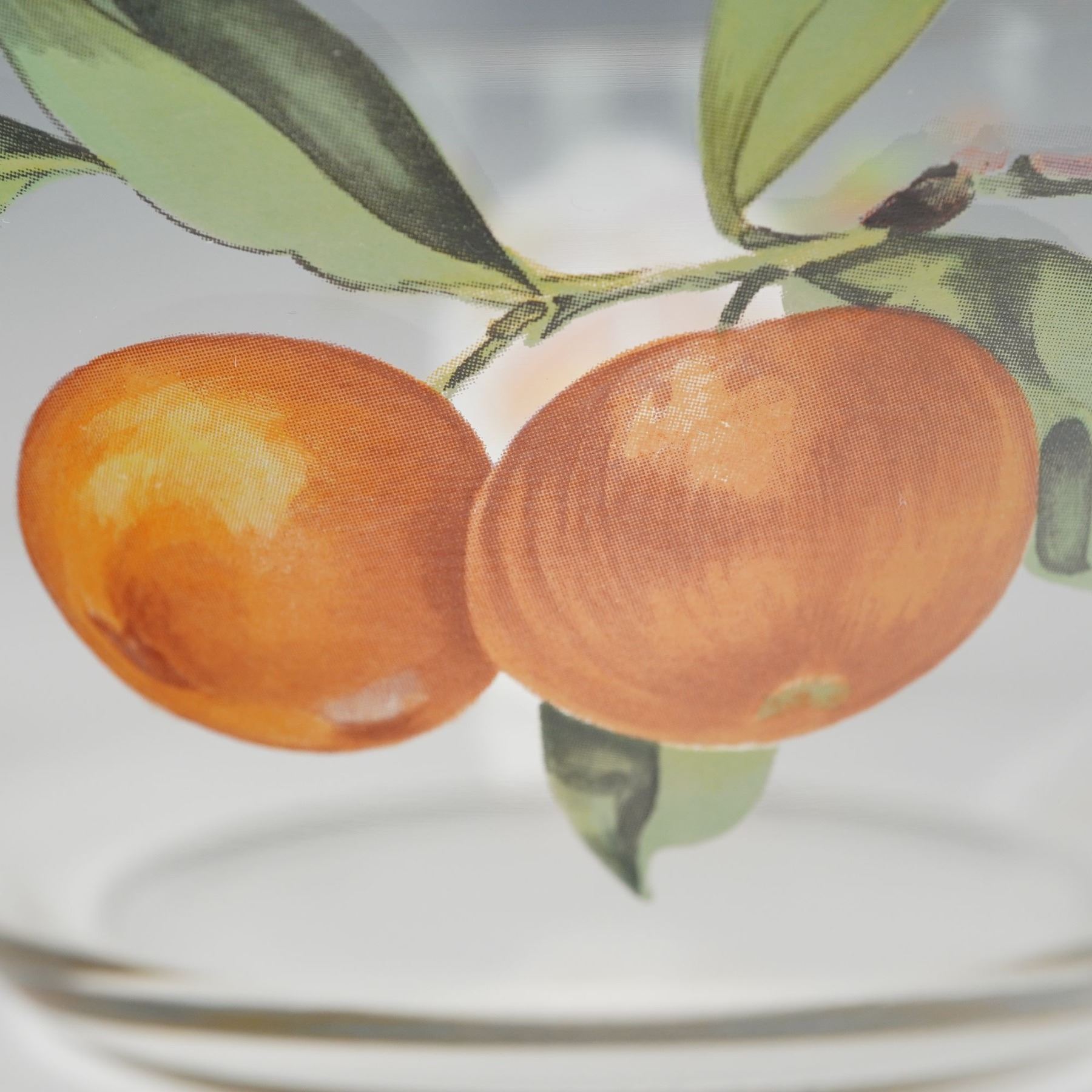 Elegant four-piece serving set including a wooden tray with brass handles and inlaid conch shell medallion, paired with a matching glass bowl and pitcher. The glassware features a delicate fruit motif with cherries, plums, pears, and peaches accented by gilt rim detailing, accompanied by a clear glass stir stick. The tray is finely crafted with a polished mahogany finish and a central marquetry inlay depicting a seashell design.