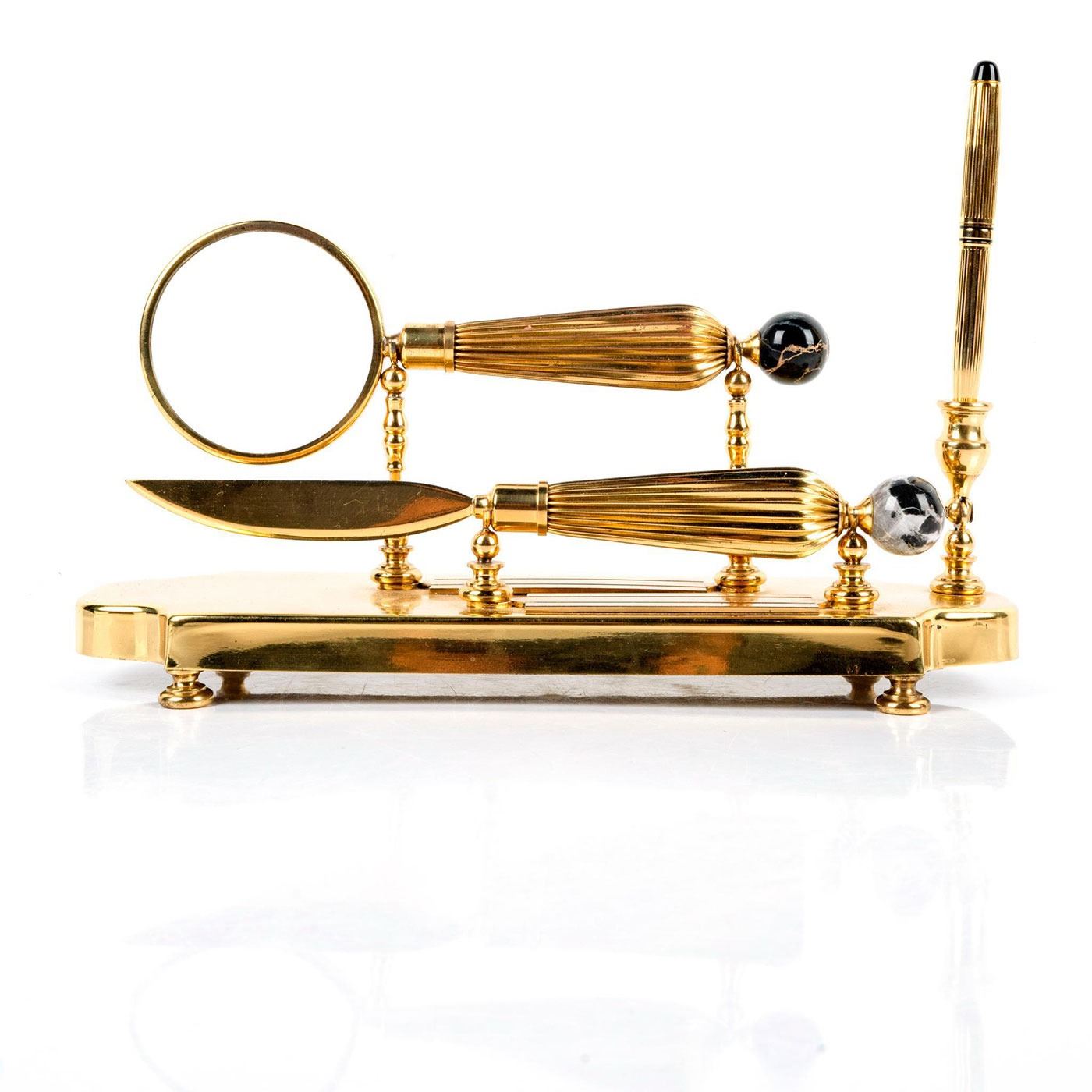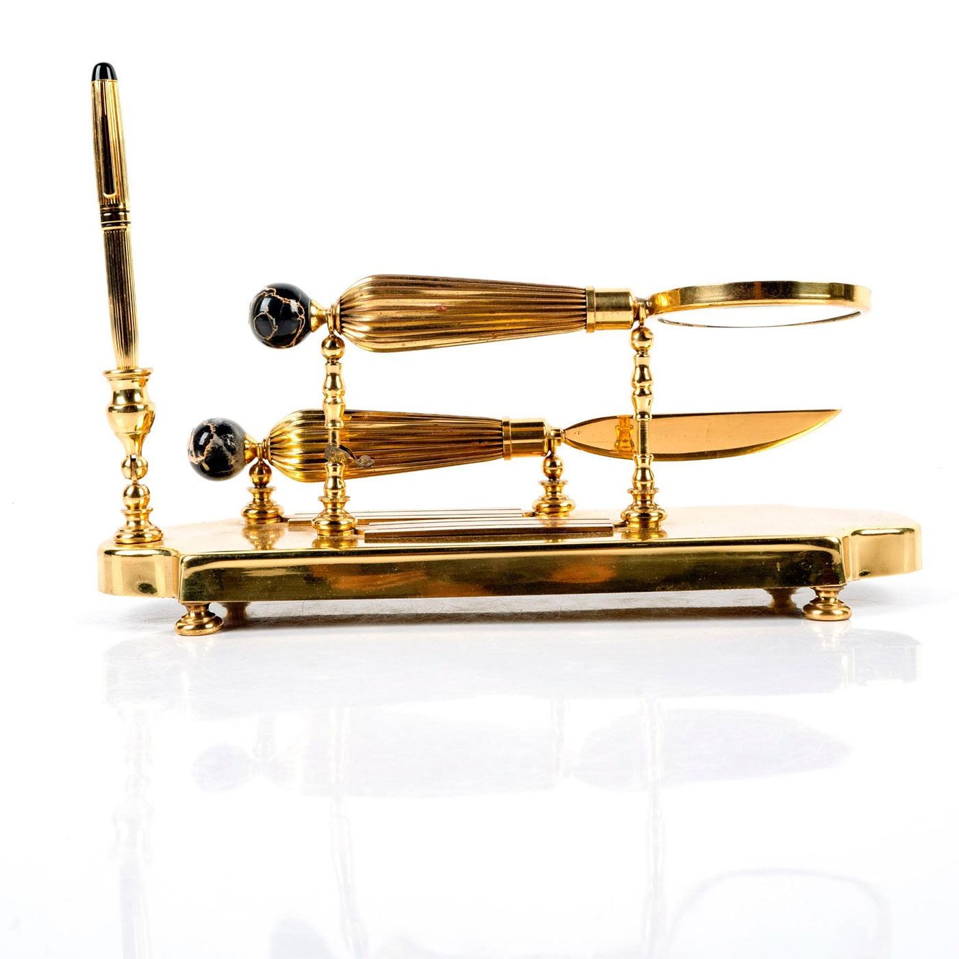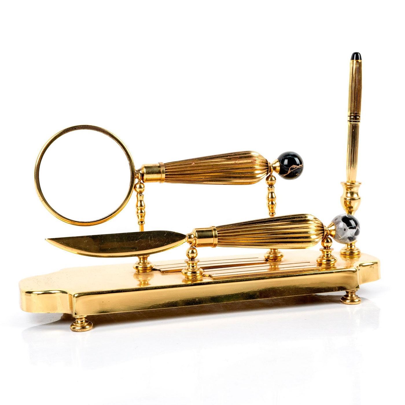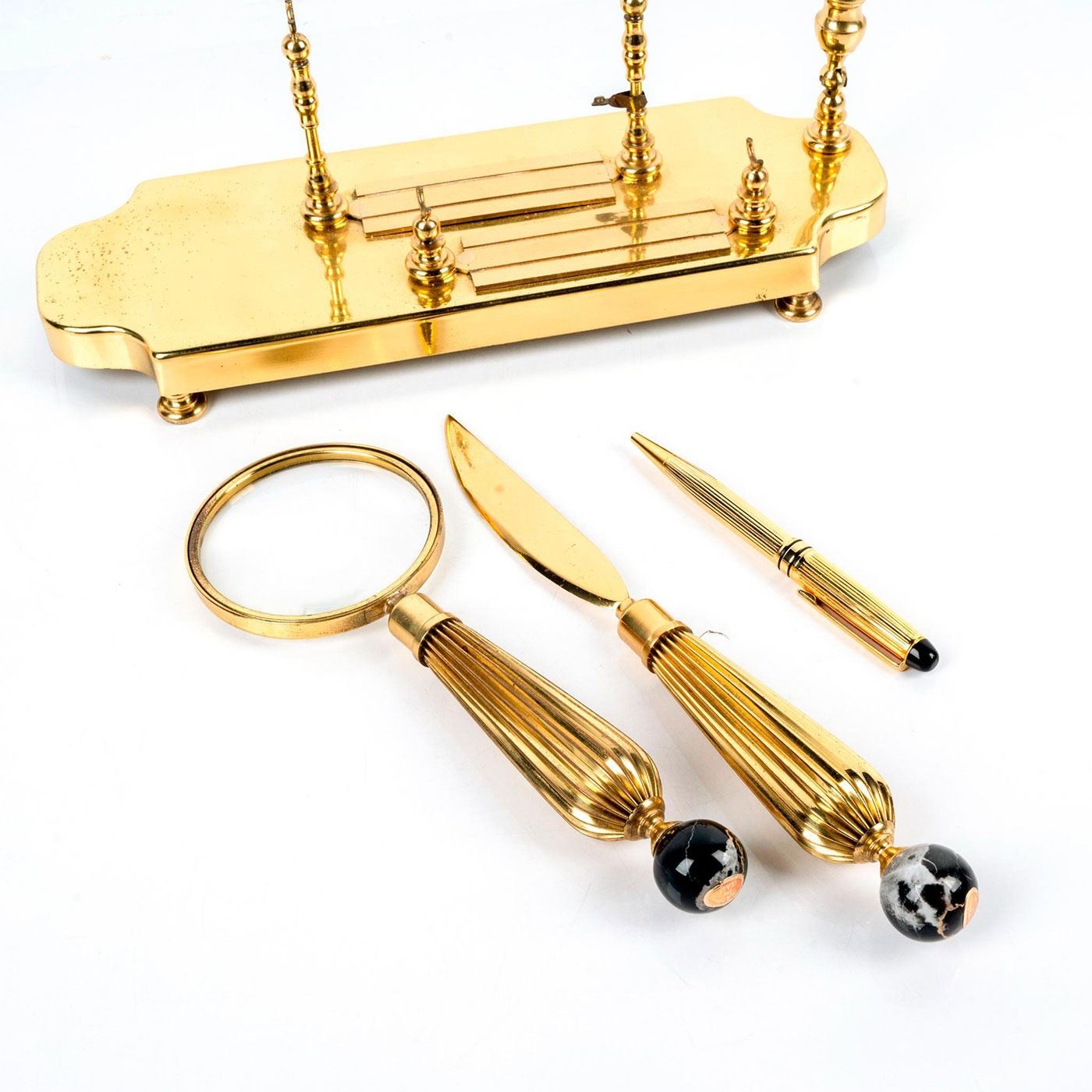 Contains magnifying glass, letter opener, pen, and stand. Marbleized rounded handles on magnifying glass and letter opener. Made In Italy factory label to handles.