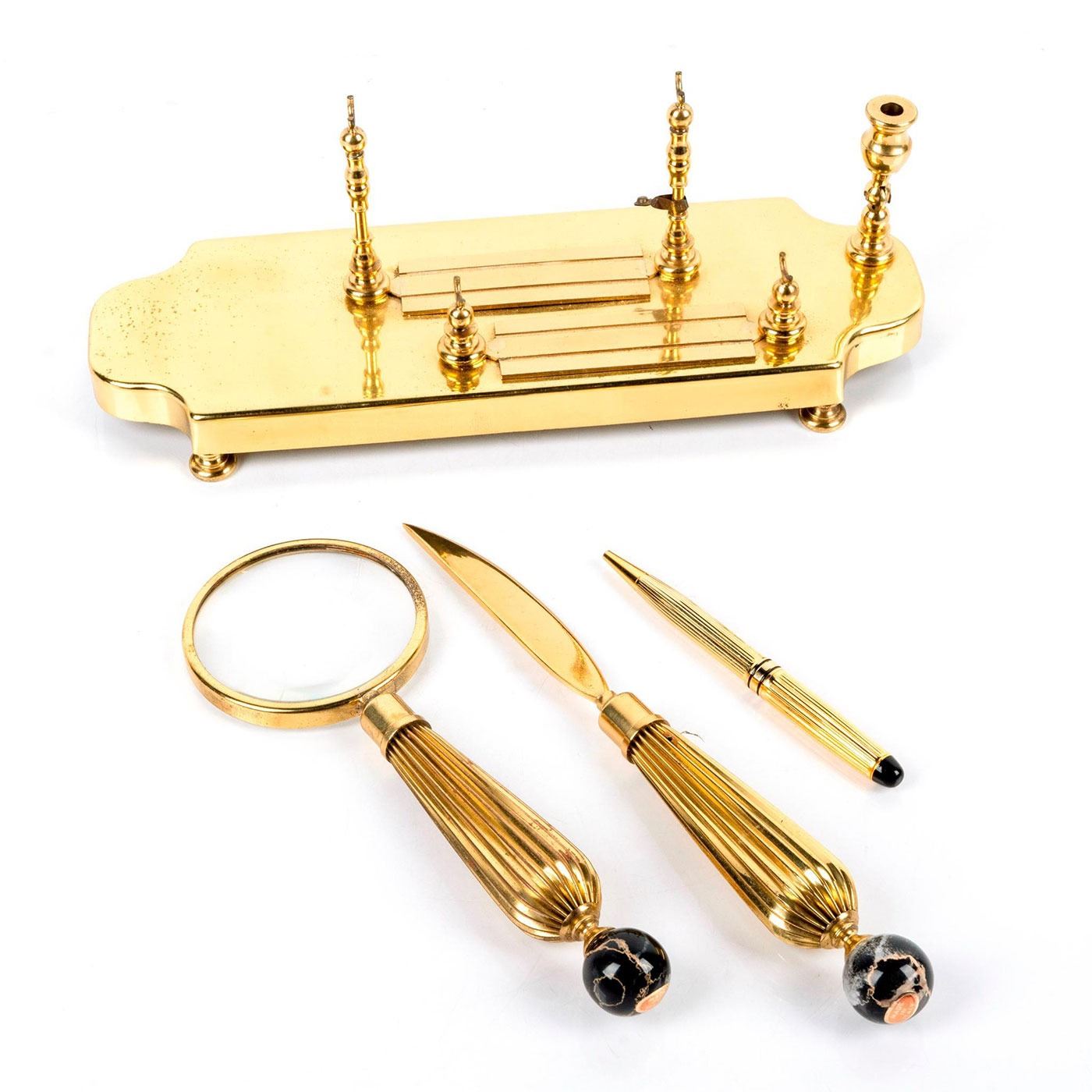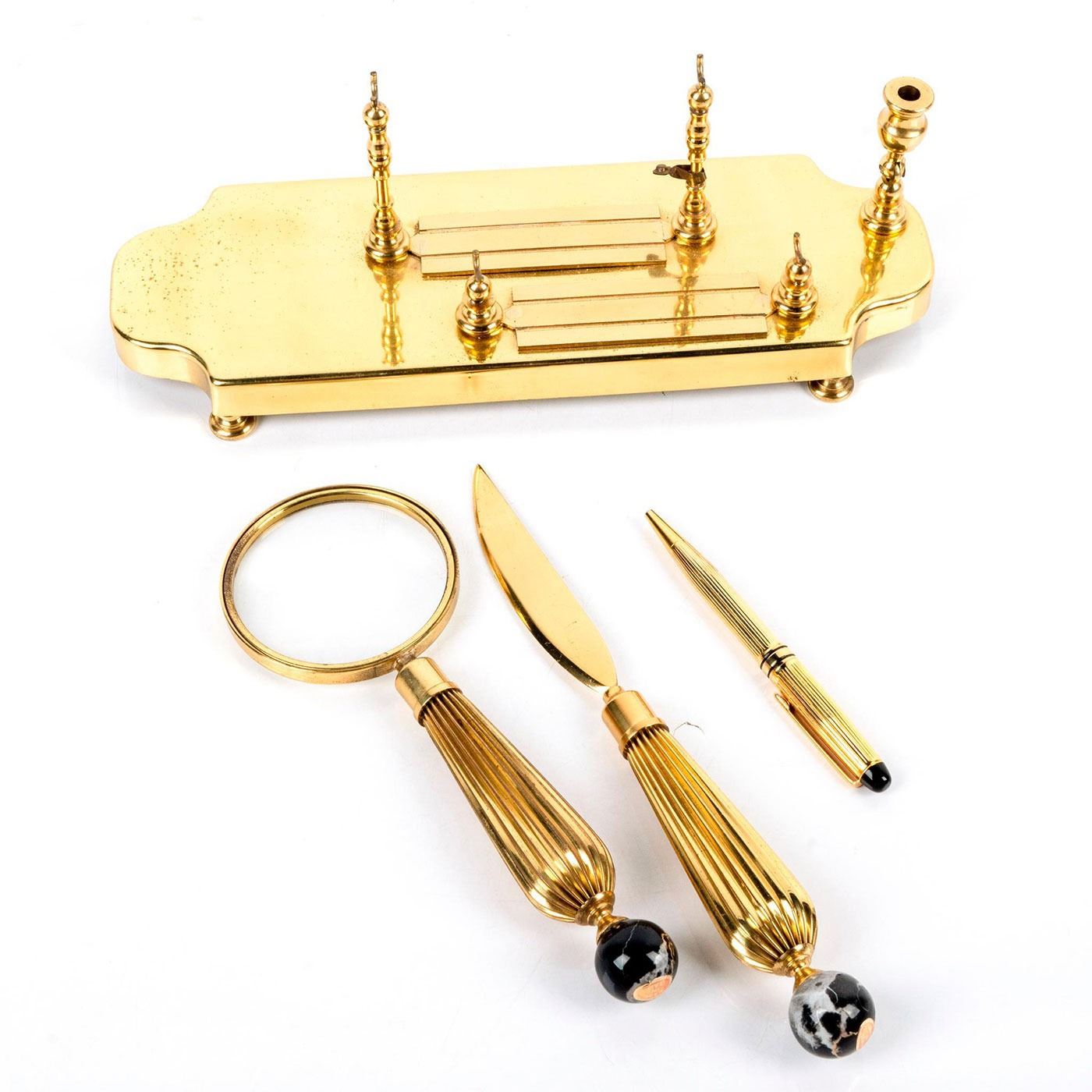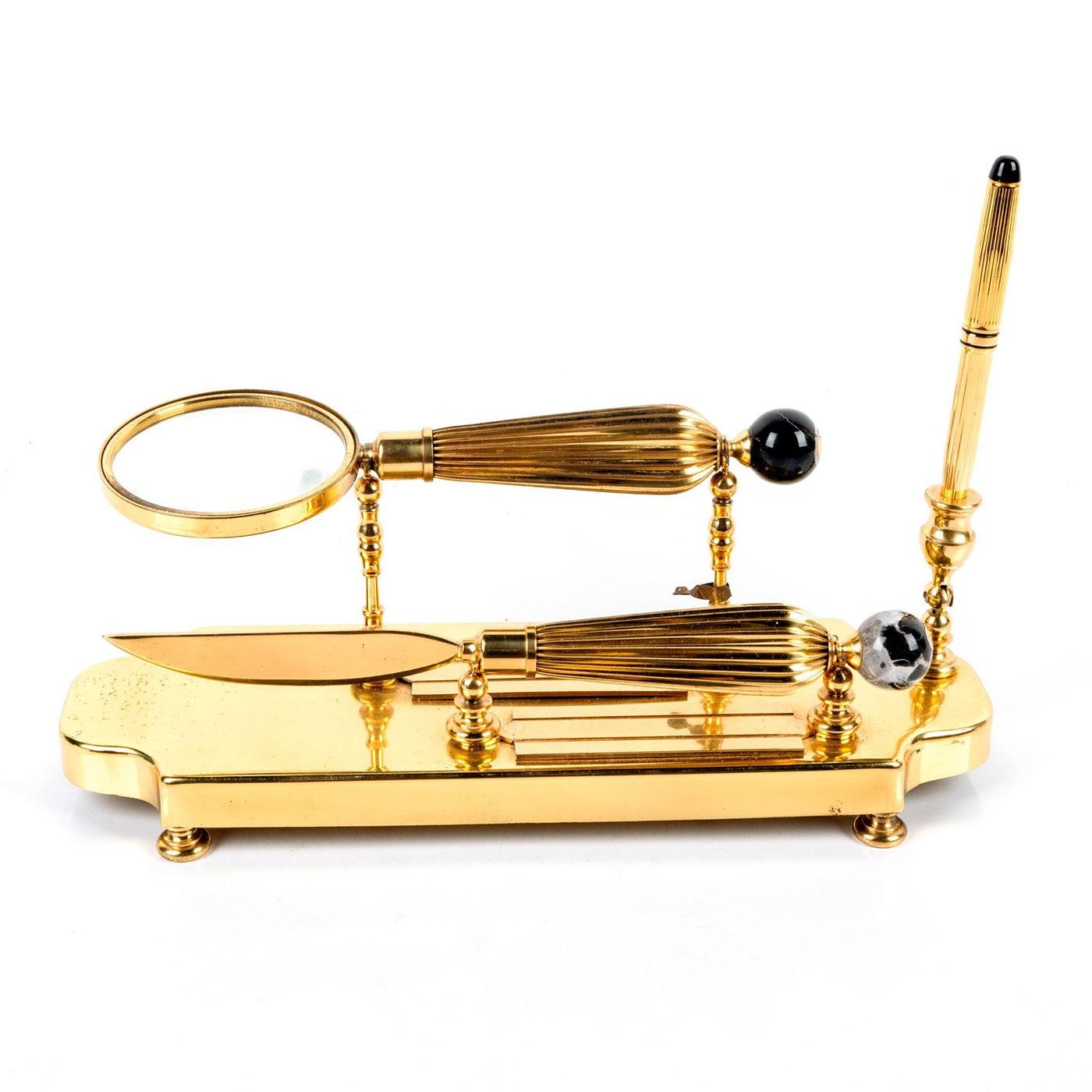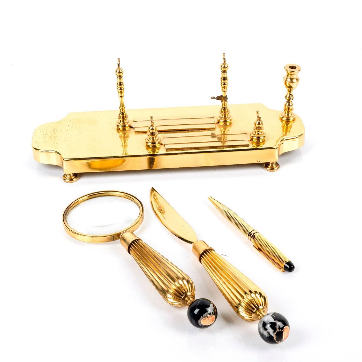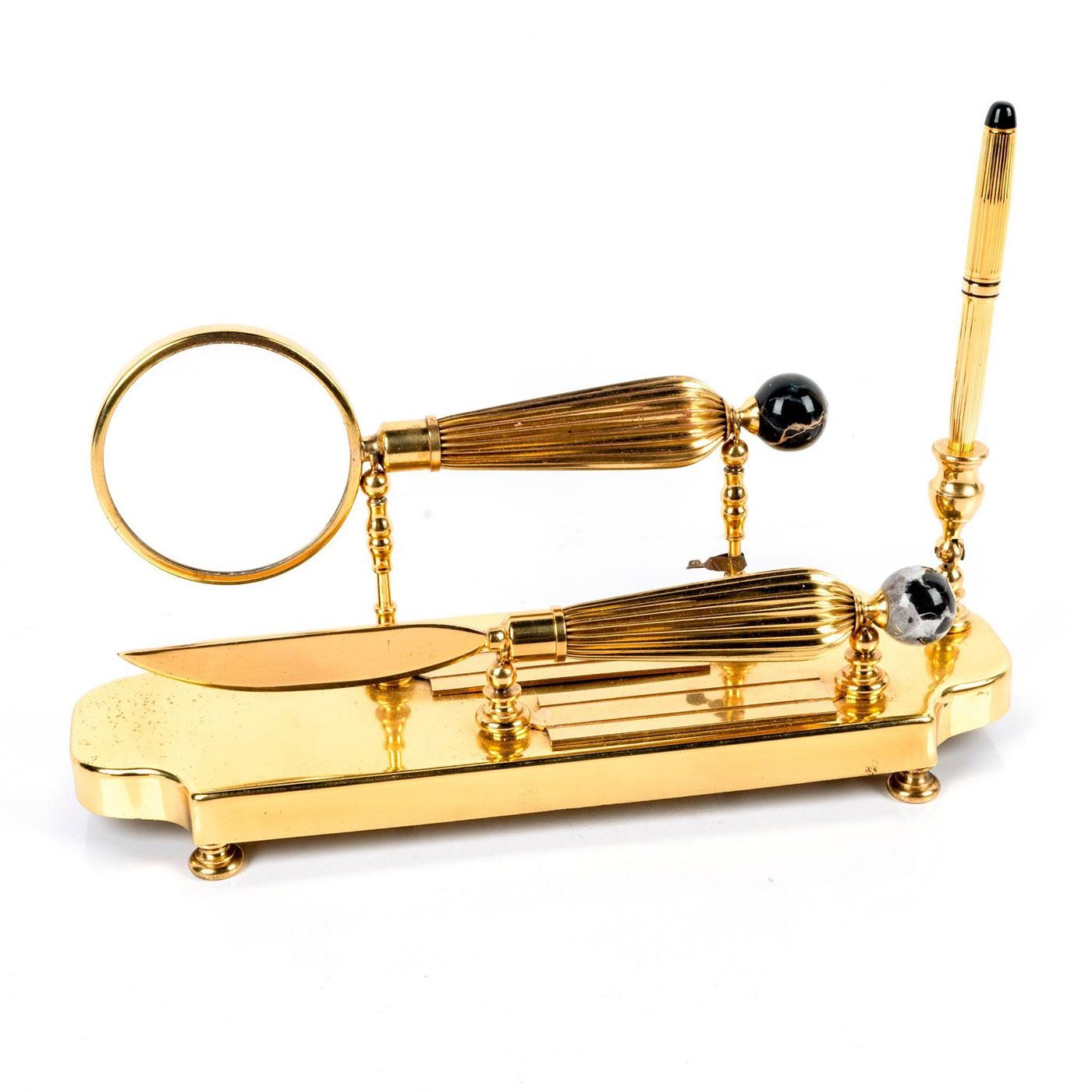 Contains magnifying glass, letter opener, pen, and stand. Marbleized rounded handles on magnifying glass and letter opener. Made In Italy factory label to handles.
