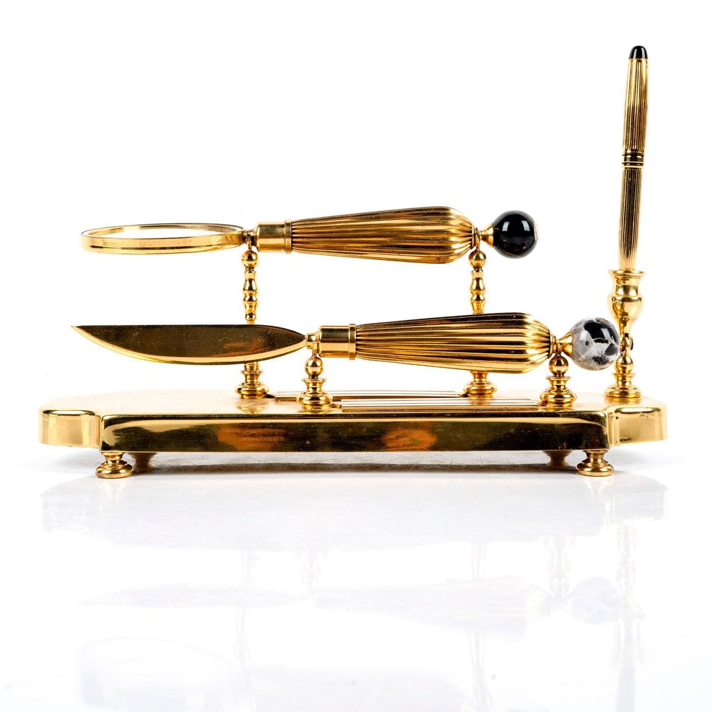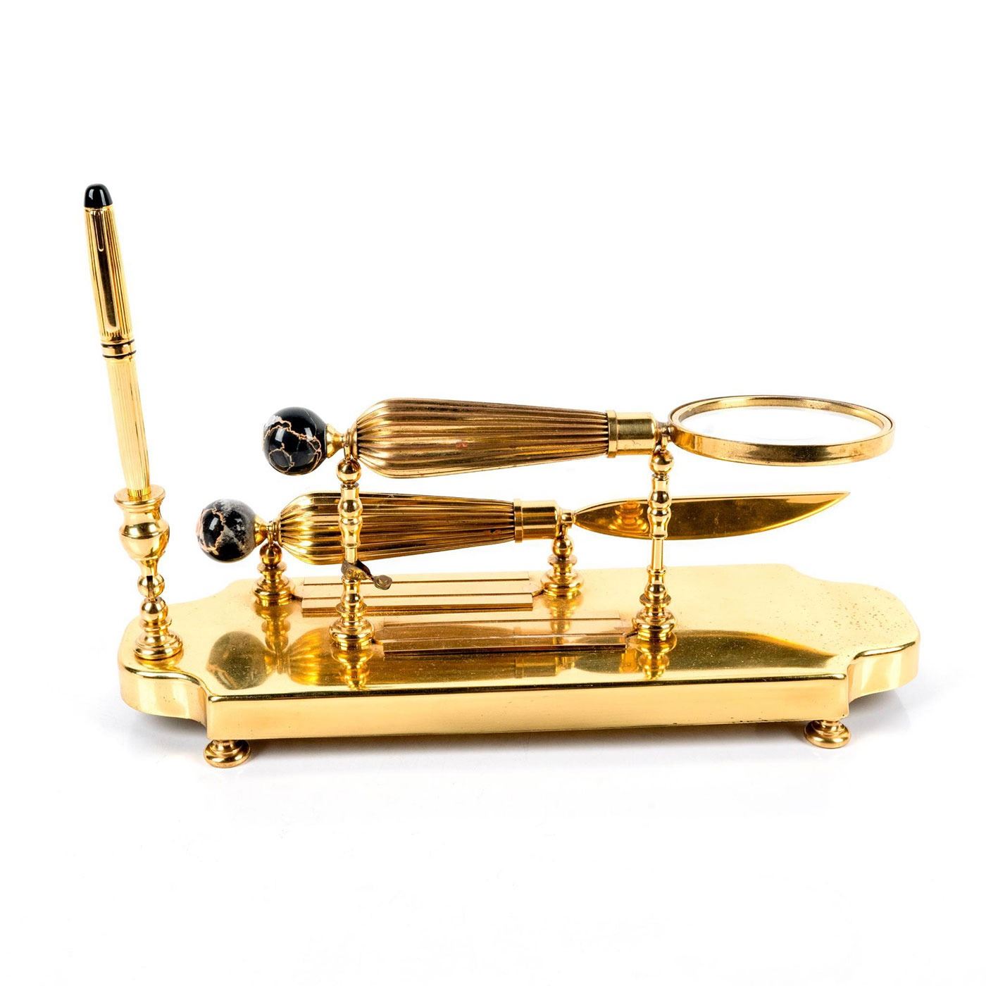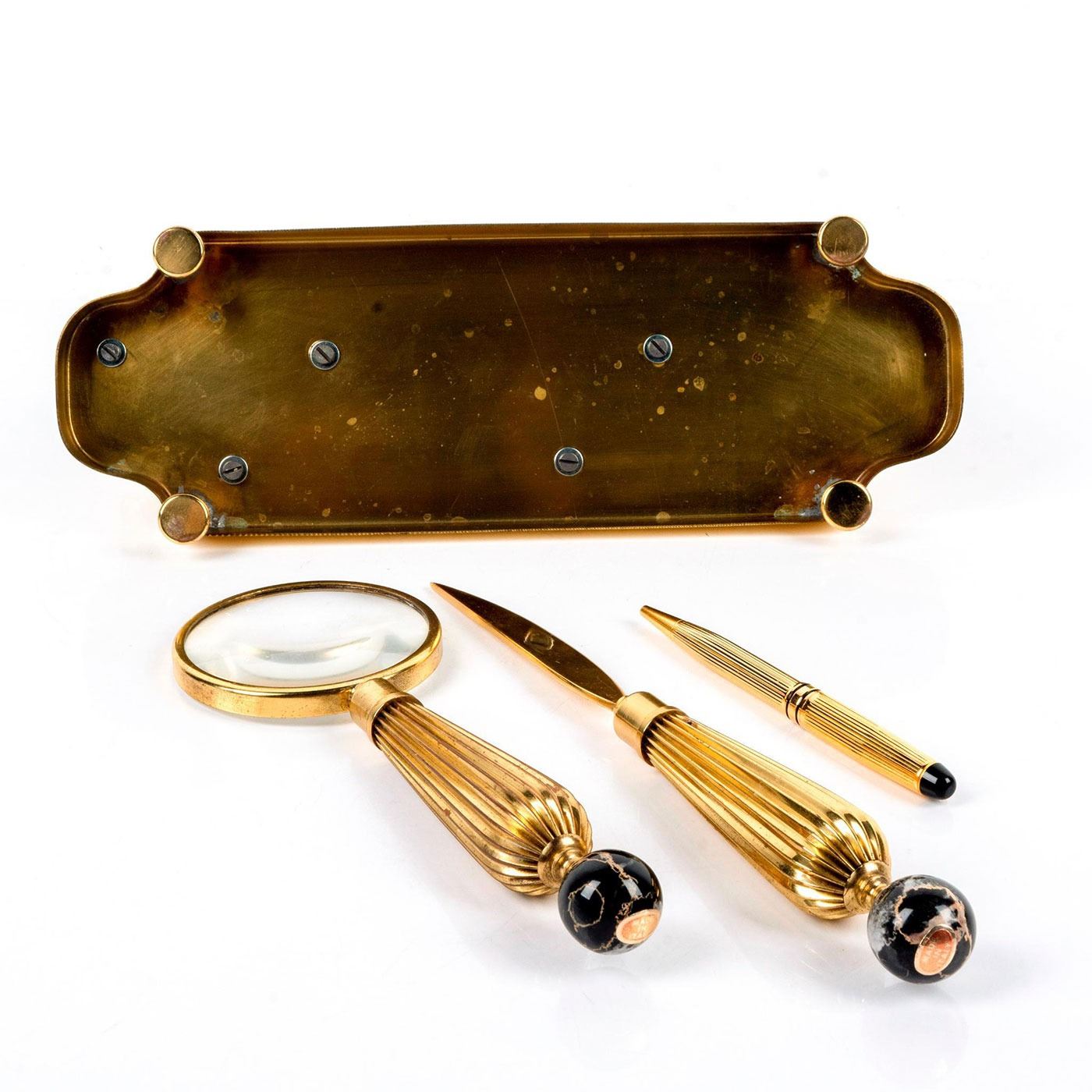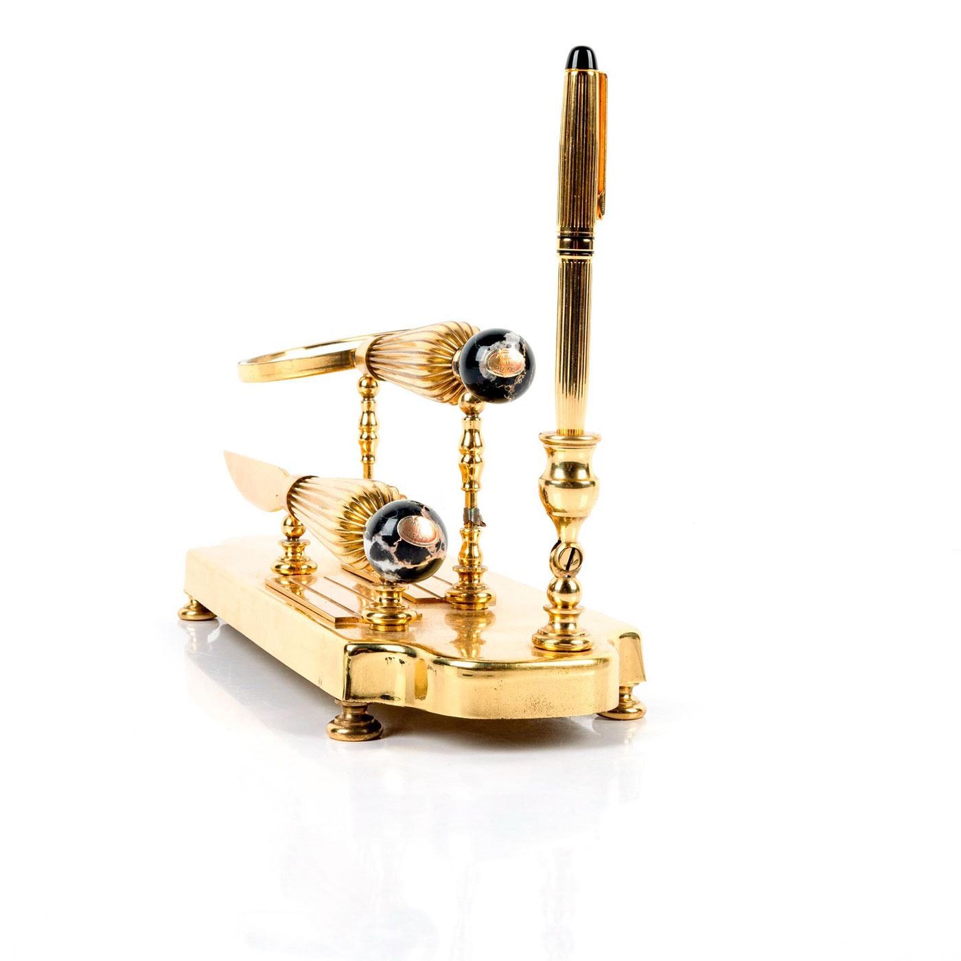 Contains magnifying glass, letter opener, pen, and stand. Marbleized rounded handles on magnifying glass and letter opener. Made In Italy factory label to handles.