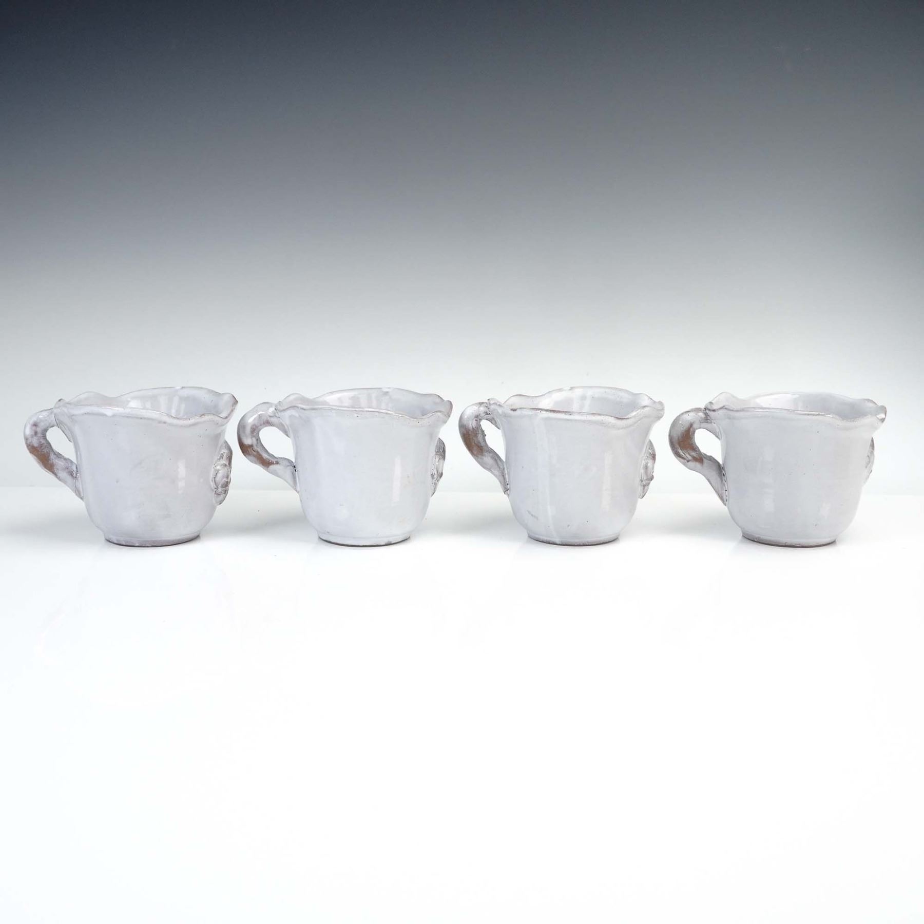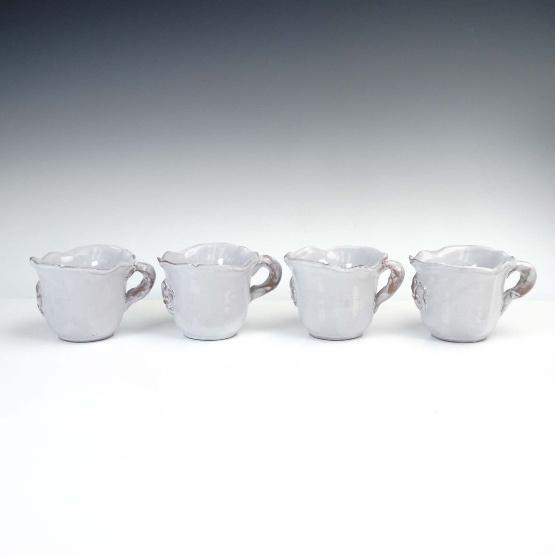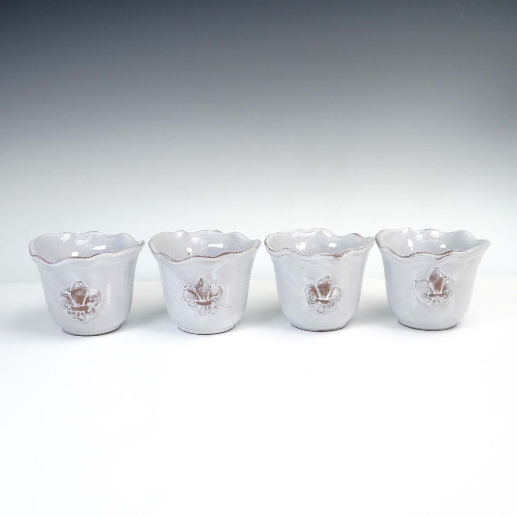 Charming set of four Italian pottery cups, each crafted in a rustic earthenware style and adorned with a raised fleur-de-lis emblem on the front. Finished in a soft, slightly weathered white glaze, these cups feature subtly scalloped rims and elegantly curved handles, offering both decorative and functional appeal. The artisanal glaze finish and handmade detailing give each piece a unique, slightly varied appearance, characteristic. Made in Italy stamped to underside. This item has its original box. Box measures: 9.75"L x 9.5"W x 4.75"H.