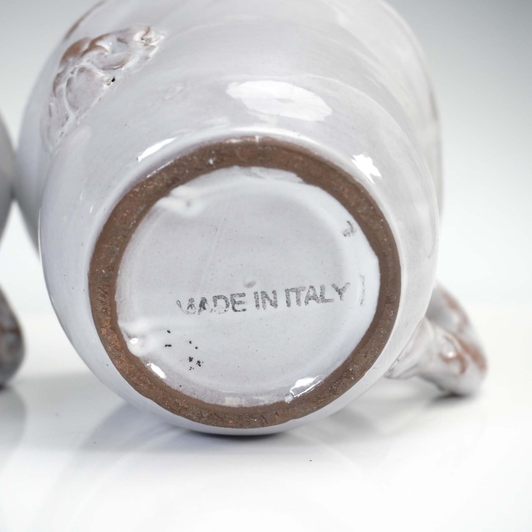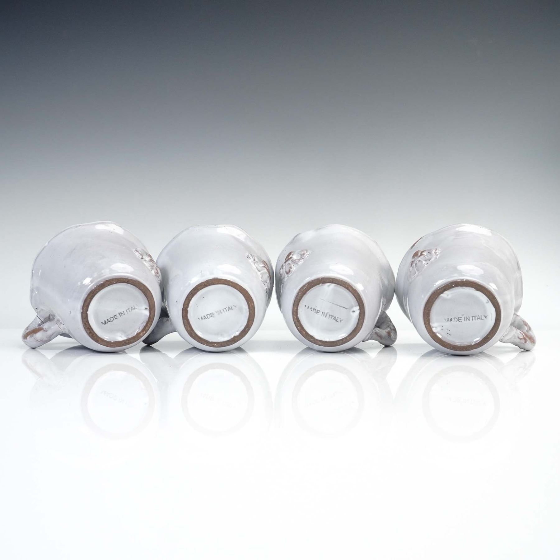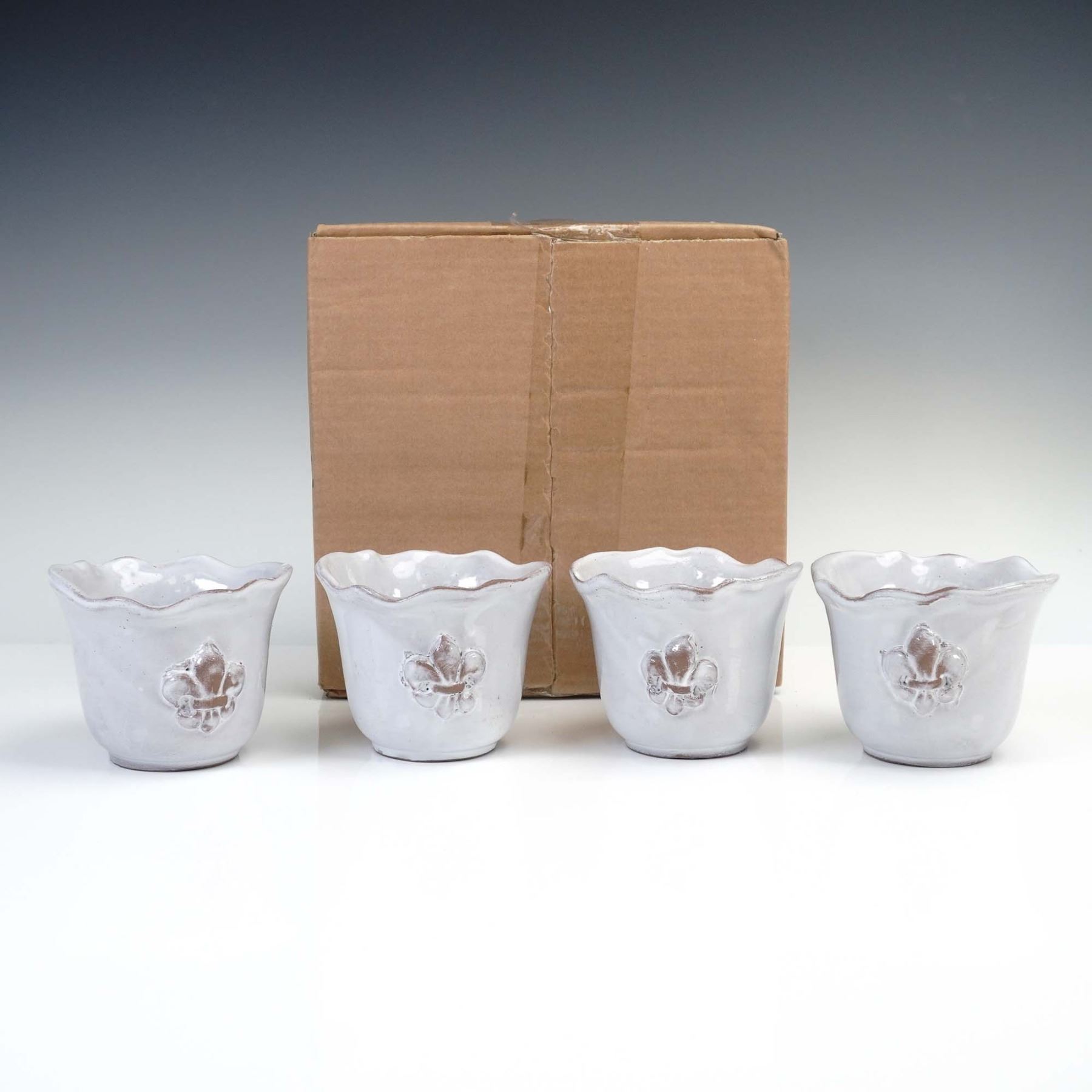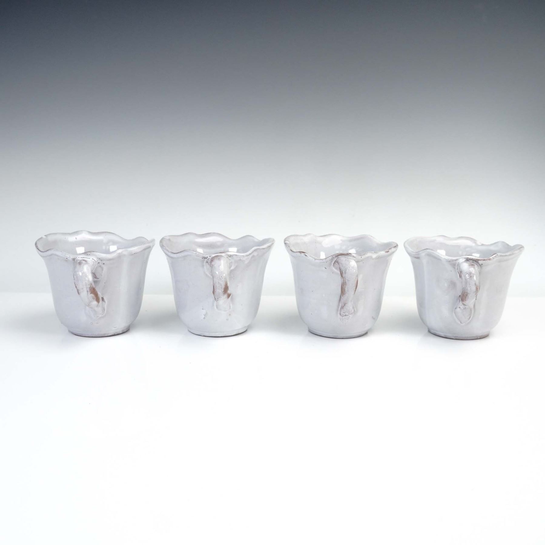 Charming set of four Italian pottery cups, each crafted in a rustic earthenware style and adorned with a raised fleur-de-lis emblem on the front. Finished in a soft, slightly weathered white glaze, these cups feature subtly scalloped rims and elegantly curved handles, offering both decorative and functional appeal. The artisanal glaze finish and handmade detailing give each piece a unique, slightly varied appearance, characteristic. Made in Italy stamped to underside. This item has its original box. Box measures: 9.75"L x 9.5"W x 4.75"H.