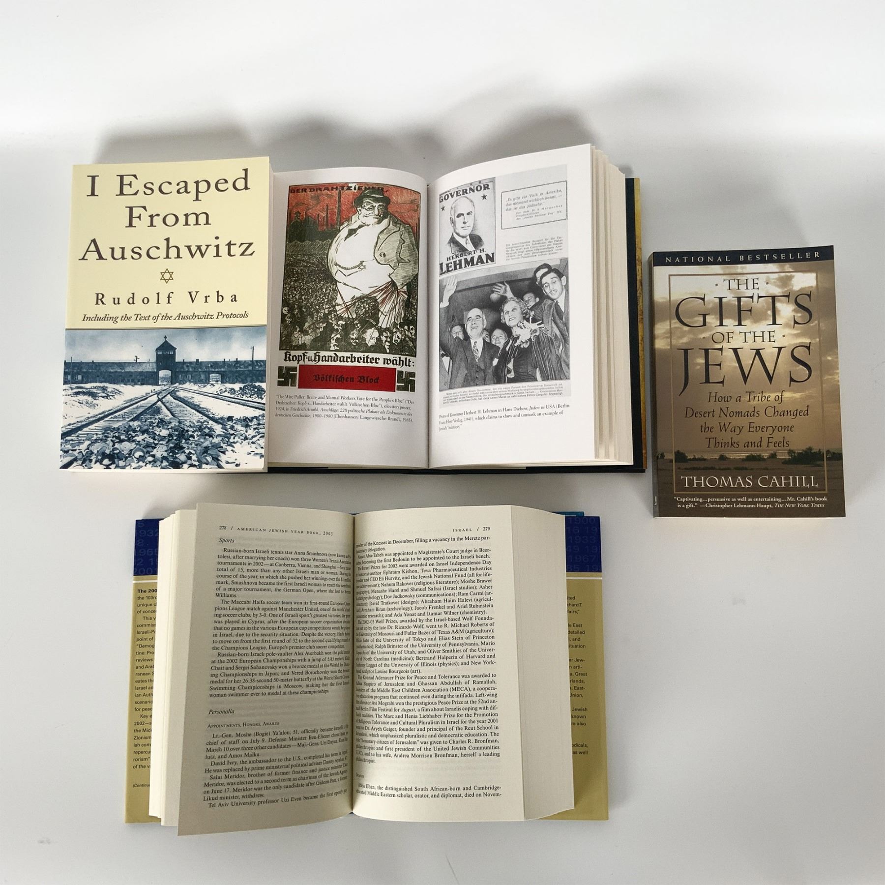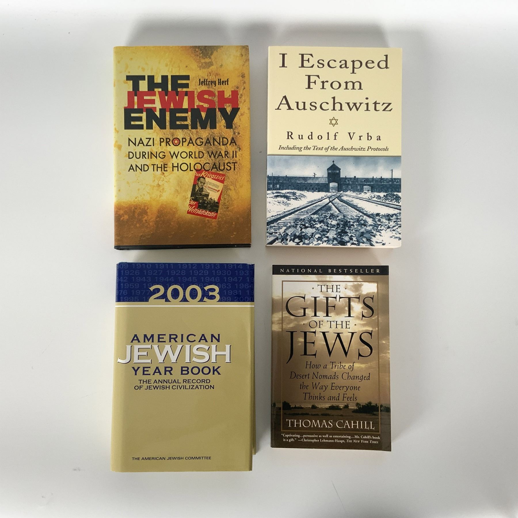 This collection features four significant books exploring Jewish history, culture, and impact. The American Jewish Year Book 2003 serves as a comprehensive record of Jewish civilization, providing insights into contemporary issues and developments. The Gifts of the Jews by Thomas Cahill examines the contributions of Jewish thought to Western civilization, emphasizing how their ideas shaped modern values and philosophy. The Jewish Enemy by Jeffrey Herf analyzes Nazi propaganda during World War Two, revealing the rhetoric that fueled the Holocaust. I Escaped from Auschwitz by Rudolf Vrba is a firsthand account of survival and escape from one of historys most infamous concentration camps, including the crucial Auschwitz Protocols. This collection offers a profound exploration of Jewish history, persecution, and cultural contributions. Largest item measures: 5.75"L x 2.5"W x 8.5"H.