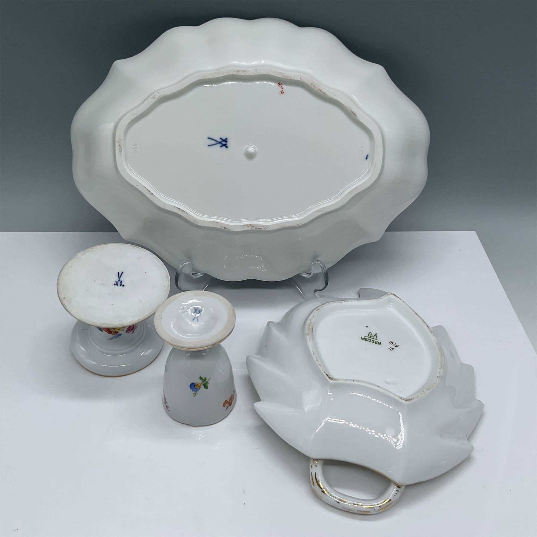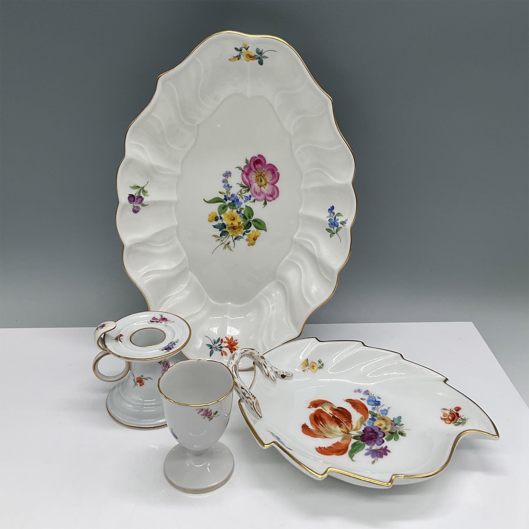 Elegant 4-piece Meissen porcelain serving set featuring hand-painted floral motifs and gilded accents. The set includes an oval serving platter 10.5"W x 2"H, a leaf-shaped handled dish, an egg cup, and a candlestick holder. Each piece showcases intricate craftsmanship with vibrant floral arrangements and delicate gold trim. The underside of the pieces bears Meissen's iconic crossed swords mark, confirming authenticity. A remarkable addition to any fine porcelain collection.