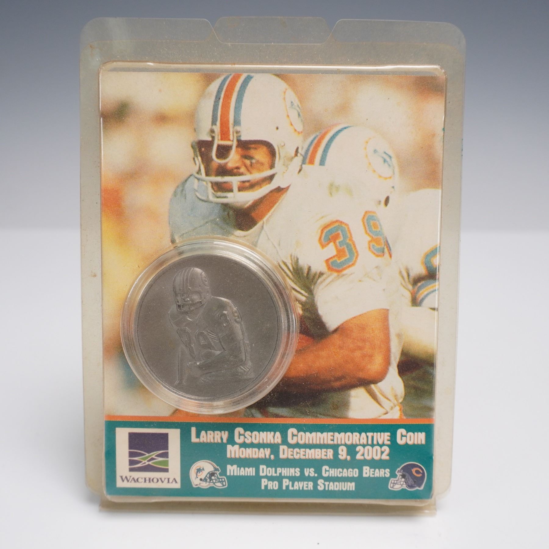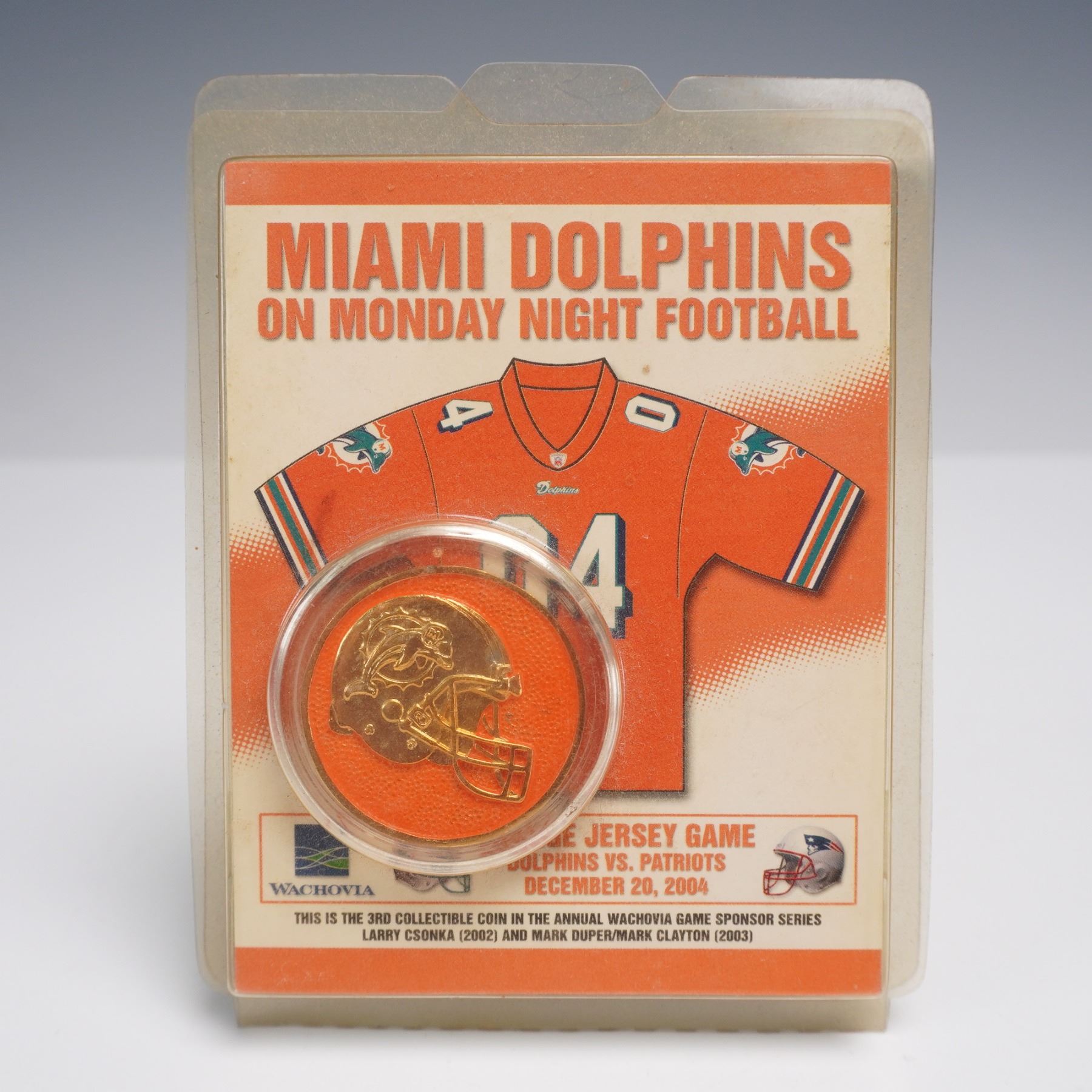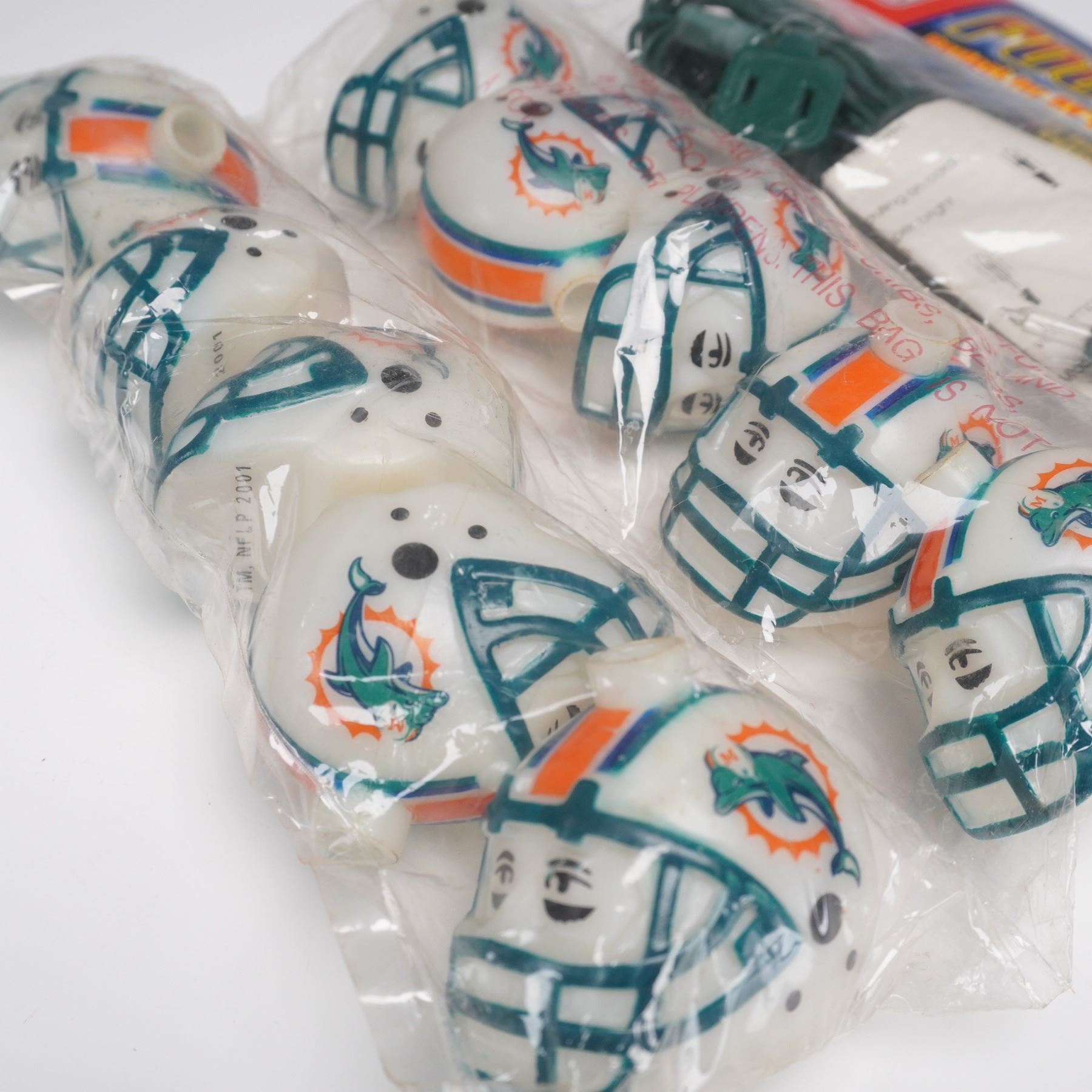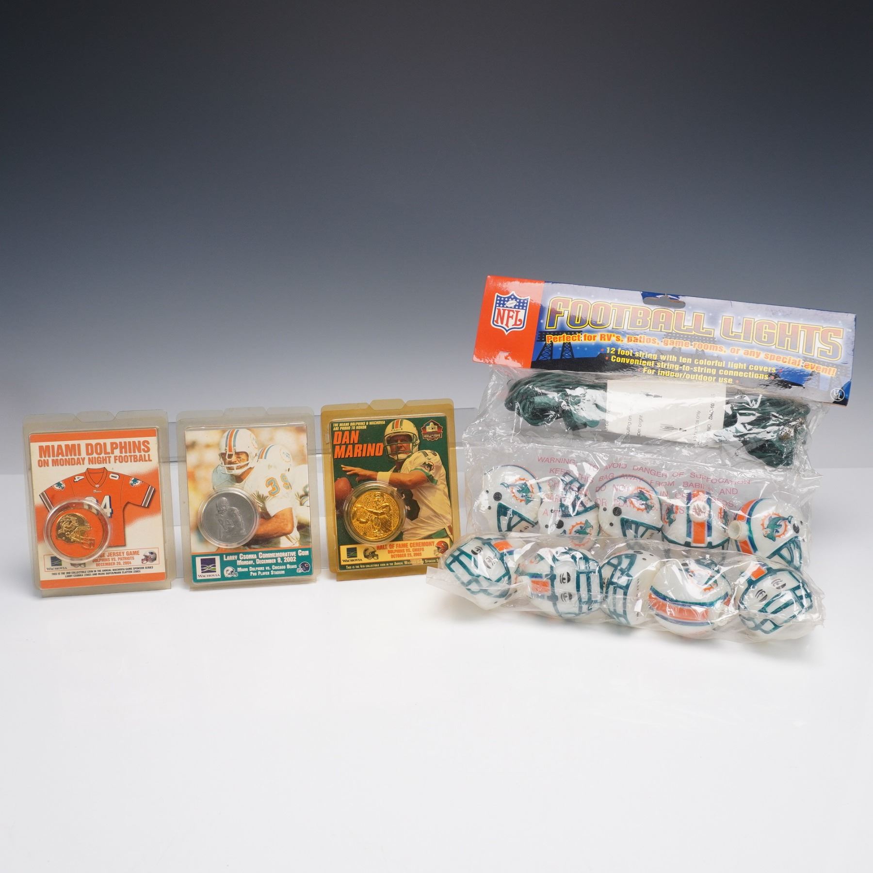 Miami Dolphins collectibles including three commemorative coins in original plastic display cards"featuring Dan Marino, Larry Csonka, and a Monday Night Football piece. Also includes a string of NFL Football Lights with Dolphins helmet covers. A fun bundle for fans and collectors.