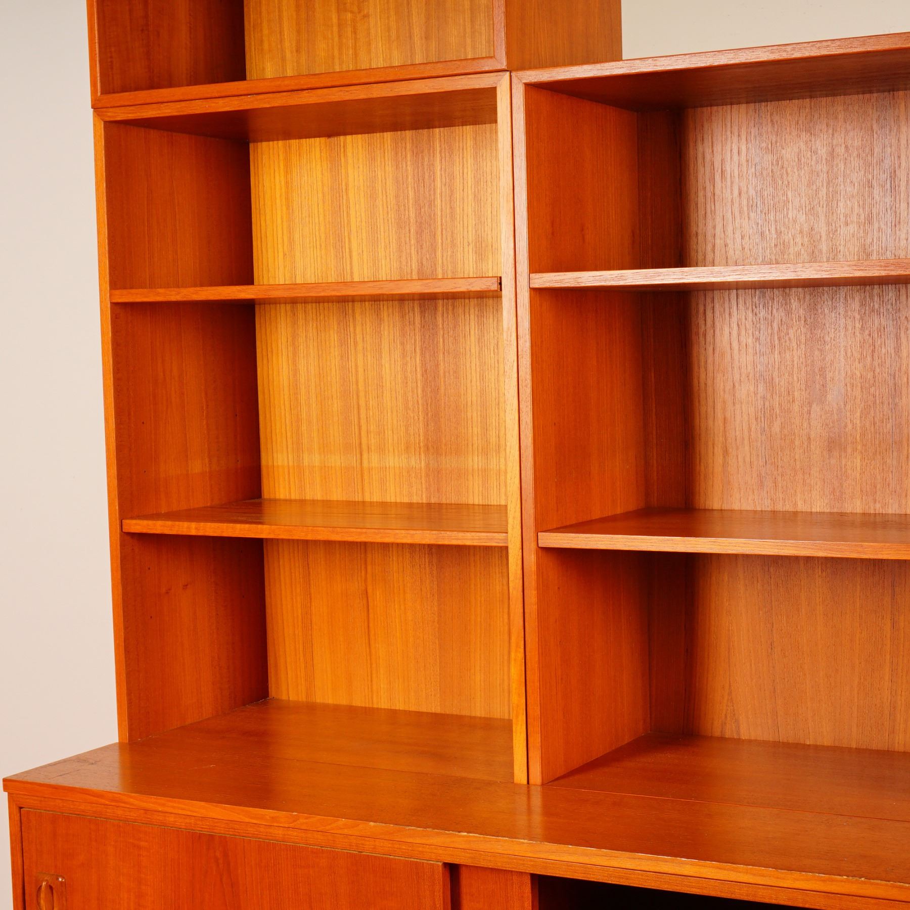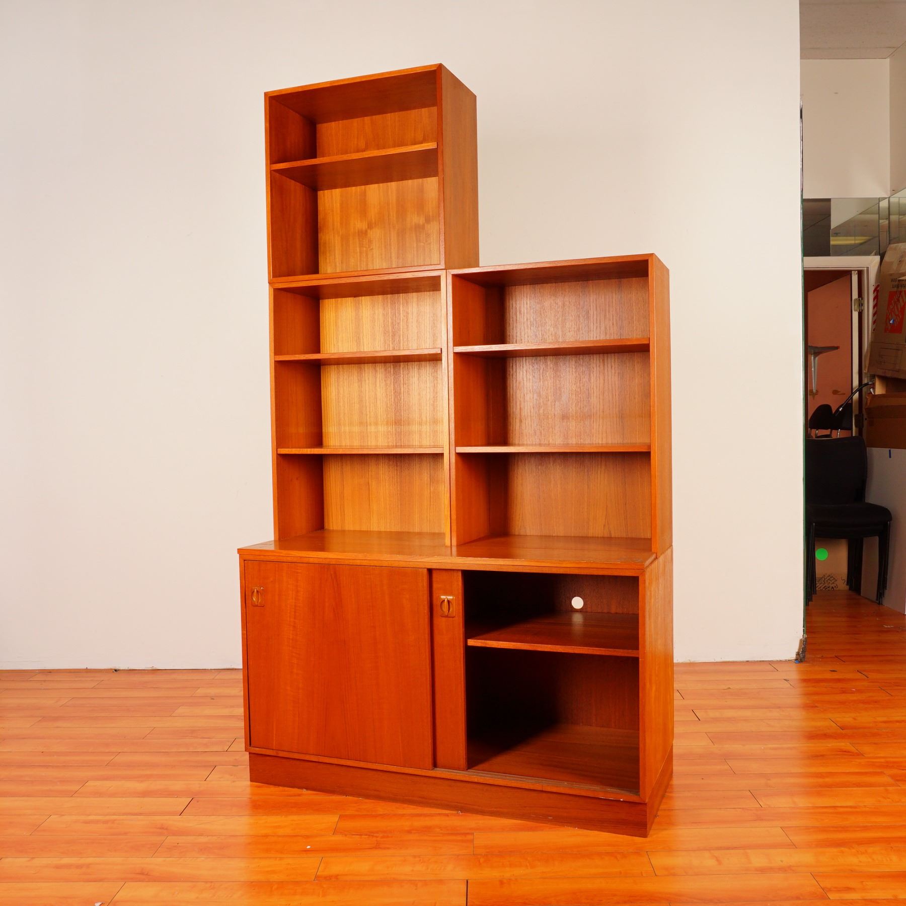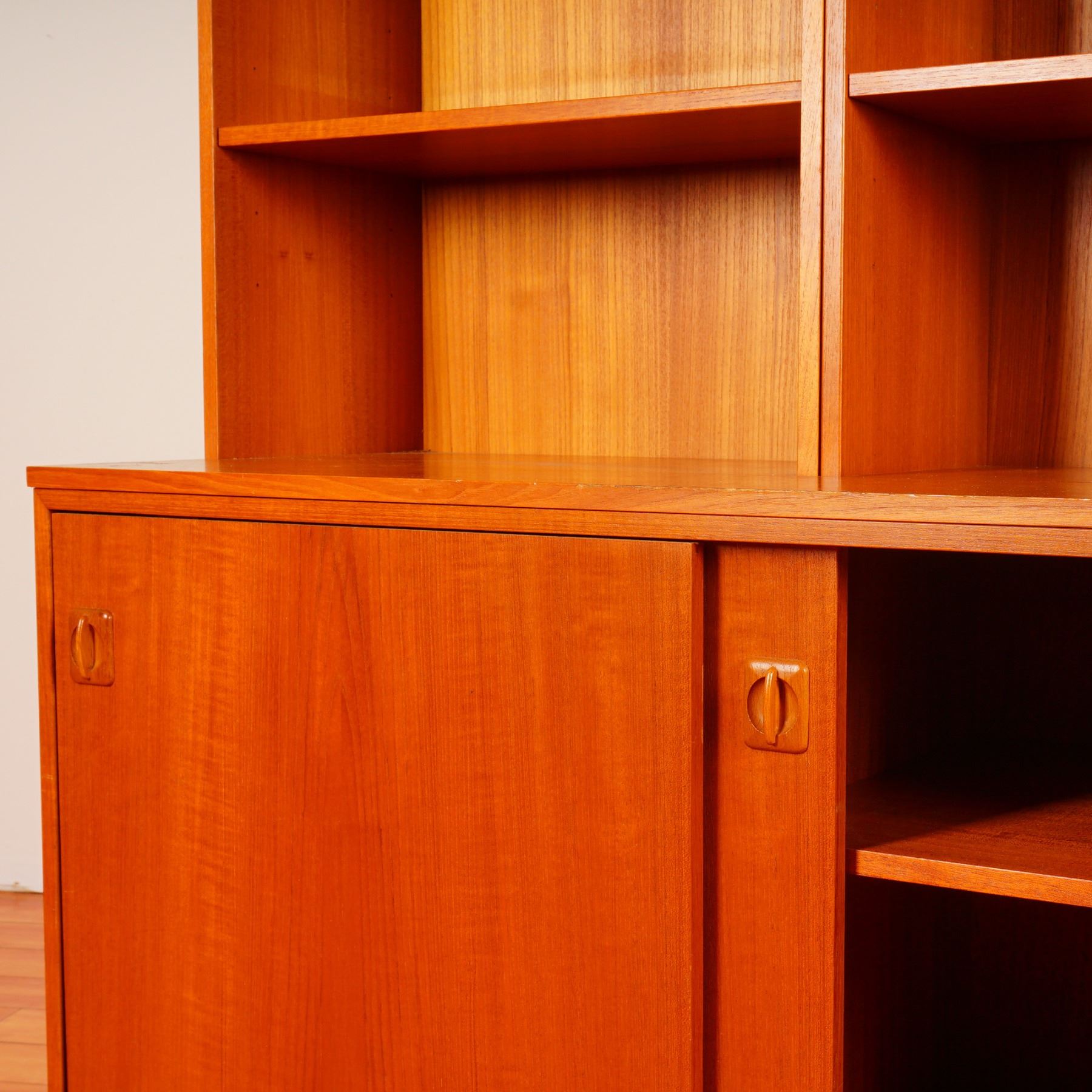 Elegant and versatile, this 4-piece modular wall unit epitomizes the refined craftsmanship of mid-century Danish design. Crafted in warm teak, the piece features adjustable open shelving above a smooth cabinet base with sliding doors and sculpted recessed pulls. The clean lines and asymmetrical arrangement add a sculptural quality, allowing for flexible display and storage options. The back panel includes cutouts for convenient cord management, making it ideal for both living and office settings. Made in Denmark, this wall unit embodies functionality and timeless style that define Scandinavian modernism.