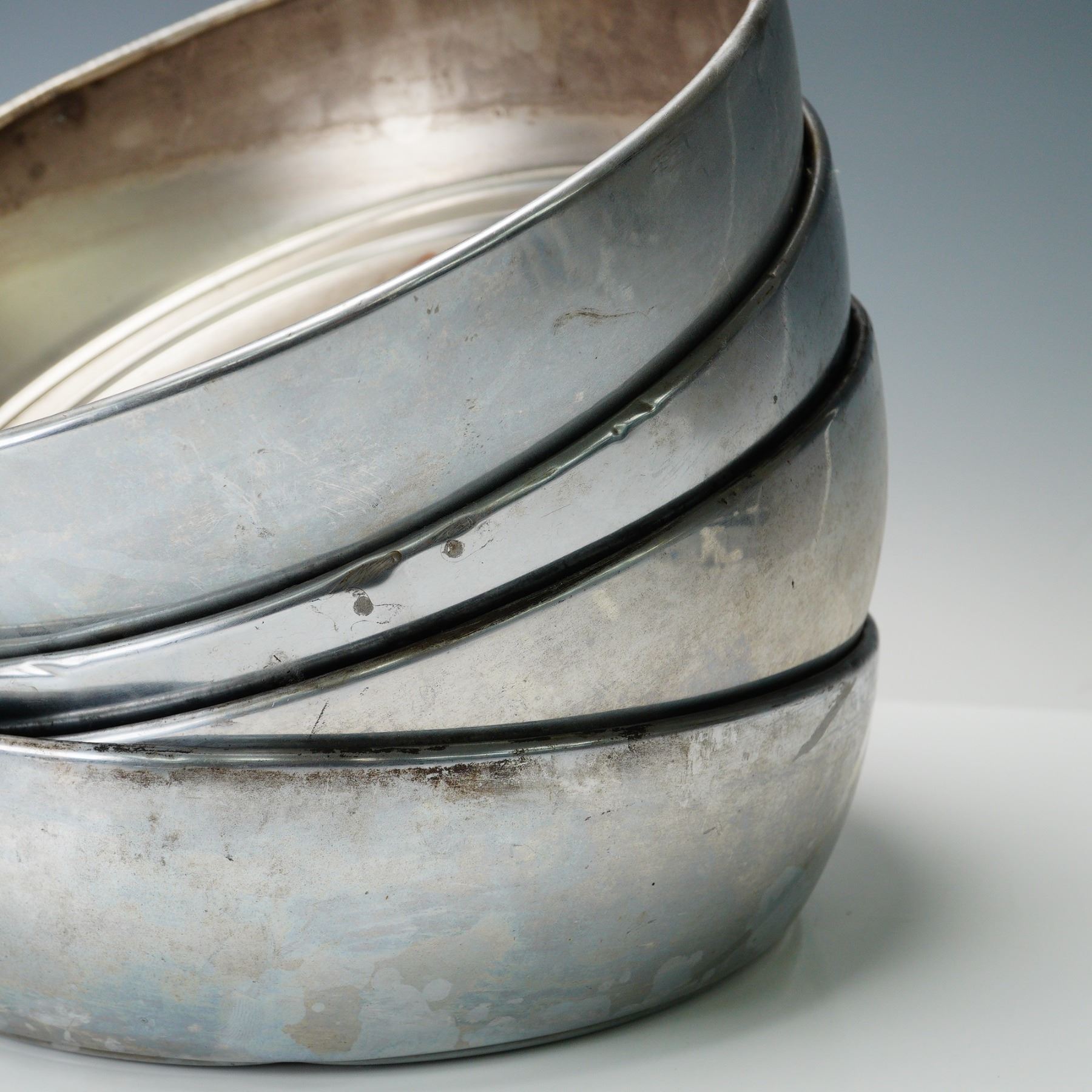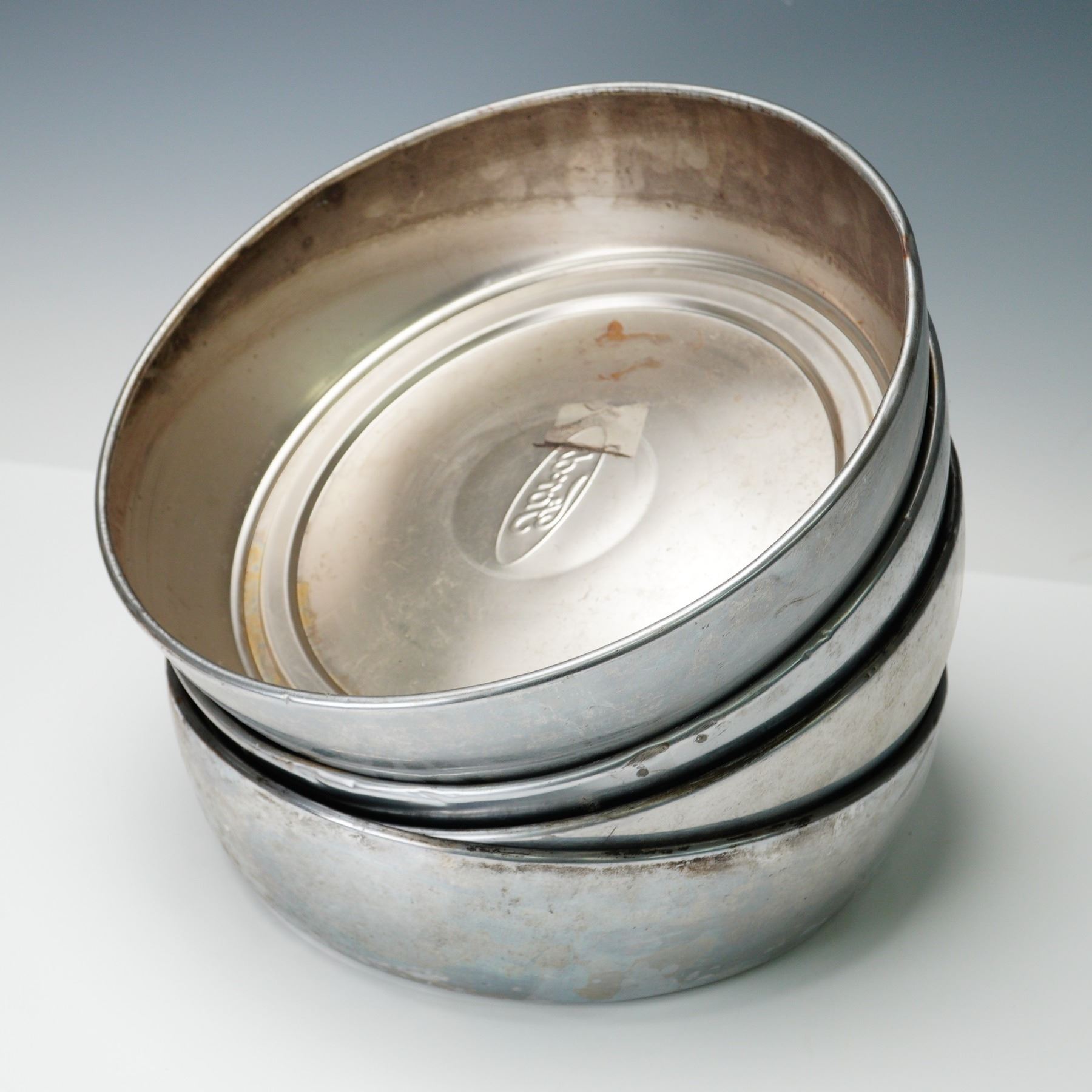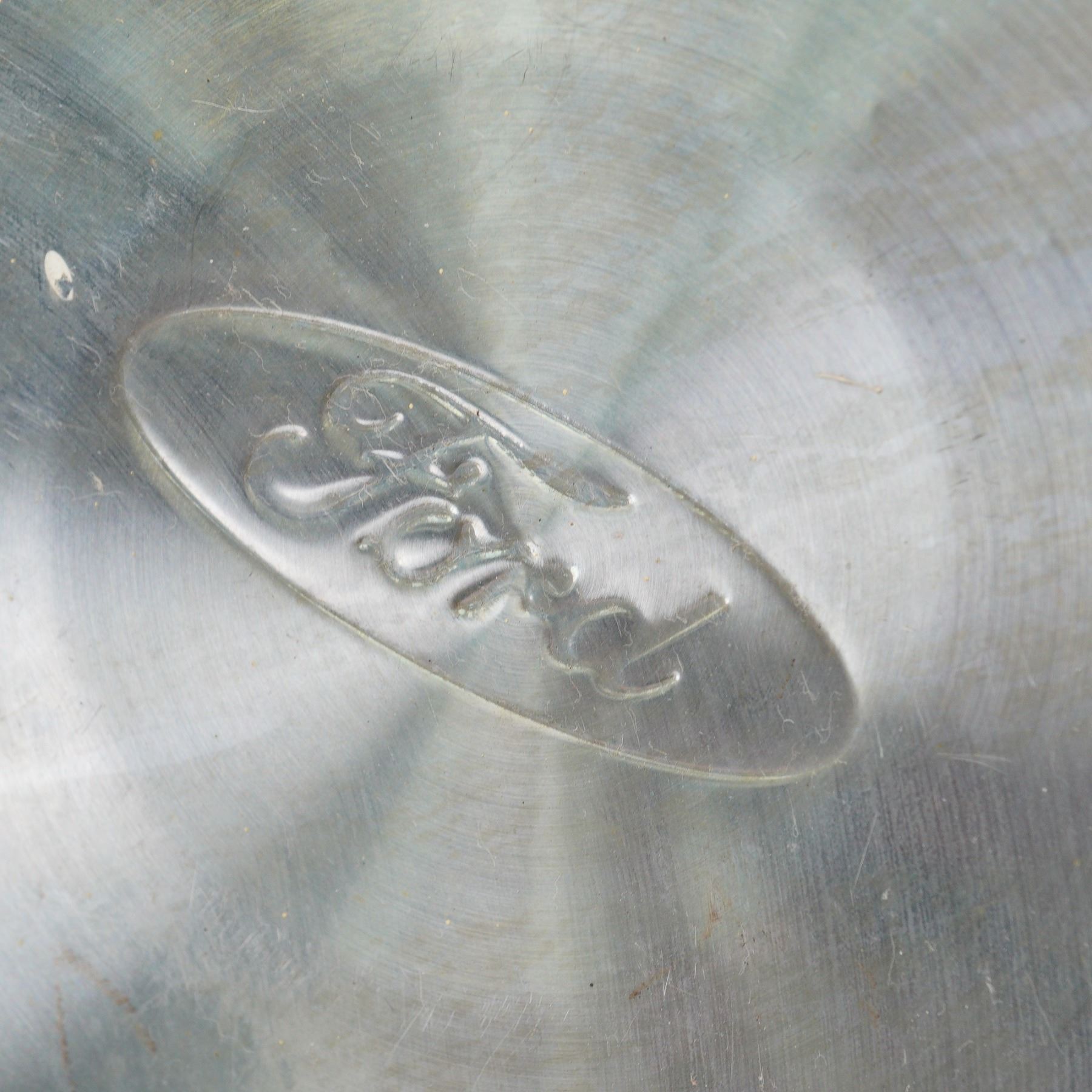 A group of four vintage Ford automobile hubcaps, circa mid-20th century. Made of polished metal with the iconic Ford script logo stamped at center within an oval reserve. The circular forms exhibit a clean, domed profile typical of midcentury wheel cover design. Moderate wear and surface oxidation throughout consistent with age and use. Each hubcap measures approximately 12 inches in diameter x 3 inches high.