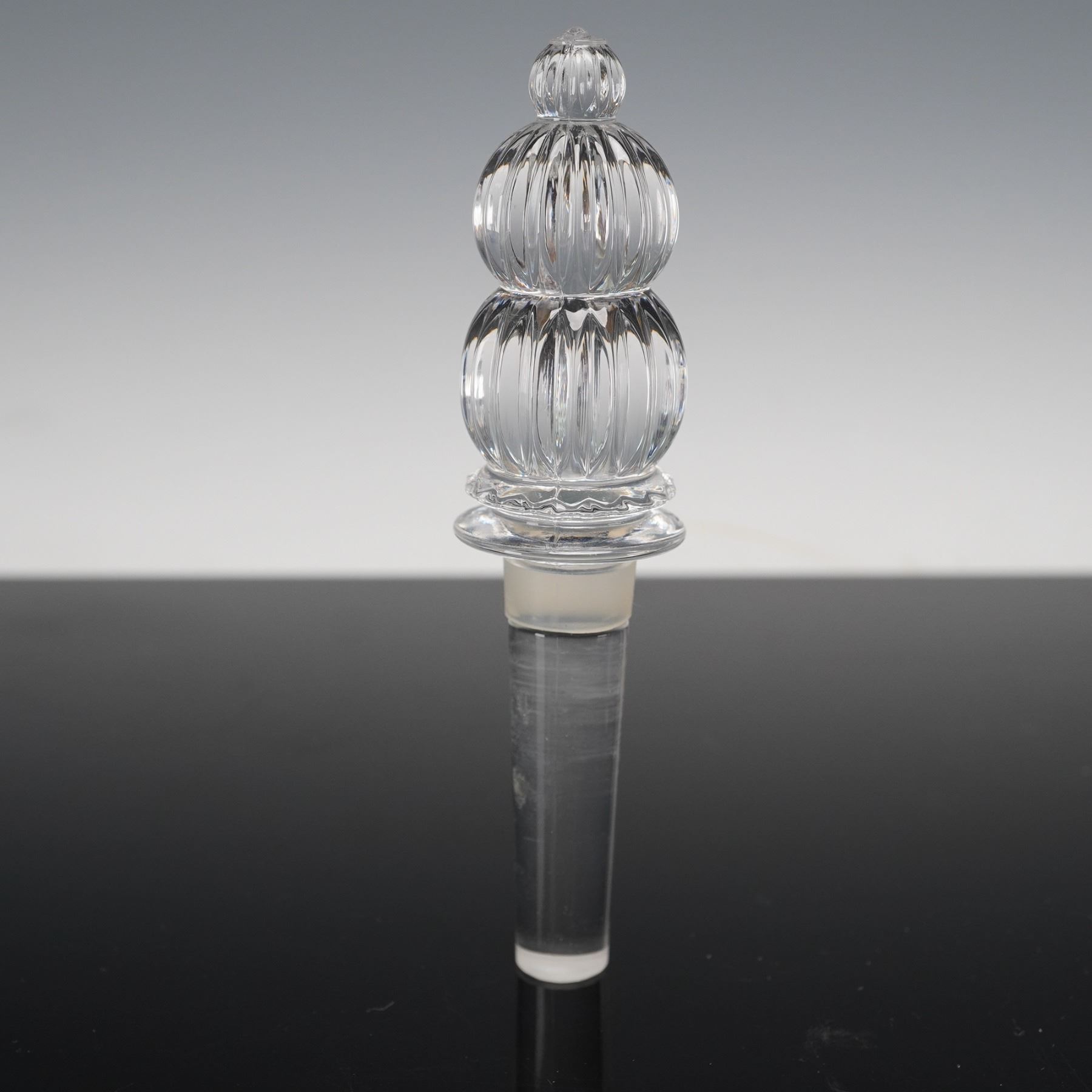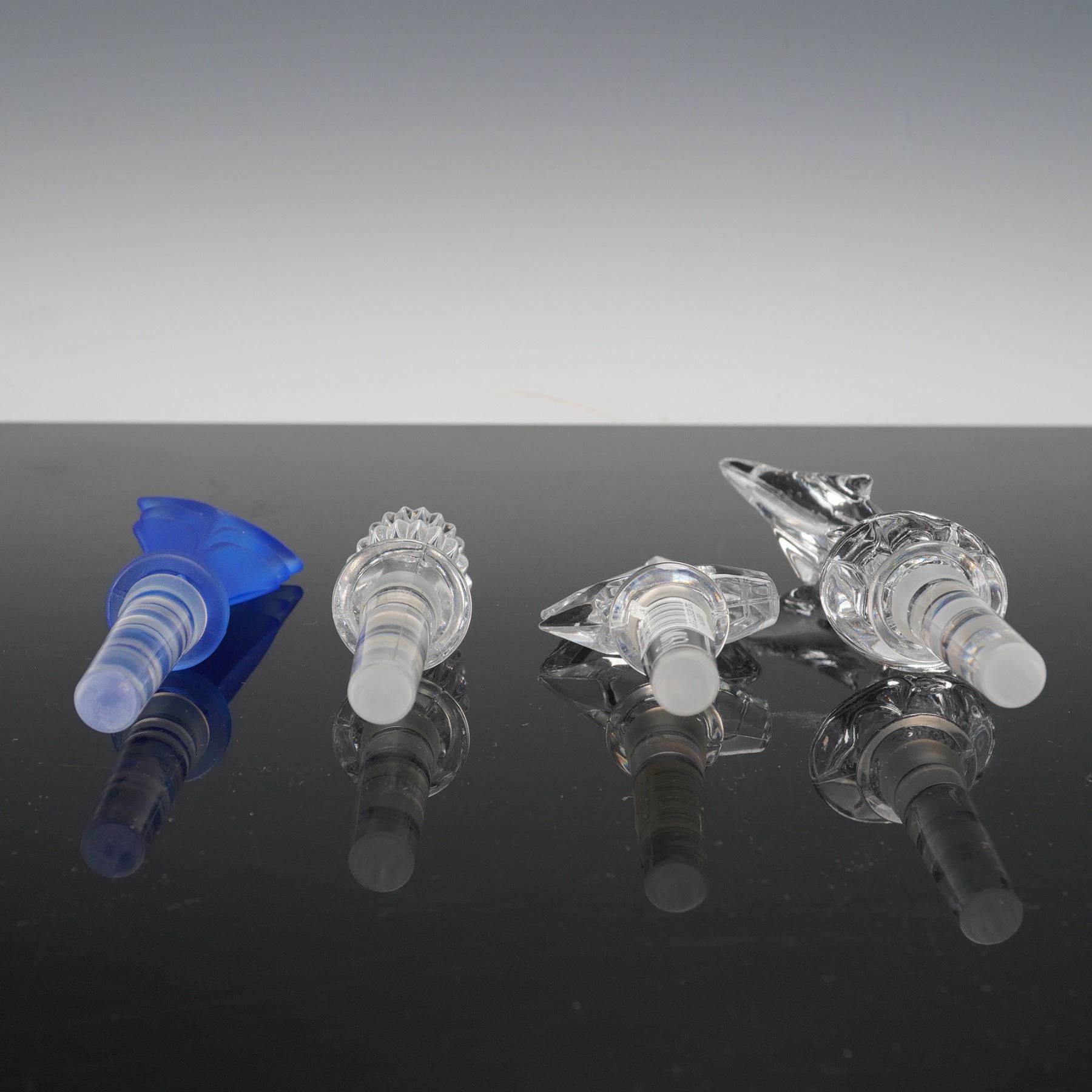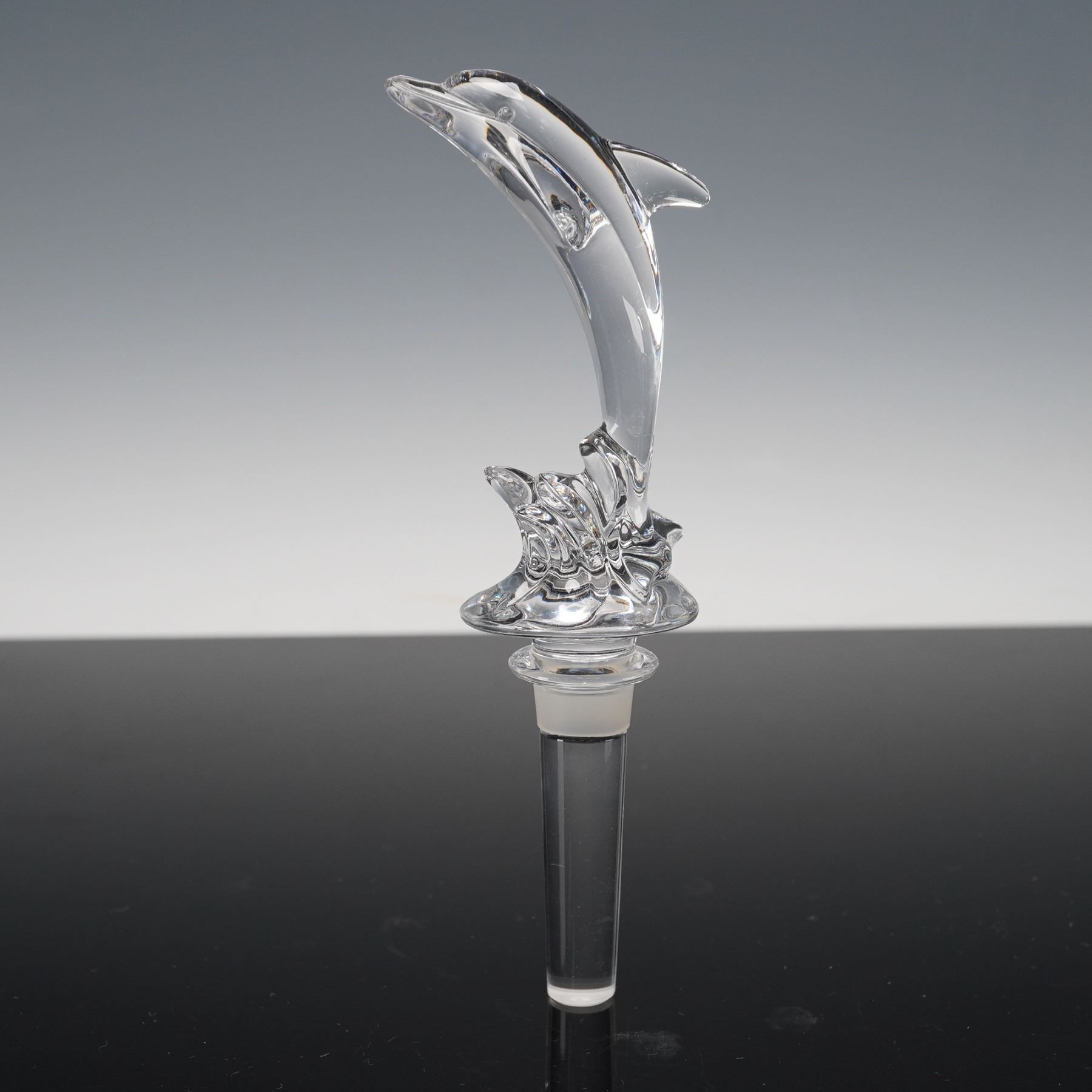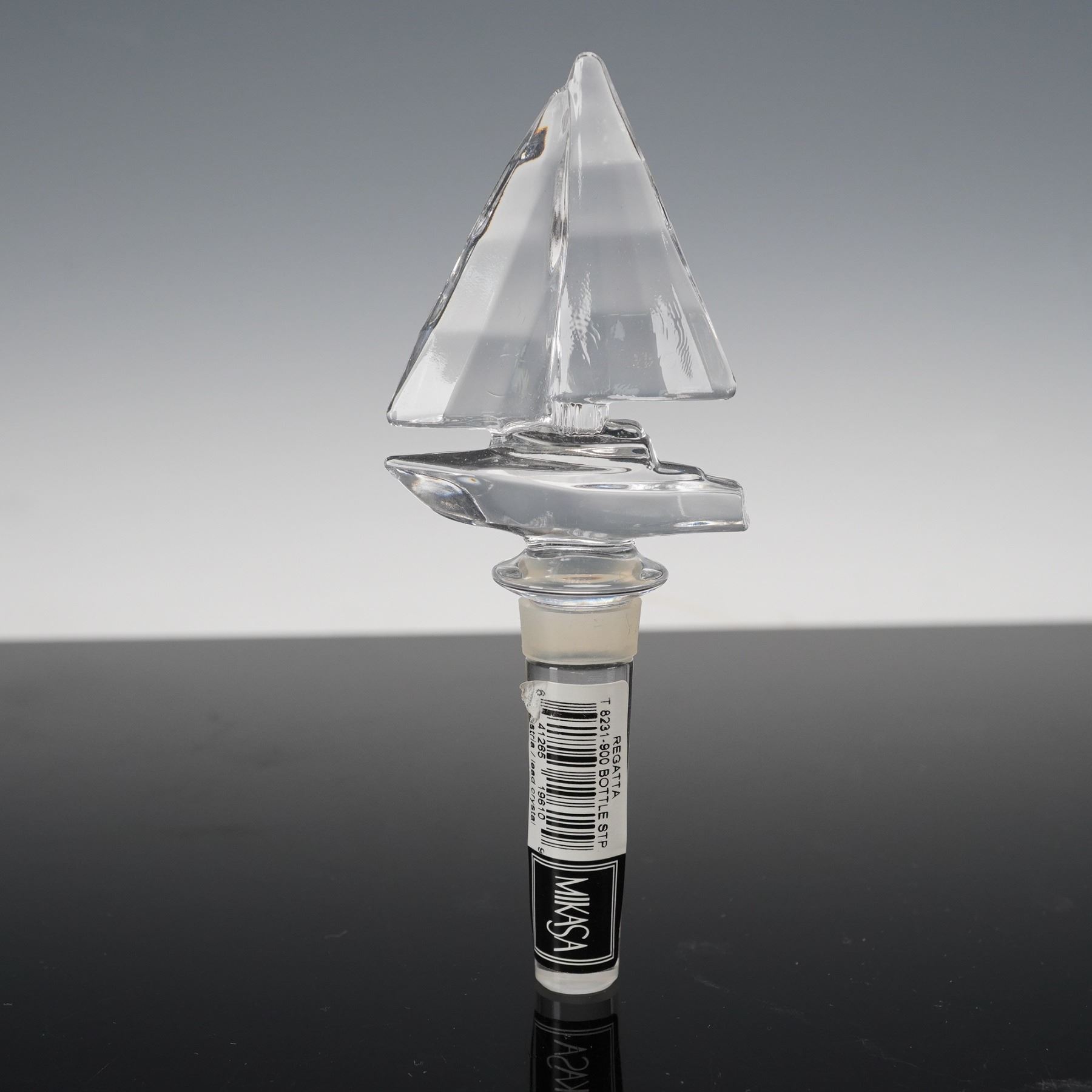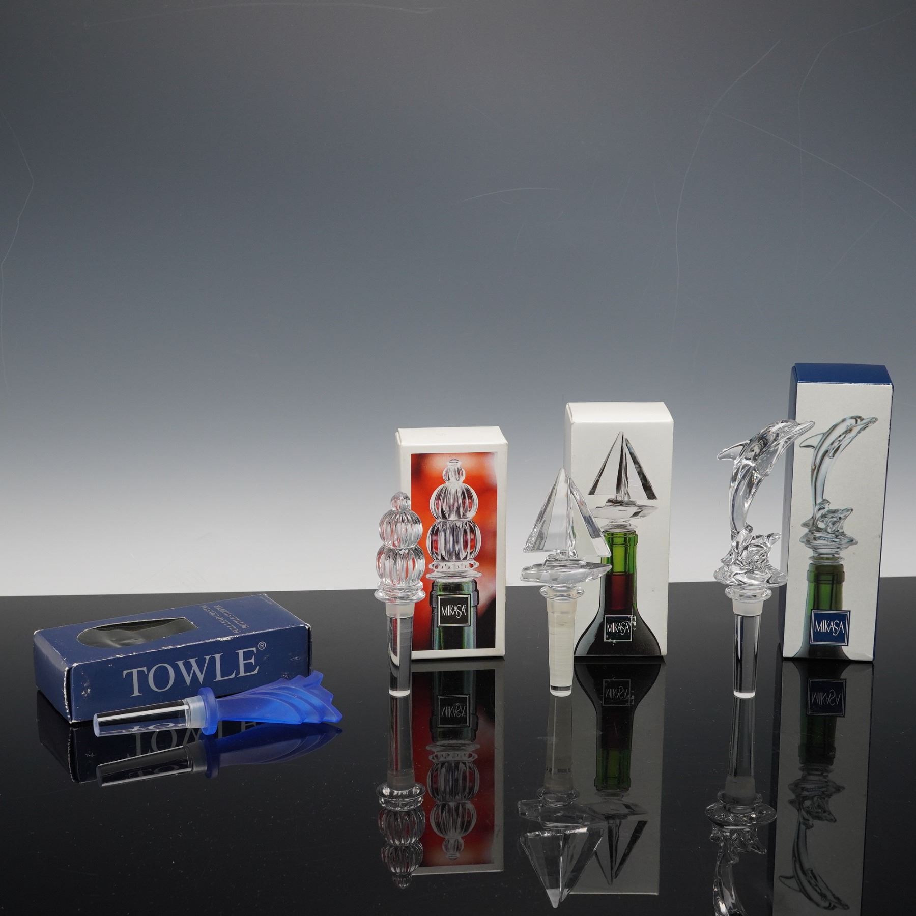 Collection of four crystal bottle stoppers by Mikasa and Towle. The lot includes three clear Mikasa design, Dolphin, Regatta Sailboat, and Monterey, each crafted in brilliant full-lead crystal and accompanied by original boxes, along with a Worcester Sydney Blue frosted crystal stopper in its original packaging. Elegant and functional, these decorative stoppers are ideal for fine wine or decanter display. These items have original boxes.