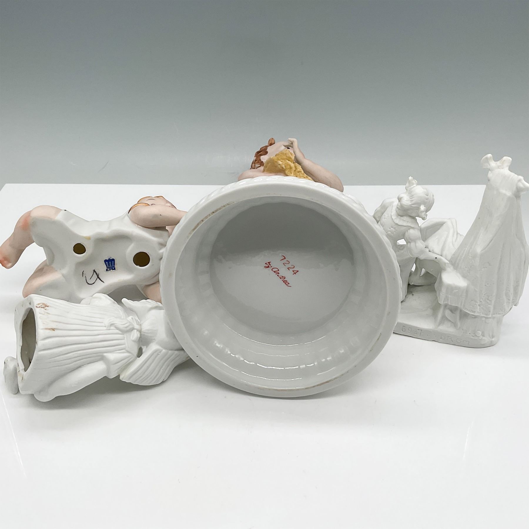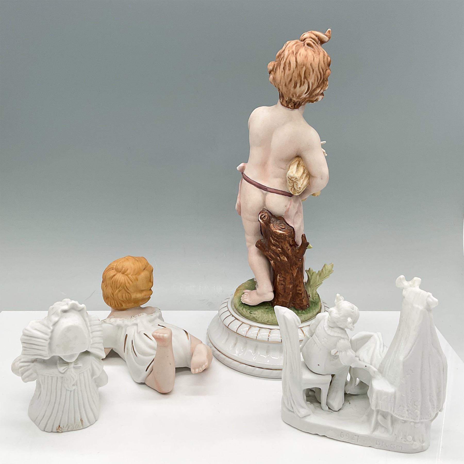 A diverse collection of four porcelain figurines featuring a mix of bisque and glazed finishes. The set includes a large bisque porcelain cherub (12"H) figurine, hand-painted with soft pastel tones and marked By Andrea and numbered 7224 on the base. Also included is a reclining bisque porcelain child (4"H) figure with finely painted details, marked with a blue crown indicating KPM. Another piece in the collection is a white glazed porcelain figurine depicting a seated woman attending to a baby in a cradle (5"H), with the inscription Moulin Clock at the base. Completing the set is a small bisque porcelain girl in a bonnet (4"H), seated with a playful expression, showcasing delicate detailing.