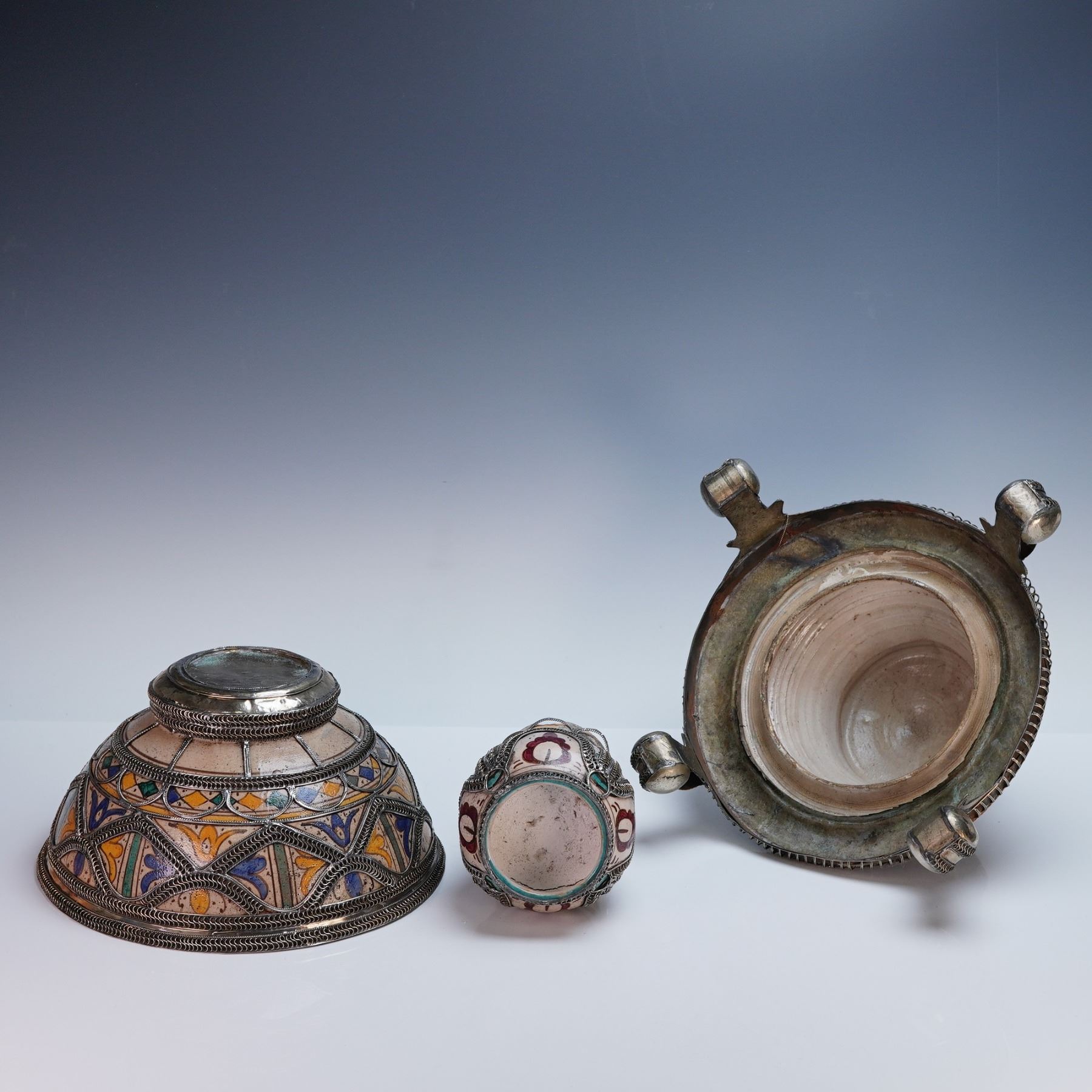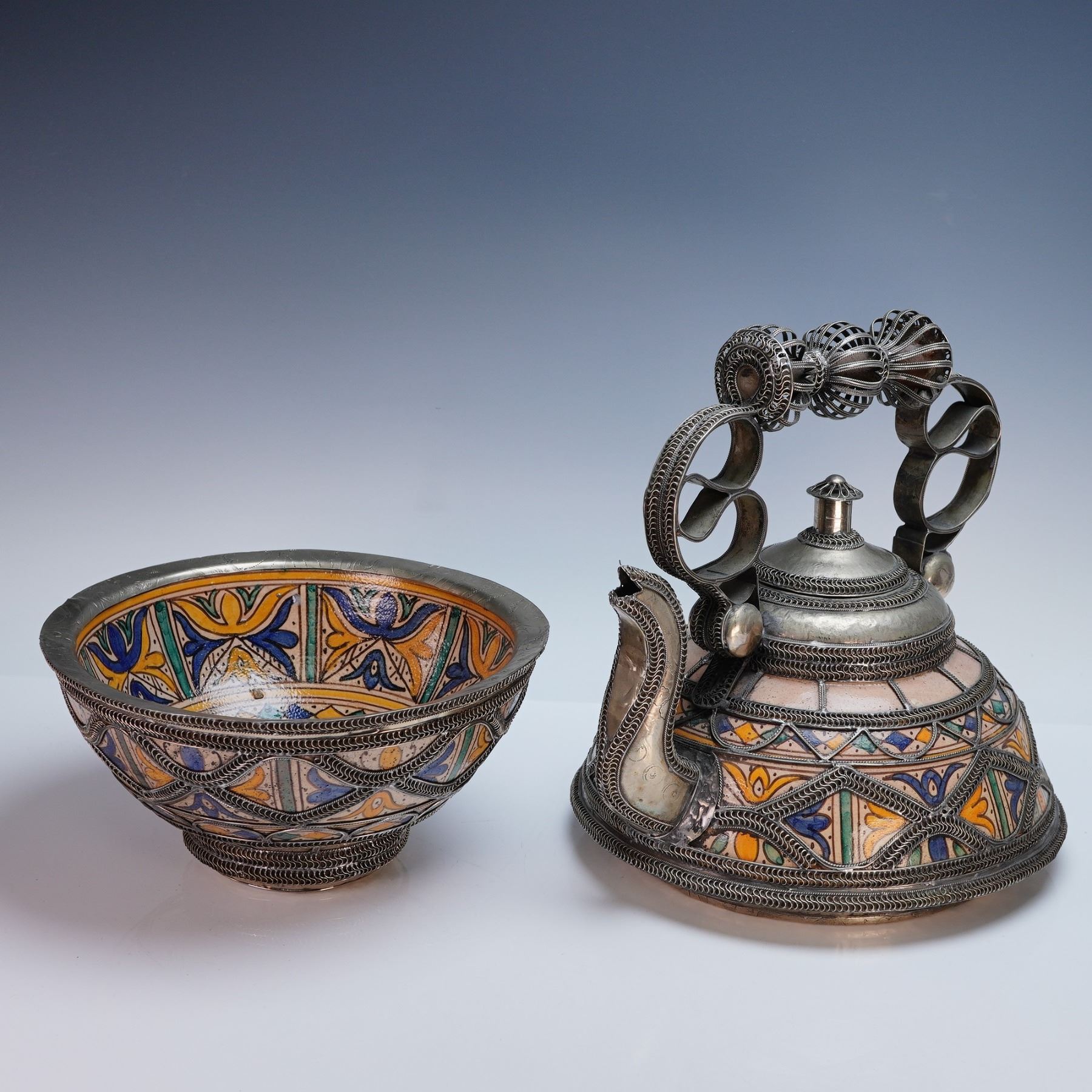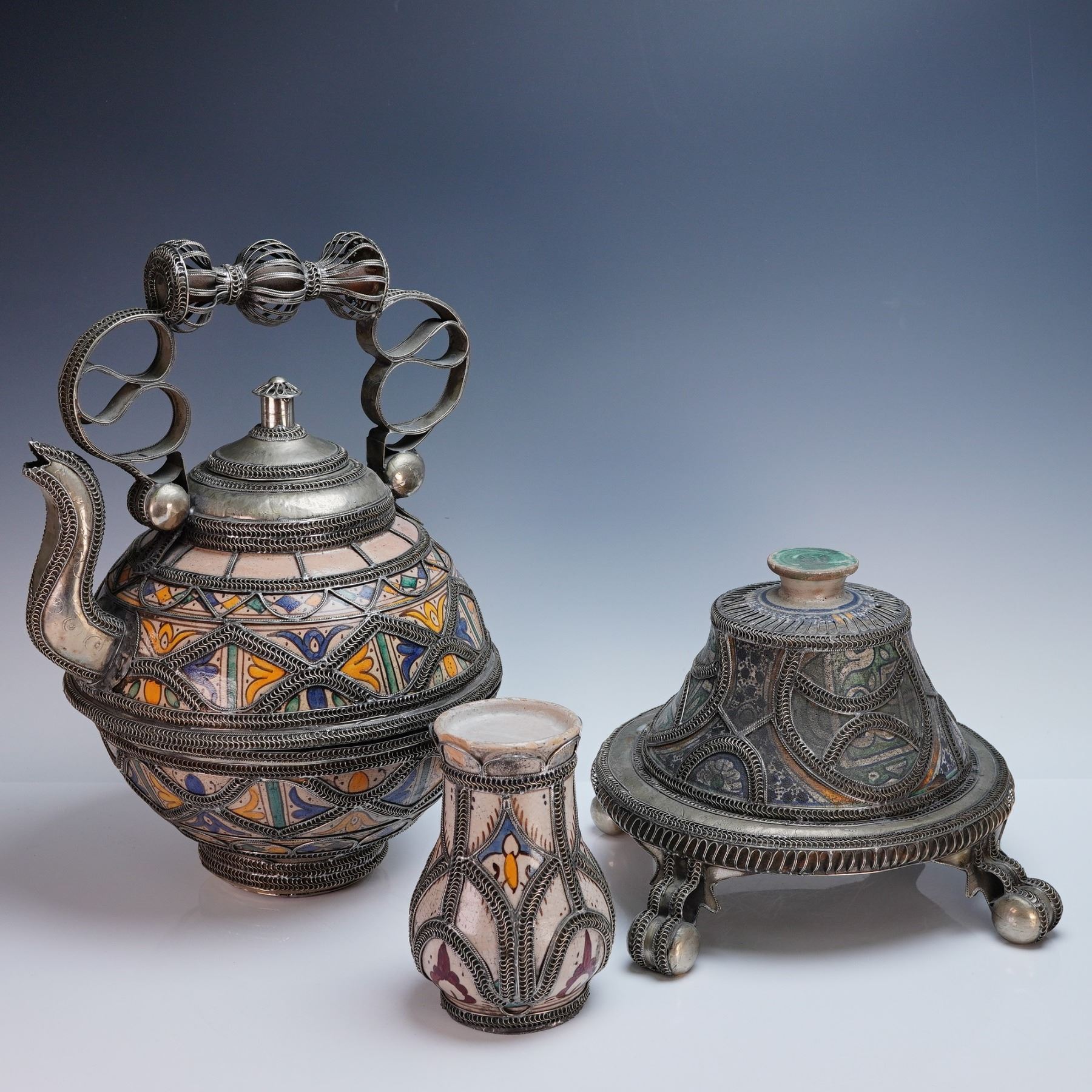 A Moroccan silver filigree and enamel decorated tea set comprising a 2 piece teapot and bowl warmer, a small vase, and a lidded pedestal dish on tripod feet. Each piece features intricate openwork filigree detailing with colorful enamel panels in geometric and floral motifs, predominantly in shades of blue, green, yellow, and red. The teapot exhibits an ornate scroll handle and a curved spout with fine wirework accents. The pedestal dish is raised on three curled feet and topped with a domed lid, while the small vase displays a bulbous body with flared rim. The undersides show engraved floral designs and hand-painted script marks. Largest piece measures 12"L x 16"H.