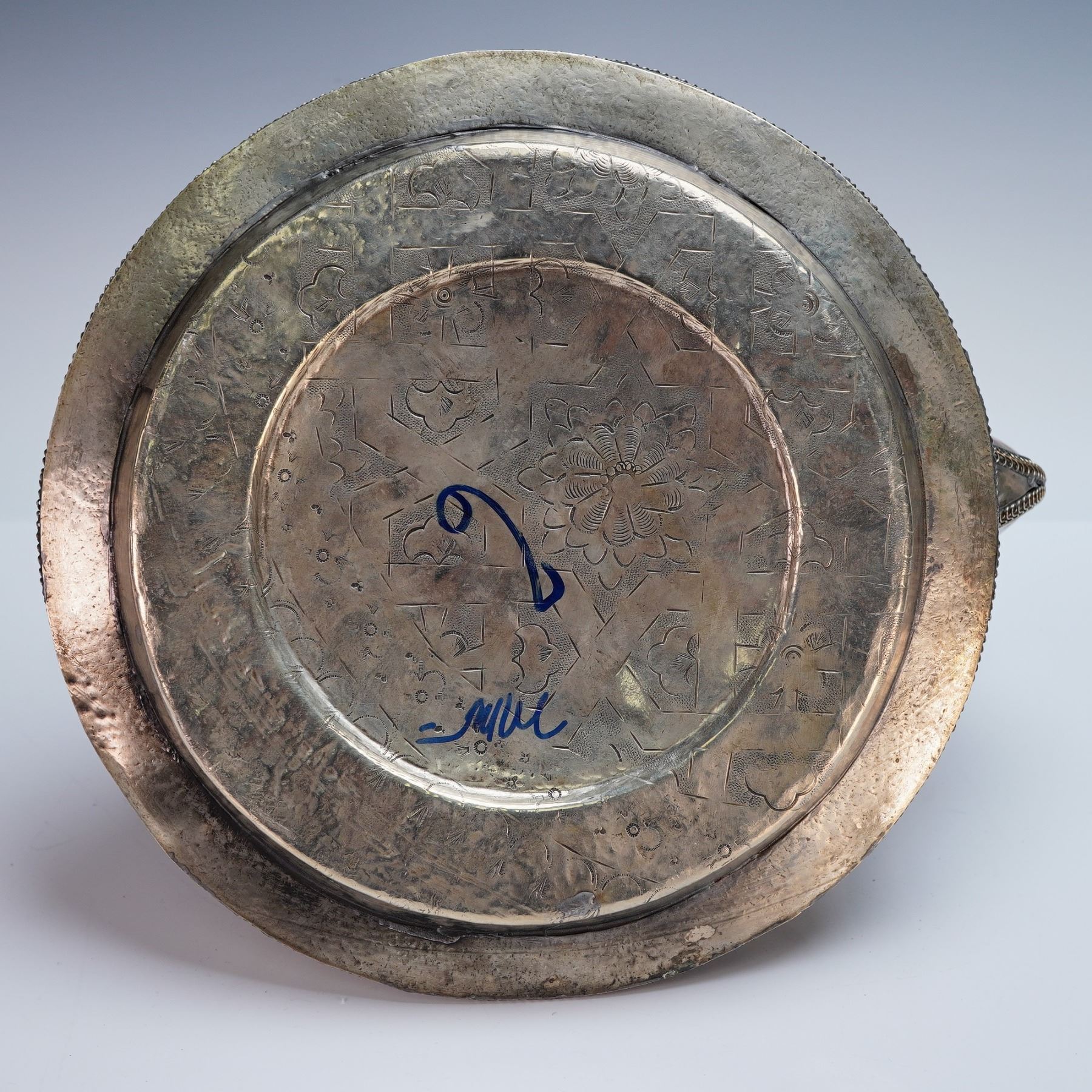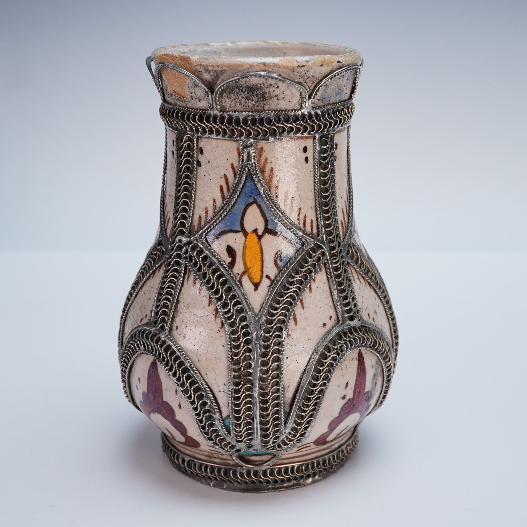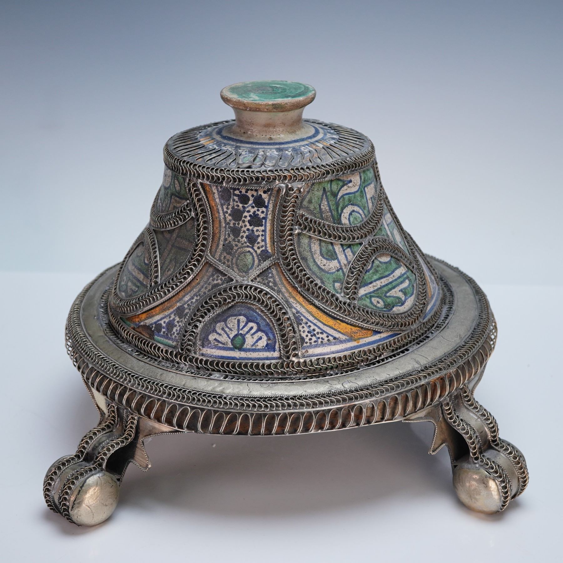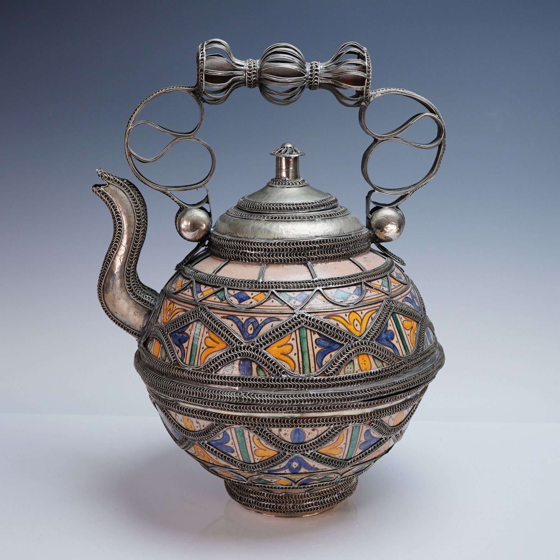 A Moroccan silver filigree and enamel decorated tea set comprising a 2 piece teapot and bowl warmer, a small vase, and a lidded pedestal dish on tripod feet. Each piece features intricate openwork filigree detailing with colorful enamel panels in geometric and floral motifs, predominantly in shades of blue, green, yellow, and red. The teapot exhibits an ornate scroll handle and a curved spout with fine wirework accents. The pedestal dish is raised on three curled feet and topped with a domed lid, while the small vase displays a bulbous body with flared rim. The undersides show engraved floral designs and hand-painted script marks. Largest piece measures 12"L x 16"H.