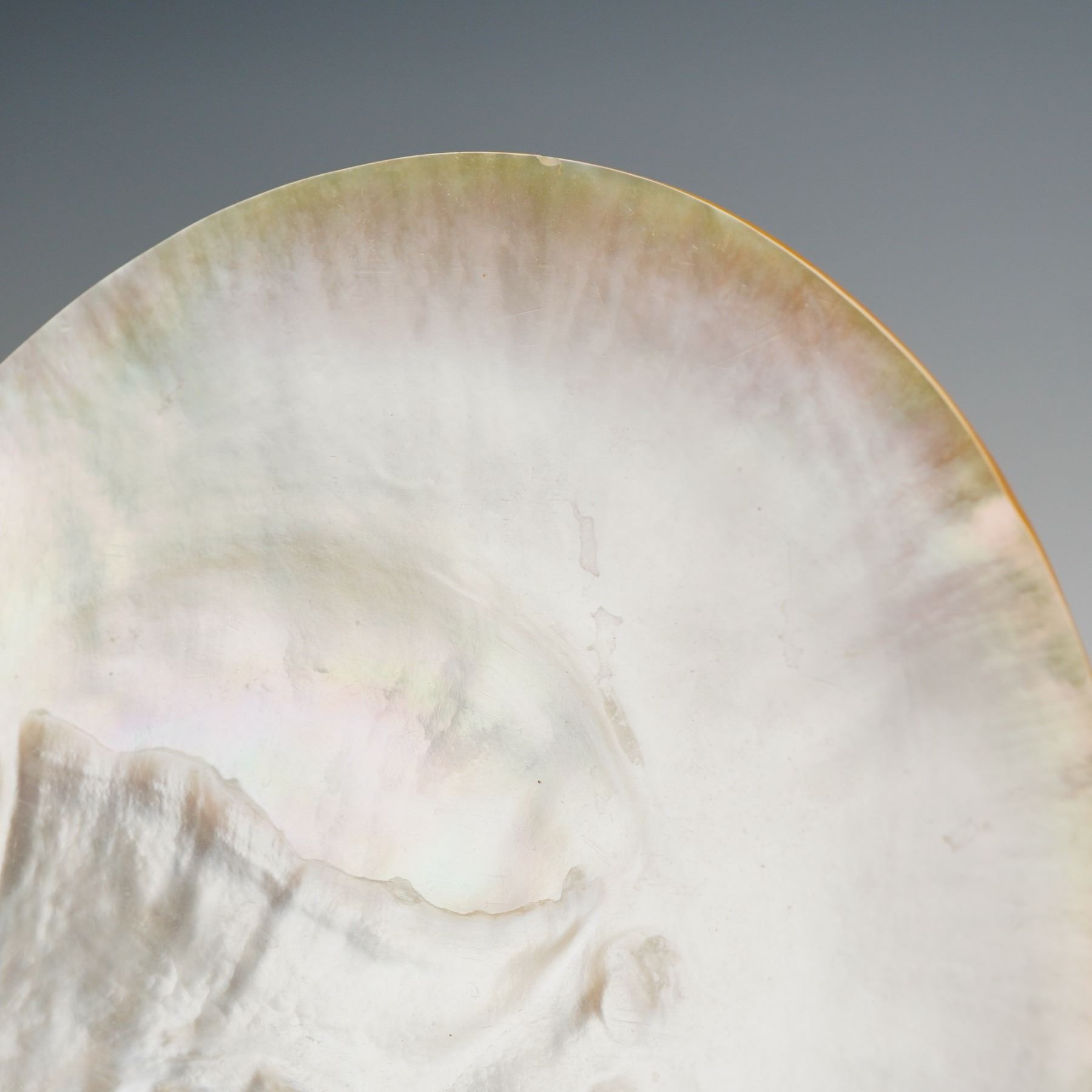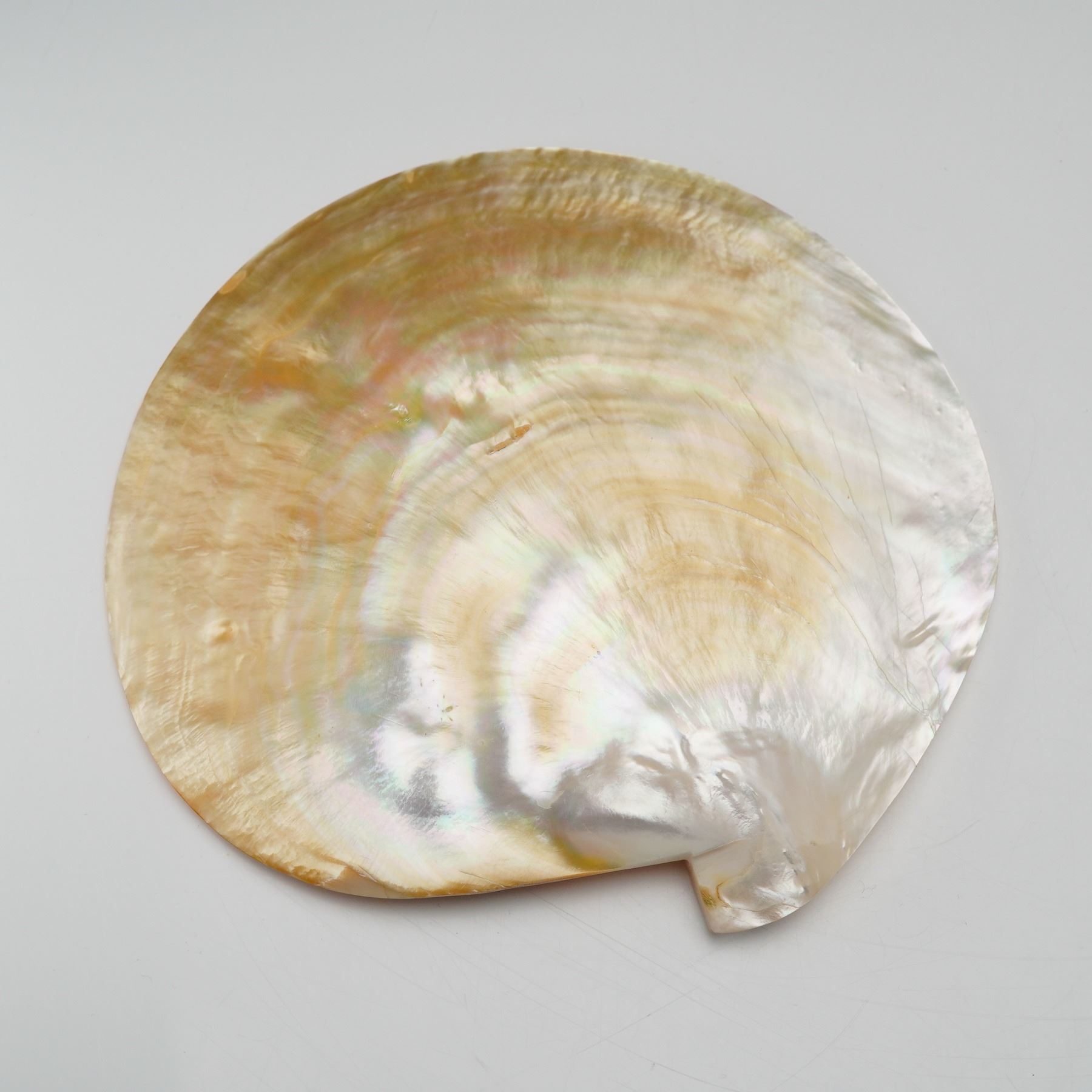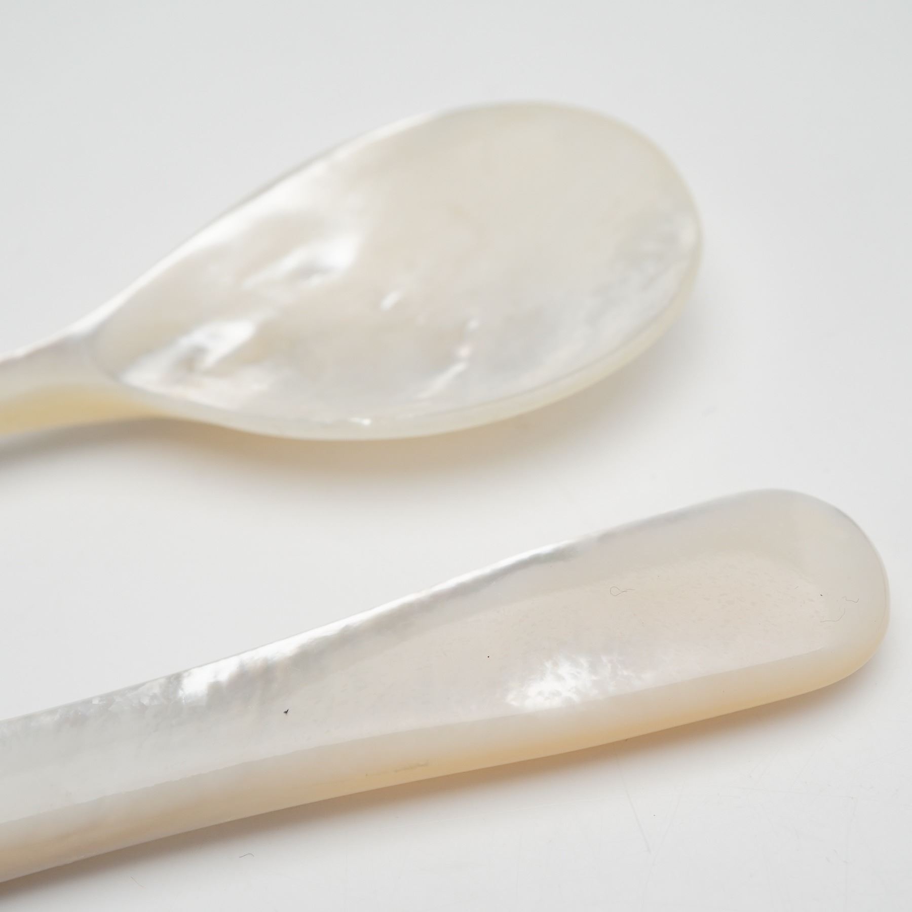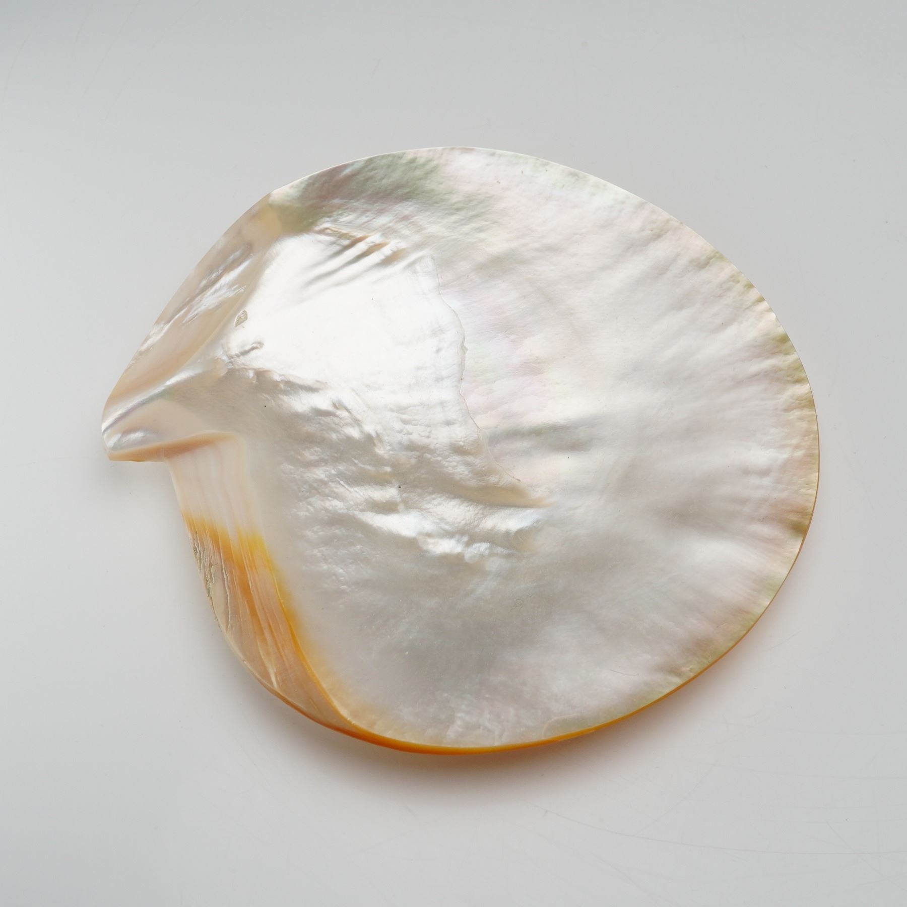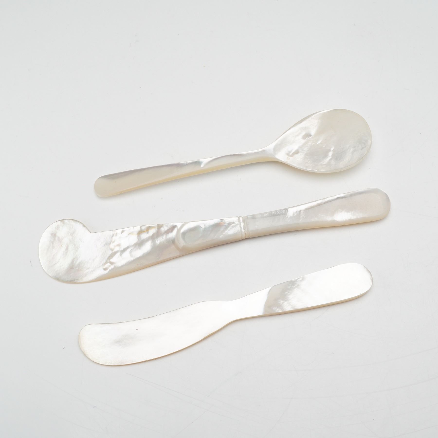 A refined four-piece Mother of Pearl serving set, including a large natural shell plate and three matching utensils, two spreaders and one spoon. Each piece displays the iridescent luster characteristic of genuine nacre, with creamy opalescent tones shifting from ivory to rose and gold. The shell plate's organic form and polished surface make it an elegant presentation piece, ideal for caviar, hors d'oeuvres, or decorative display.