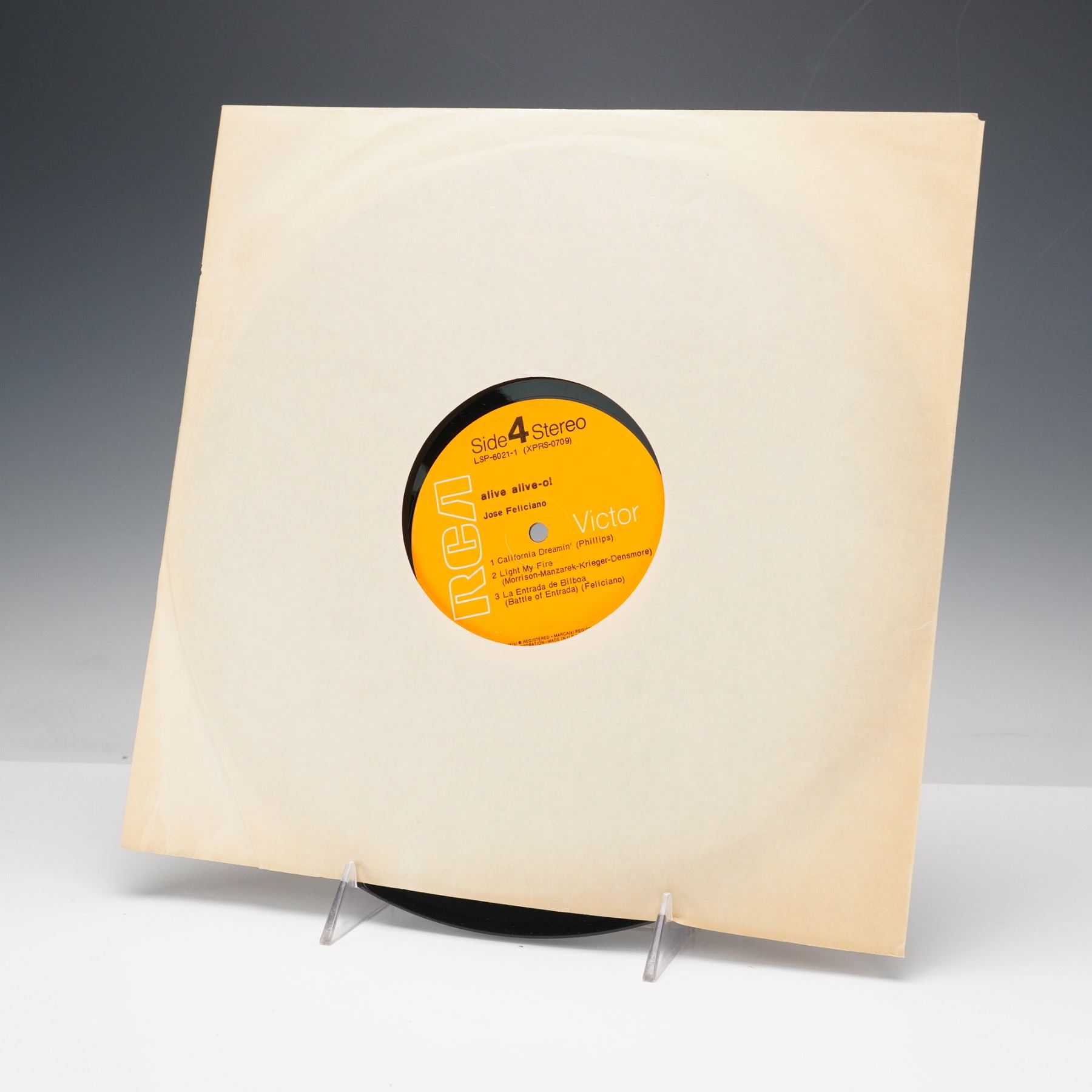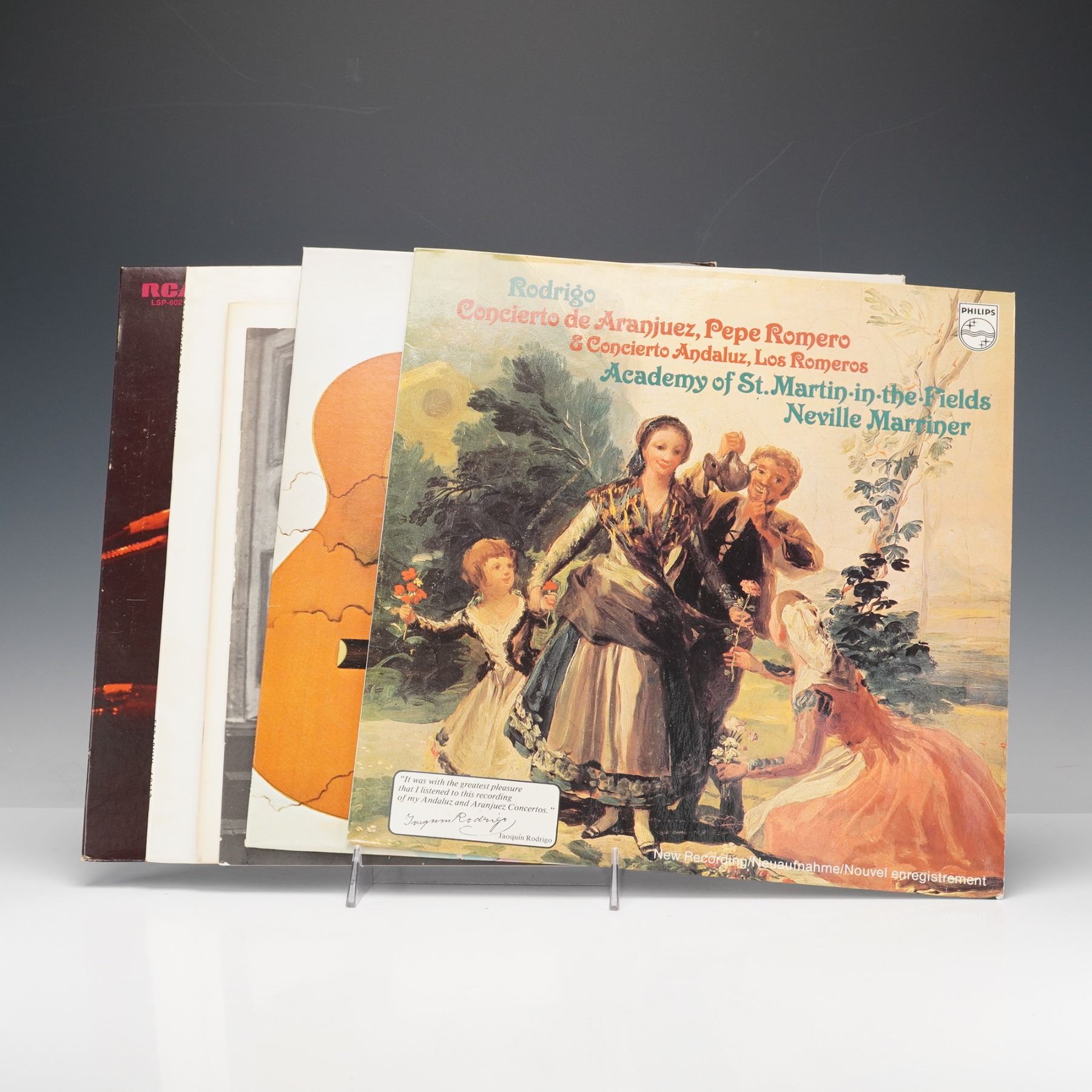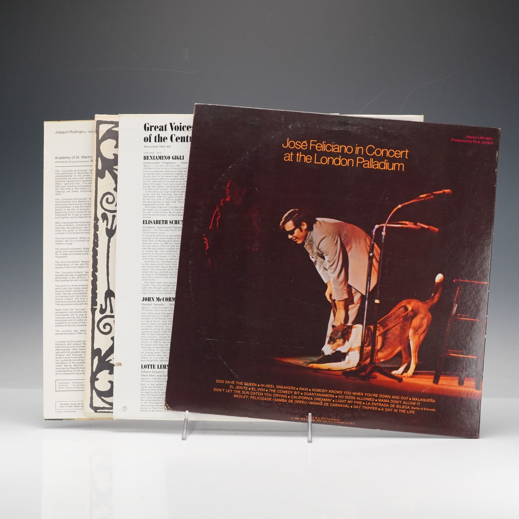 Vinyl records featuring notable performances and compositions across classical and popular genres. Included is a Philips recording of Rodrigo's "Concierto de Aranjuez" and "Concierto Andaluz," performed by Pepe Romero and Los Romeros with the Academy of St. Martin-in-the-Fields under Neville Marriner, showcasing elegant interpretations of Spanish guitar concertos. Also present is an RCA Victor pressing of Jose Feliciano's "Alive Alive-o!" featuring vibrant live renditions of his most celebrated songs, model LSP-6021. Completing the set is the "Jose Feliciano in Concert at the London Palladium" album, capturing his renowned live performance that blends soulful vocals and virtuosic guitar work. Each record represents a distinguished example of 20th-century musical artistry.