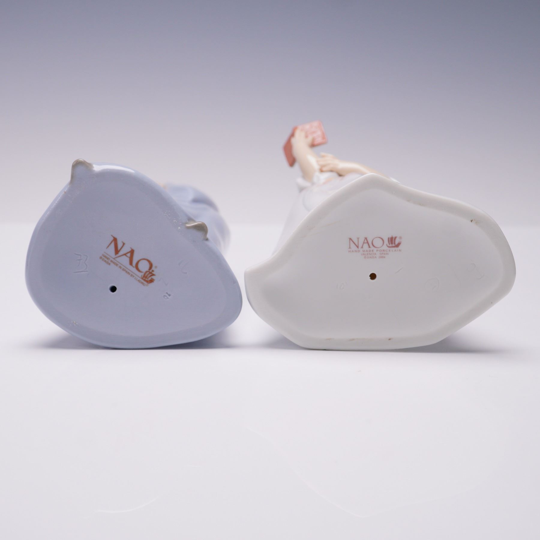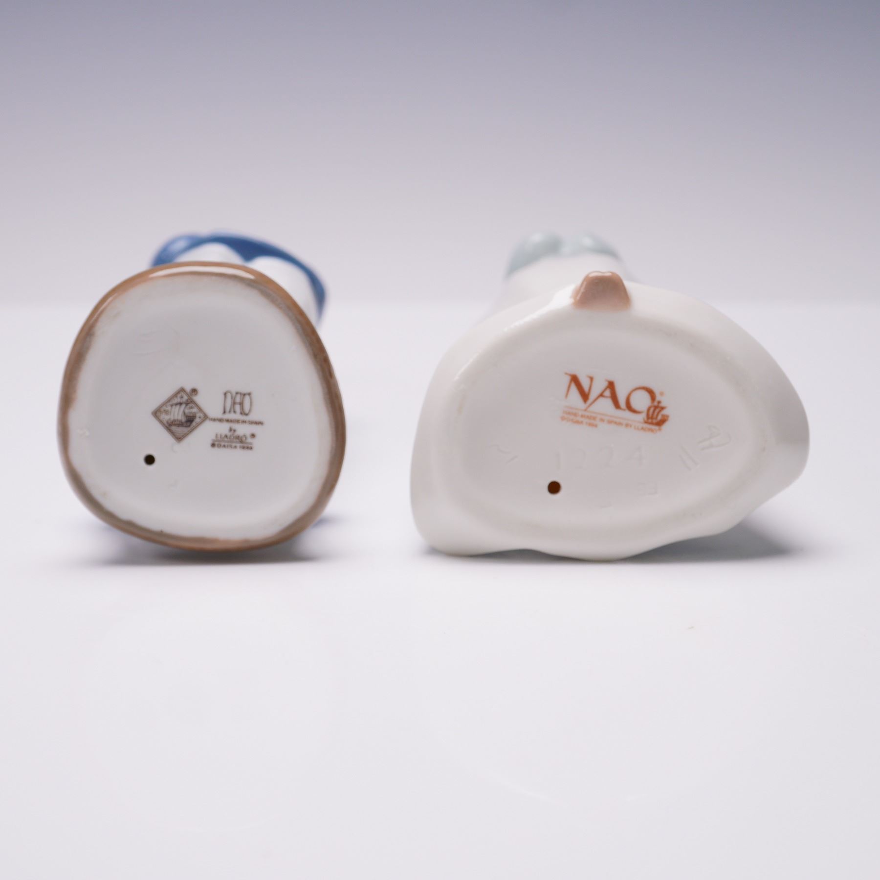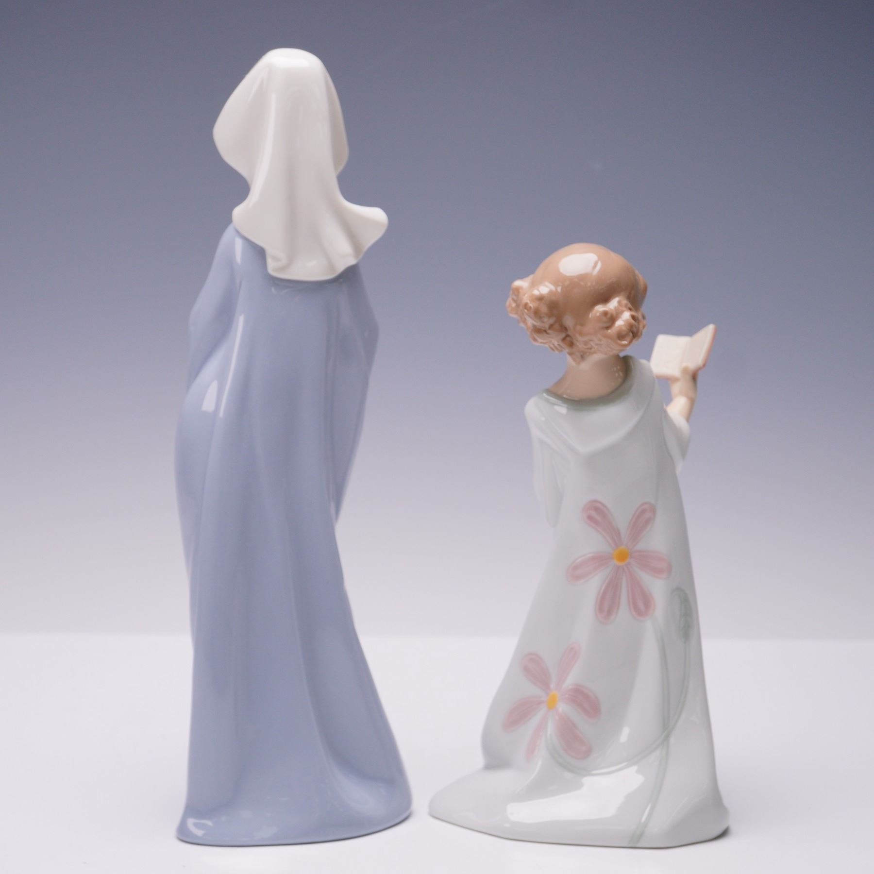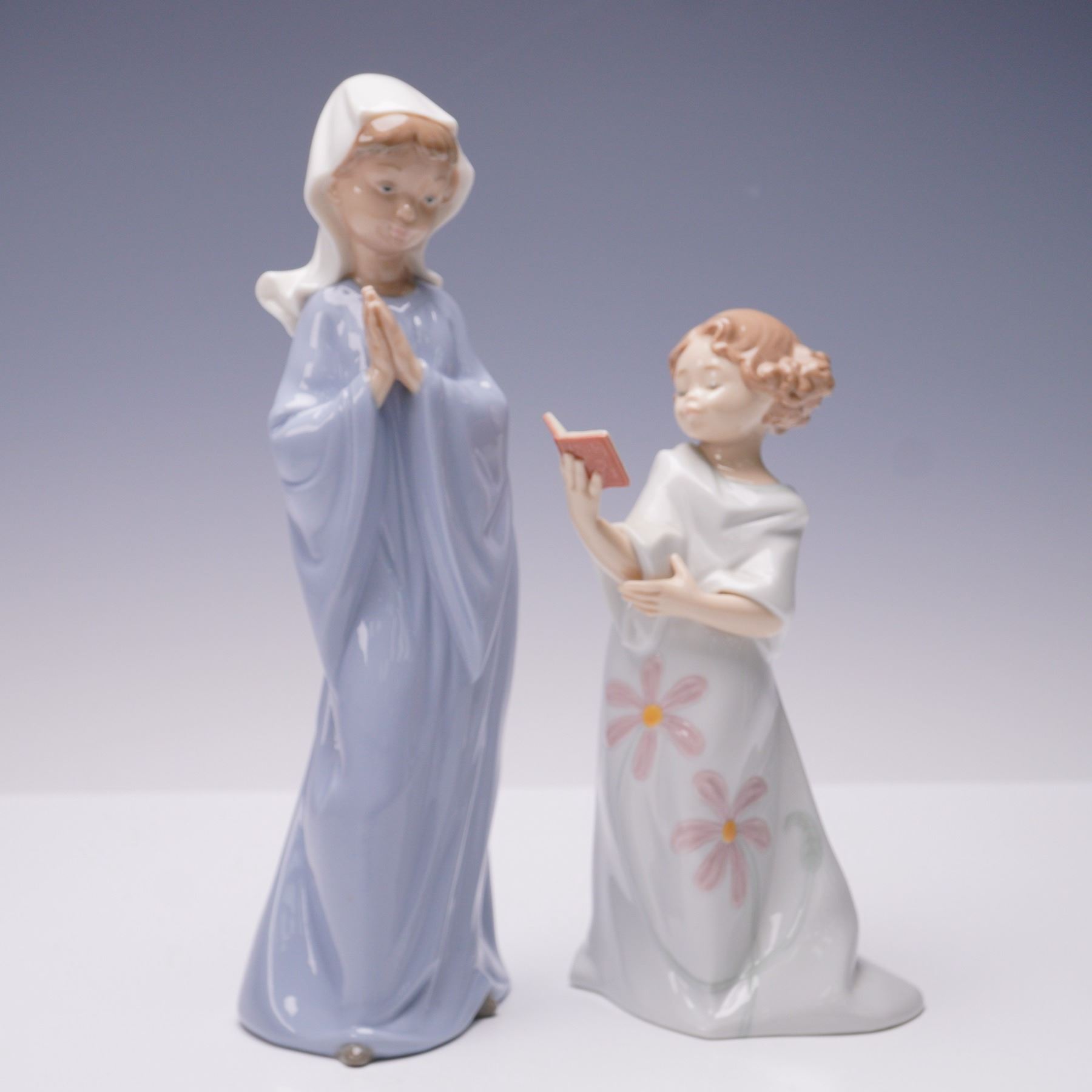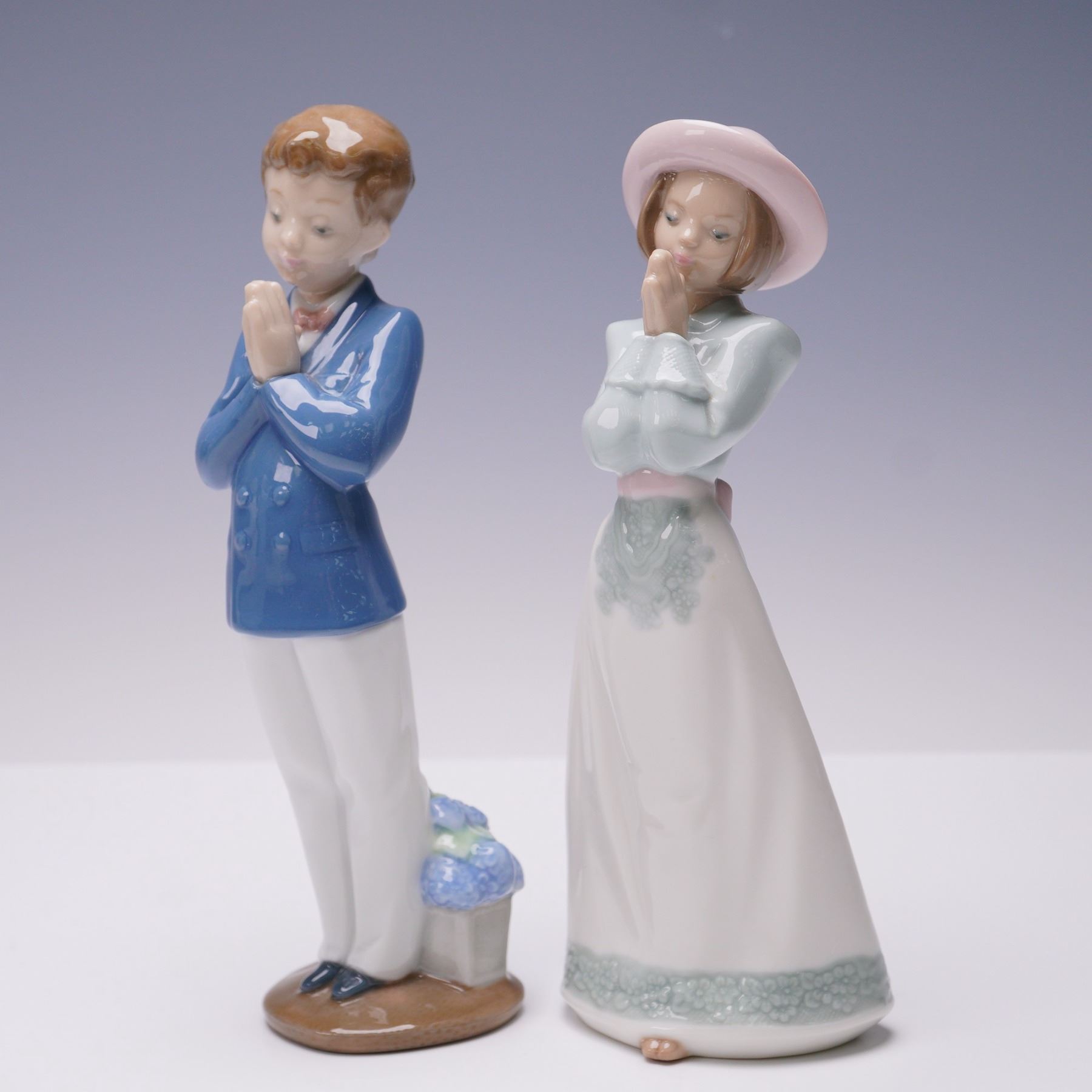 A delightful set of four Nao by Lladro porcelain figurines, each capturing a moment of innocence and grace in soft pastel tones. The group includes a young girl in a white gown with hand-painted floral accents reading aloud, a veiled woman in a long lavender robe with hands in prayer, and a complementary pair of children in period-style dress, posed in reverent stance, he in a blue coat beside a basket of hydrangeas, and she in a wide-brimmed hat and lace-detailed skirt. All finished in Lladro's signature high-gloss glaze with delicate sculptural detail. Nao backstamp on bases.