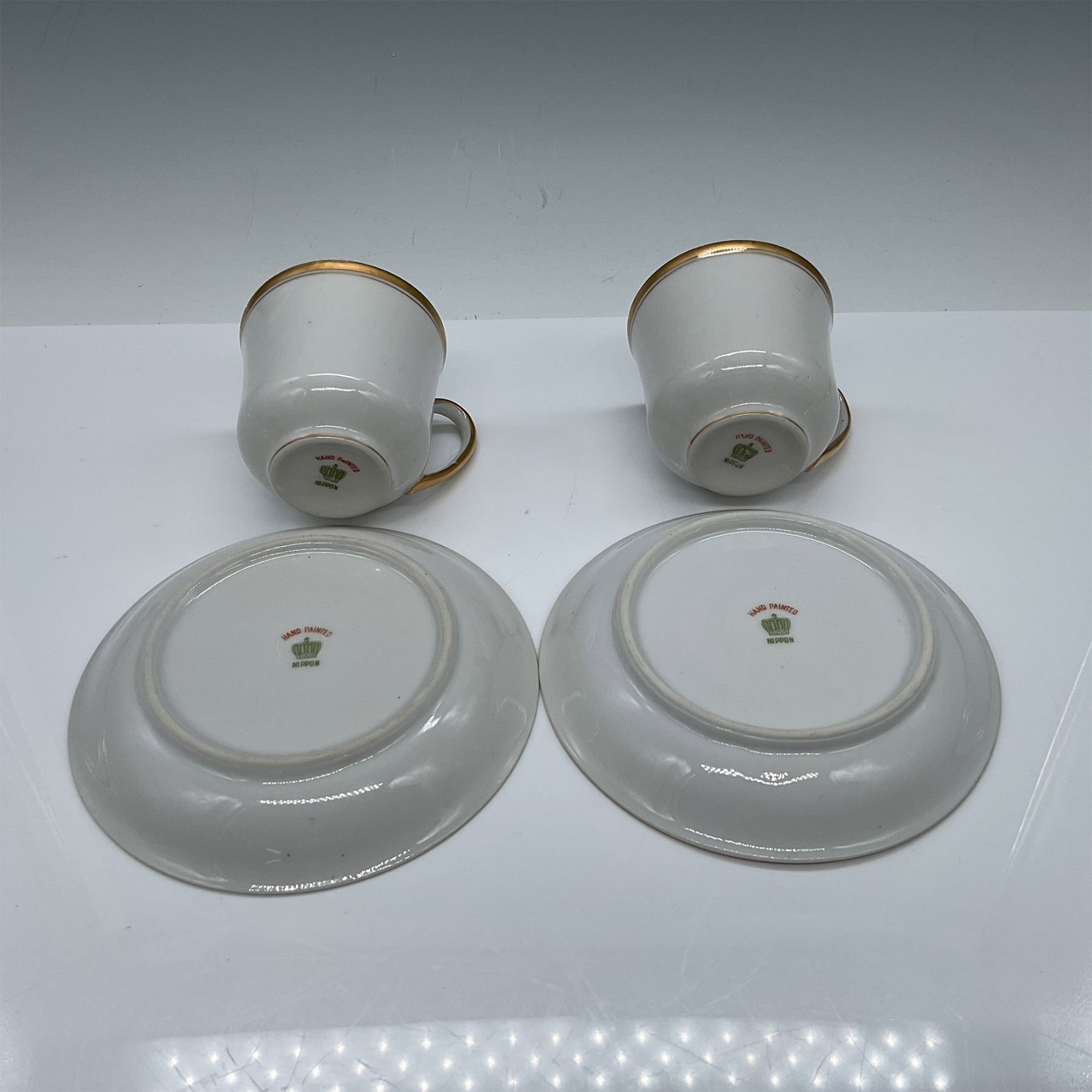 Refined 4-piece Nippon demitasse cup and saucer set featuring two demitasse cups and two matching saucers, accented with elegant gold trim. The cups measure 2.25"H, and the saucers measure 4.5" in diameter. Each piece is marked with the Nippon backstamp, signifying authenticity and fine craftsmanship. Perfect for collectors or for serving espresso in style.