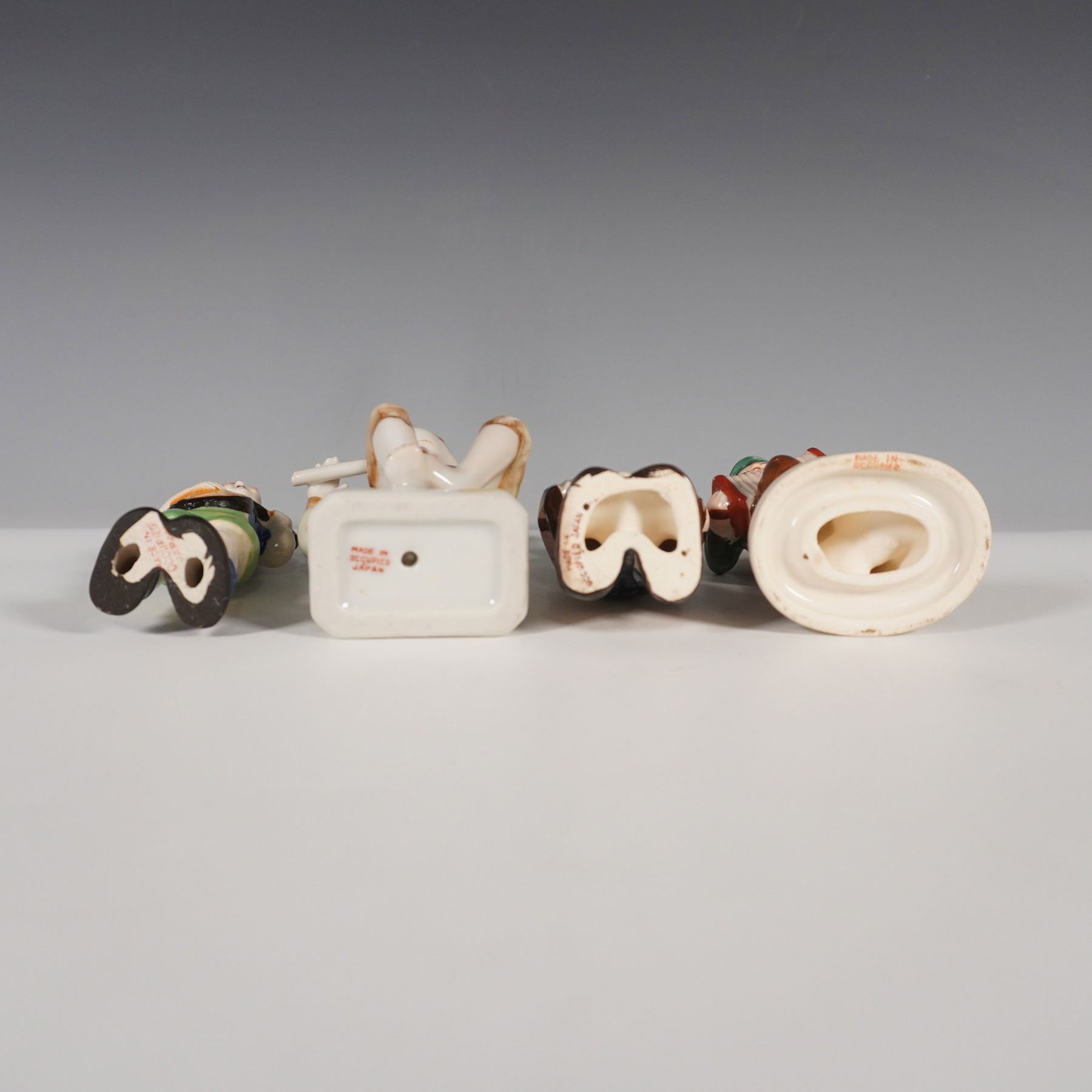 A charming collection of four vintage Occupied Japan porcelain figurines depicting musicians playing various instruments. This set includes a young boy strumming a mandolin, a seated flutist, a child playing an accordion, and another young musician with a concertina. Each figurine is hand-painted with vibrant colors and fine detailing. The pieces are stamped "Made in Occupied Japan," indicating production between 1945 and 1952, making them collectible examples of post-war Japanese porcelain craftsmanship.