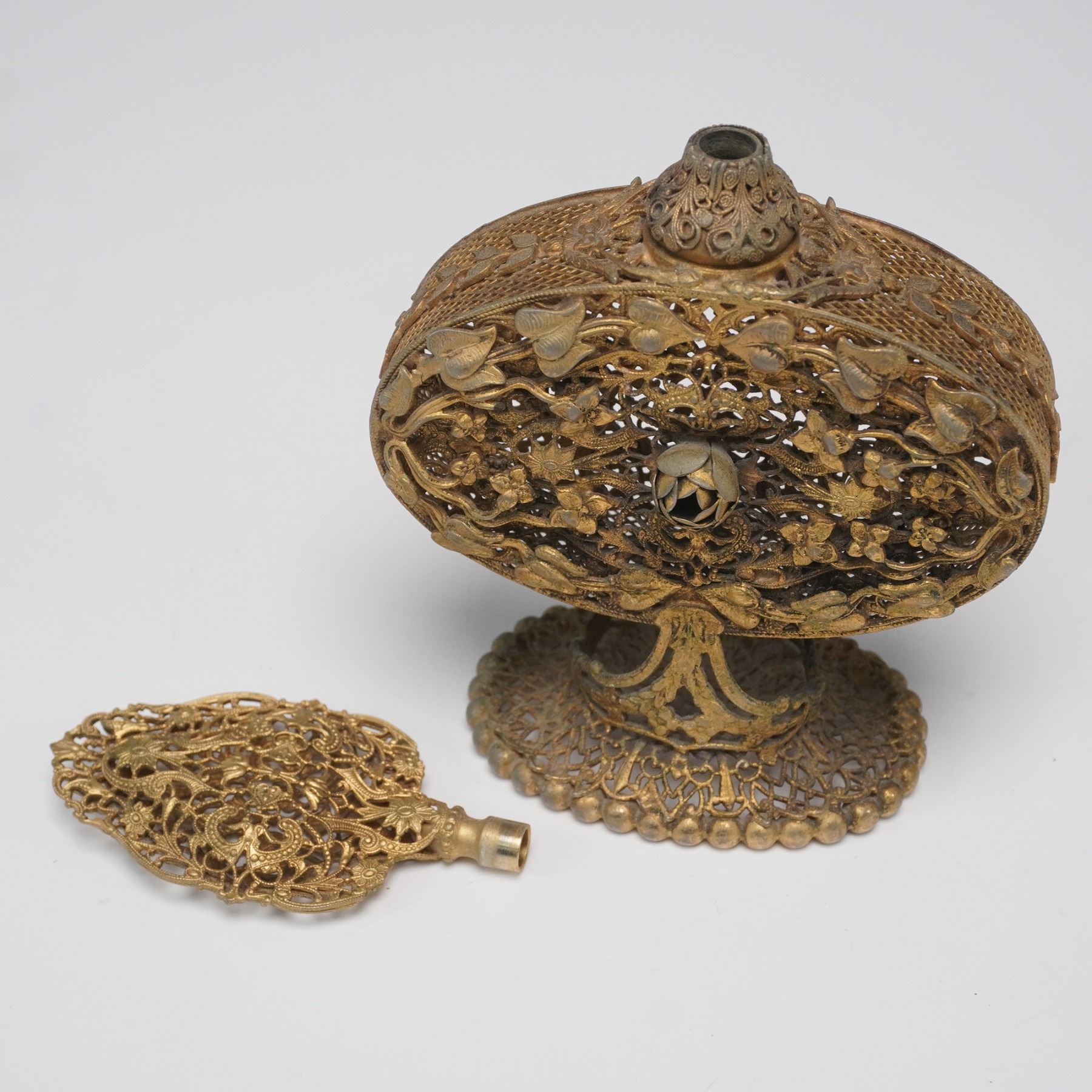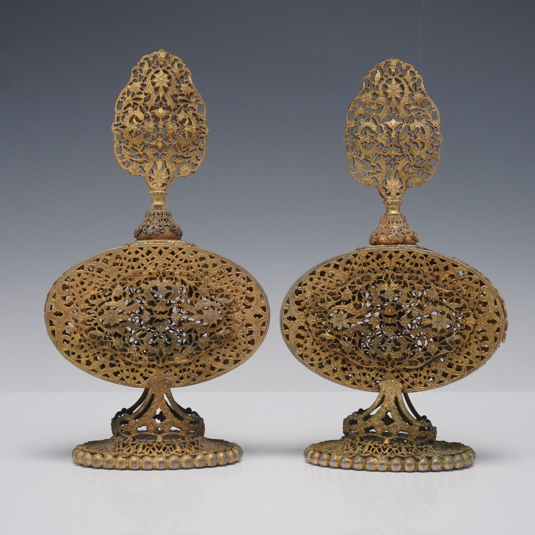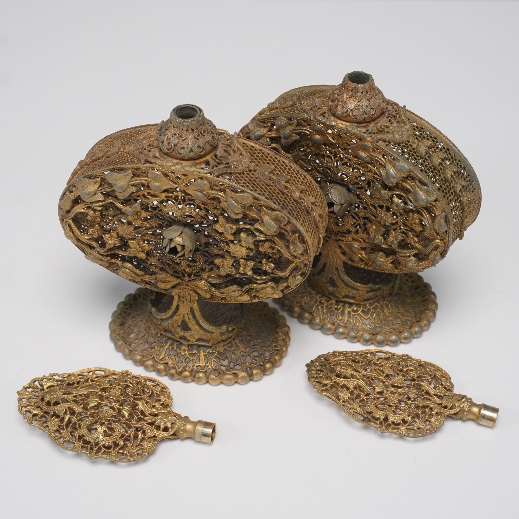 Set of two vintage gilt metal perfume bottles featuring ornate ormolu filigree with floral motifs and matching pierced stoppers. Classic Hollywood Regency vanity decor with rich patina and intricate openwork.
